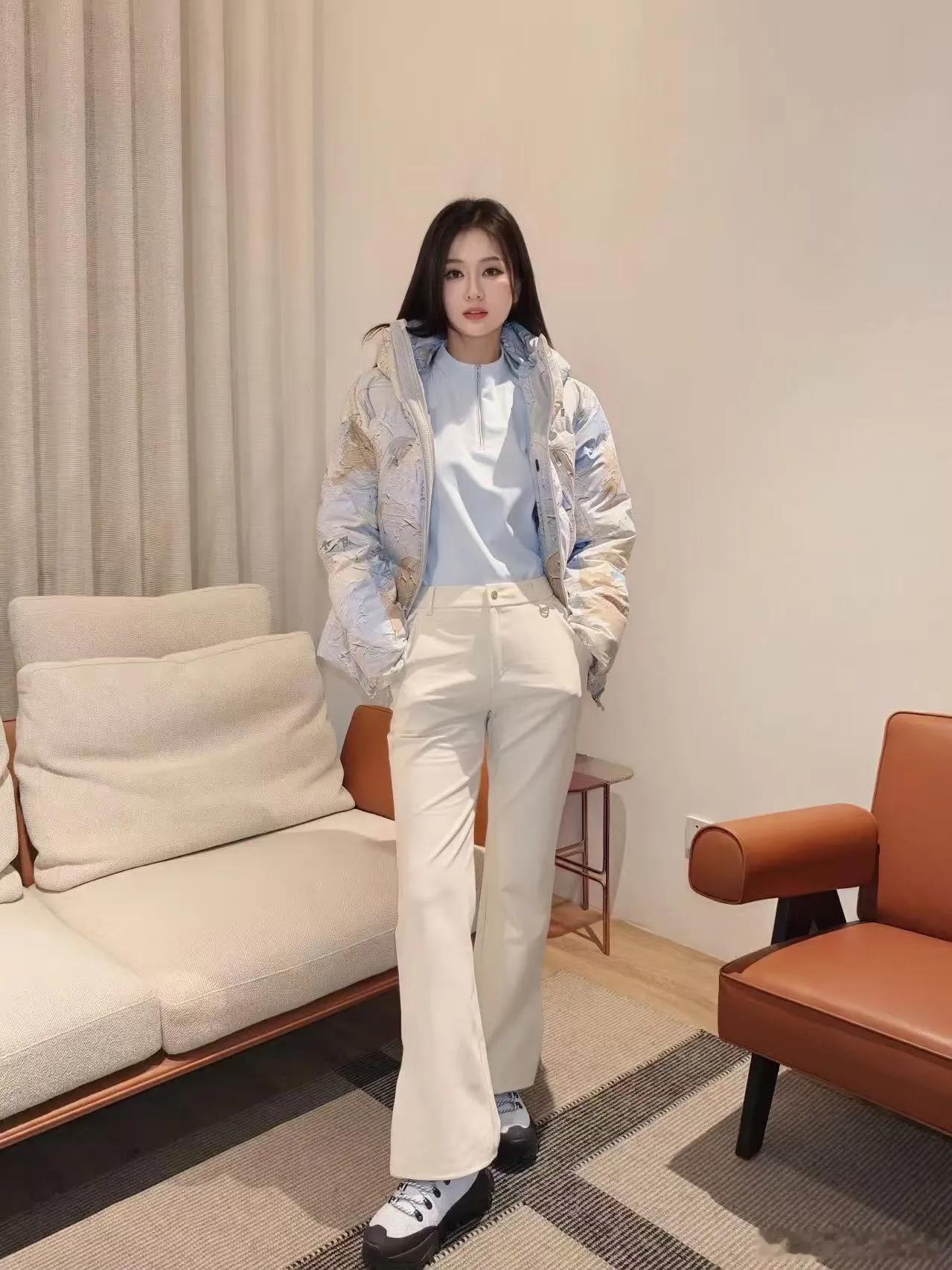 乔欣结婚后气质大变,穿蓝色印花羽绒服+直筒裤,时髦减龄又高级!