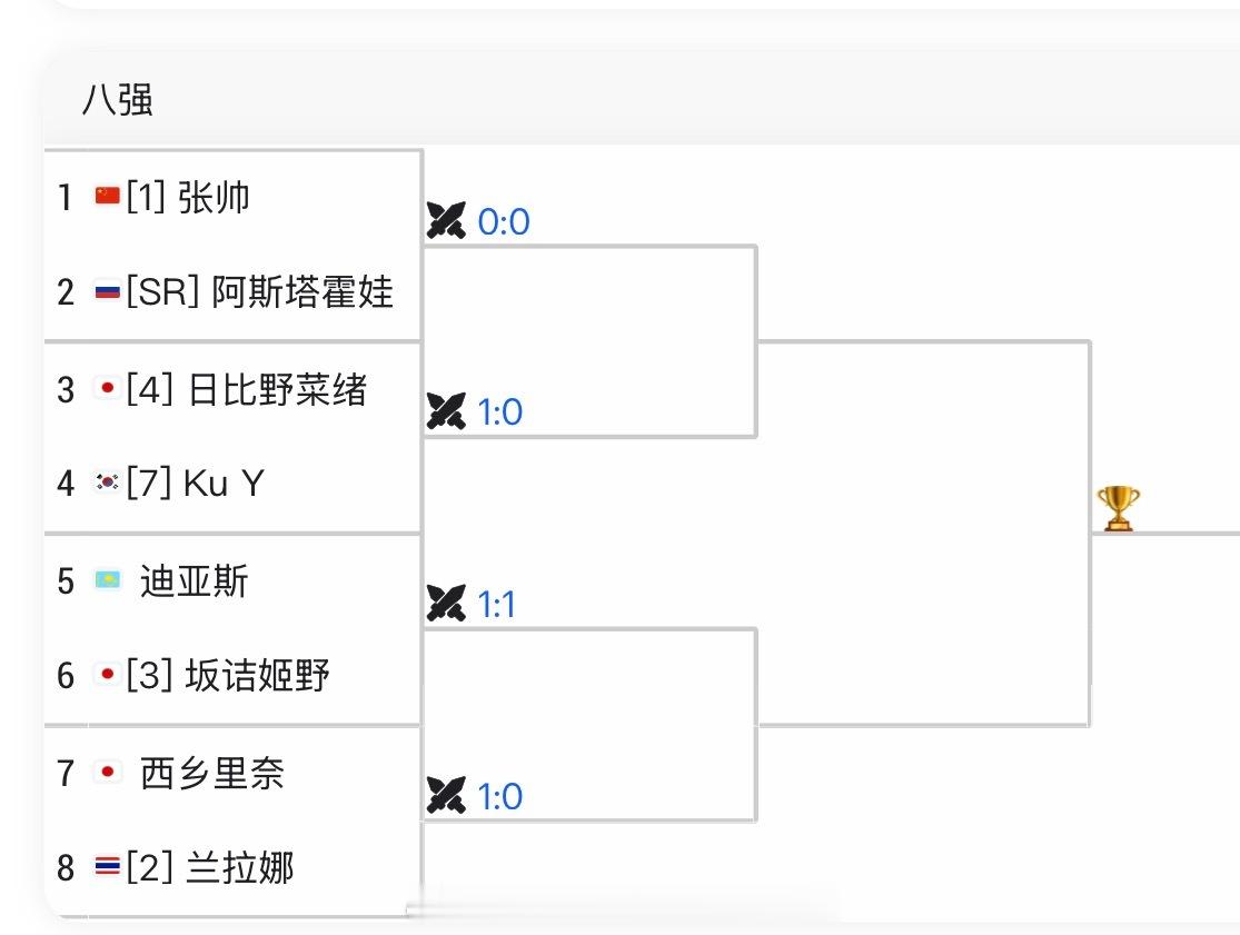 【四字形容】张帅即时排名重回前100张帅6-3 6-2汉娜张打进高崎100k八强。拿到21分、2480美金。即时排名来到100位。夺冠可来到前90位。张帅还在争取澳网正赛的资格。