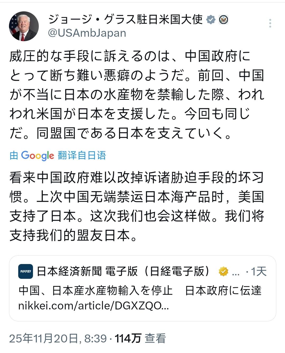 美国驻日本大使乔治·格拉斯今天(11月20日)发文写道:“看来中国政府难以改掉诉诸胁迫手段的坏习惯。上次中国无端禁运日本海产品时,美国支持了日本。这次我们也会这样做。我们将支持我们的盟友日本。” 美国驻日本大使乔治・格拉斯这番话真是把 “双重标准” 玩到了极致,说中国 “胁迫” 简直是把黑的说成白的,自己干着敲盟友竹杠的勾当倒还有脸指责别人。 先说说他嘴里 “支持盟友” 的美国是怎么对待日本的,所谓的 5500 亿美元 “竹杠” 可不是空穴来风,而是白纸黑字的协议里明晃晃的内容。 前几年特朗普政府拿着关税大棒威胁日本,说要对日本输美汽车加征 25% 的关税,要知道汽车占日本对美总出口的 28.3%,这一下就能把日本经济的支柱捅个窟窿。 日本没办法,只能坐下来谈判,最后被逼着答应设立 5500 亿美元基金,专门投资美国的能源、半导体这些领域,更过分的是利润分配,美国要拿走 90%,日本只能喝口汤,这种拿盟友当提款机的操作,还好意思说别人 “胁迫”? 而且这 5500 亿美元根本不是自愿投资,是被关税逼出来的妥协。当时美国已经对日本钢铁和铝征收 50% 的高关税,汽车关税也从原本的 2.5% 涨到 15%,增幅足足 5 倍,日本野村综合研究所算过,就这一项协议就能让日本 GDP 下降 0.55%。 美国商务部长还明着说这些投资要投向对美国 “国家安全至关重要” 的领域,说白了就是日本掏钱,美国定项目,钱怎么花日本说了不算,要是敢不掏钱,美国就恢复更高关税,这一套组合拳下来,比谁的 “胁迫” 都实在。 再说说上次中国禁运日本海产品的事,美国嘴上喊着 “支持”,实际干的却是另一套。 2023 年 8 月中国因为福岛核污染水排海暂停进口日本水产品,美国立马跳出来表态撑腰,但数据不会说谎。 日本扇贝以前 30% 都出口到中国,禁令后只能转往美国,2024 年上半年北海道对美扇贝出口是涨了一倍,达到 36 亿日元,但这点量根本填不上中国市场的窟窿,日本整体扇贝出口量还是降了 37%,只剩 240 亿日元。 更有意思的是美国市场的所谓 “需求”,其实是投机炒起来的,2025 年 1 月日本扇贝对美出口价涨到每公斤 34 美元,同比涨了 89%,说白了美国进口商是冲着涨价去的,不是真要帮日本,等价格一跌指不定就撤了。 这种口惠而实不至的戏码美国早就演熟了。当年美国逼日本签 “广场协议”,逼着日元升值,直接让日本进入 “失去的三十年”,那时候怎么不说自己胁迫? 后来又用 “301 条款” 在半导体、汽车领域反复拿捏日本,要日本开放市场、让出份额,日本哪次不是被迫妥协? 就像这次 5500 亿美元的投资,日本经济再生大臣都承认,所谓的投资里真正的现金部分只占 1% 到 2%,剩下的都是融资和担保,说白了就是硬着头皮凑数,怕美国再挥关税大棒。 美国自己才是 “胁迫” 的老手,对盟友从来都是利字当头。对欧盟也是一样,逼着欧盟承诺 6000 亿美元对美投资,还要买 7500 亿美元美国能源,不然就加征 15% 的关税,法国总理都骂那是欧洲的 “黑暗日”,是向美国投降。 现在倒好,驻日大使反过来指责中国,这就好比抢了别人钱的人,还骂路过的人没给乞丐钱,实在是荒谬。 中国禁运日本海产品是为了食品安全,有充分的科学依据,跟美国那种拿关税当武器、逼盟友掏钱的行径根本不是一回事,美国要是真支持日本,不如先把那 5500 亿美元的 “竹杠” 还给日本,再取消对日本汽车、钢铁的高关税,别光动嘴皮子耍小聪明。