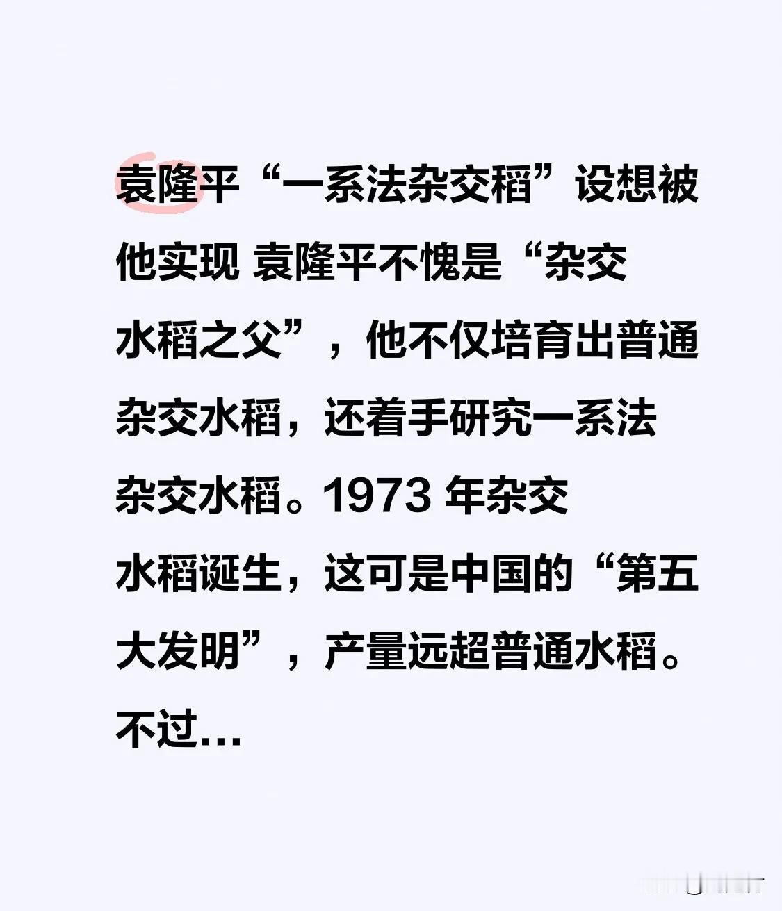 袁隆平“一系法杂交稻”设想被他实现 袁隆平不愧是“杂交水稻之父”,他不仅培育出普通杂交水稻,还着手研究一系法杂交水稻。1973 年,被誉为中国“第五大发明”的杂交水稻诞生,其产量远超普通水稻。但袁老并未满足于此,他深知杂交水稻仍有潜力,便开始探索一系法。 此前,“三系法”杂交水稻虽优势明显,但存在缺陷,袁老的研究正是为了弥补这些不足。后来,他带领团队将杂交水稻推进到两系法时代。如今,有人实现了他“一系法杂交稻”的设想,这是站在巨人肩膀上的成果,让袁老的梦想更进一步照进现实,也为解决全球粮食问题增添了新希望。