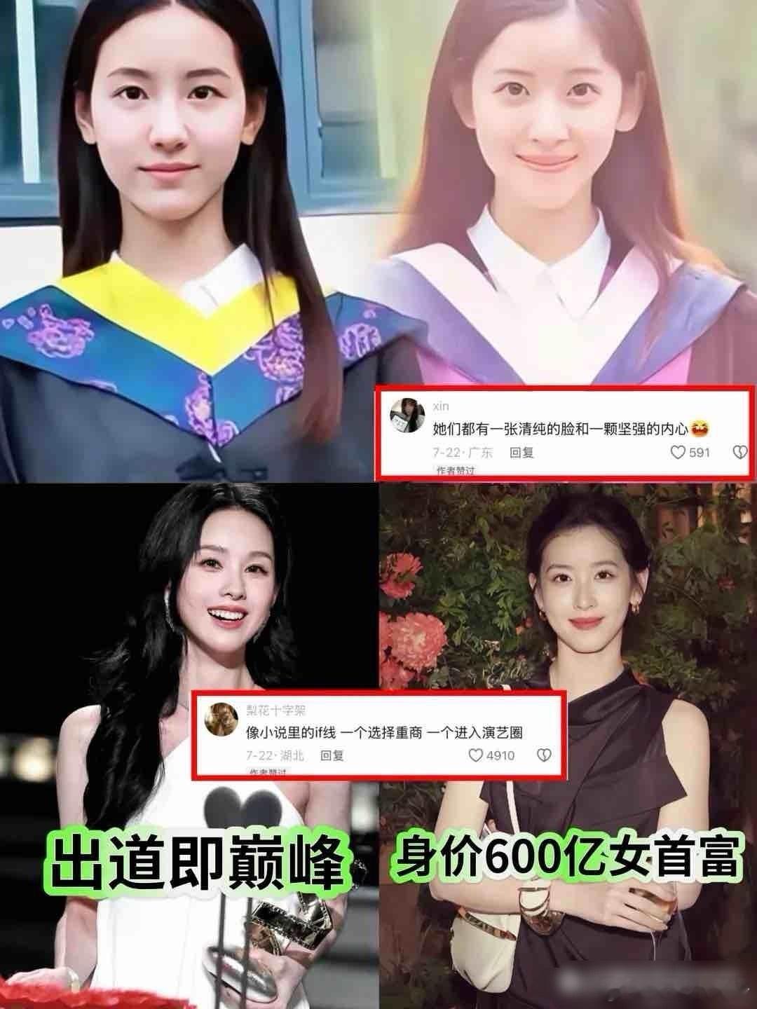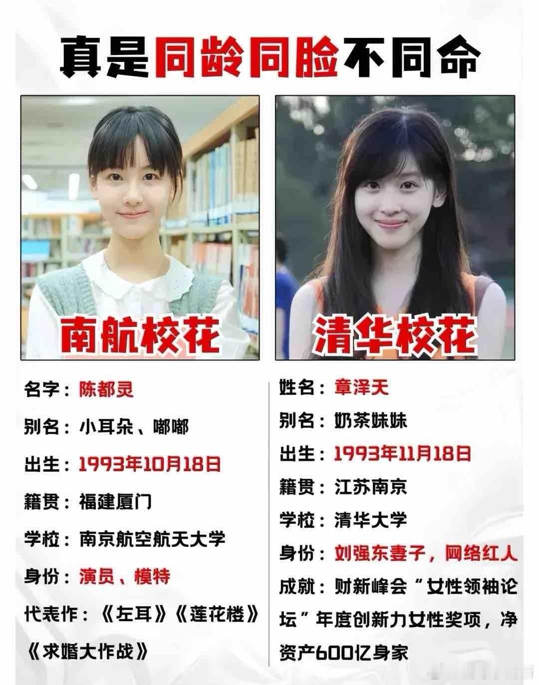 章泽天和陈都灵同脸不同命,真是平行世界的双生花!她俩真是活出了两个相反的人生我真的好磕这对!两人生日只差一个月,章泽天爸爸是南航教授,陈都灵在南航毕业,两个相貌相似的人却拥有不同的人生轨迹,宛如双生花般的对照人生,偶尔看到对方也会惊讶势均力敌的宿命感吧!