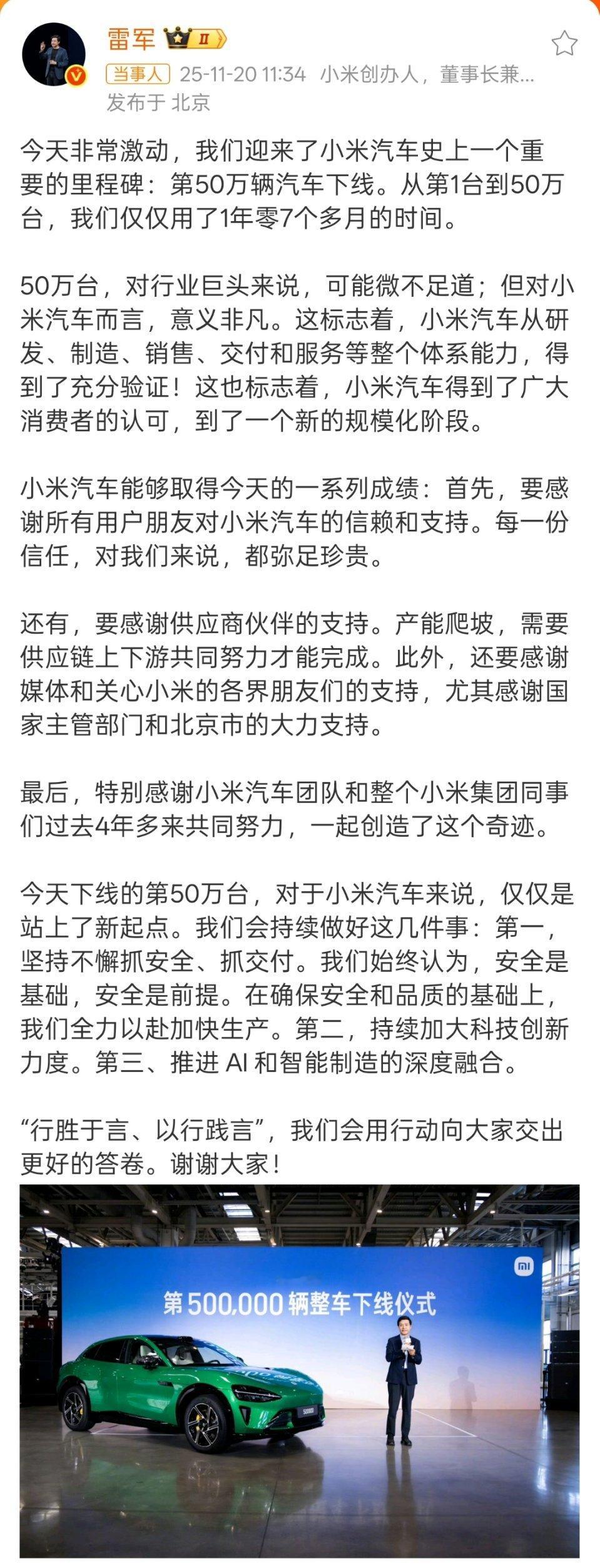 第一,抓生产和交付,再次强调安全是基础,安全是前提。第二,持续加大科技创新力度,就是增加研发投入。第三,推进AI和智能制造的深度融合,用AI技术推动制造业发展。总的来说,没有太多新东西,但是不断传播才能被人记住,估计雷军以后关于汽车的演讲都会从这三点出发了。