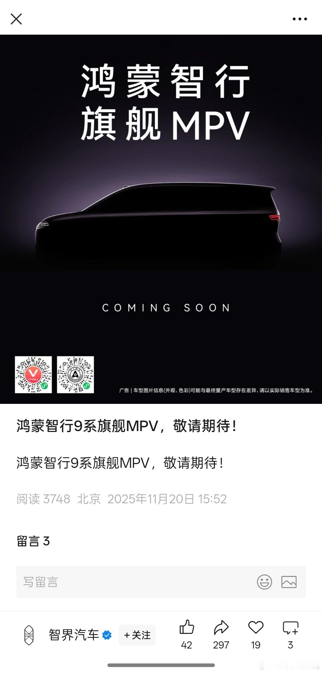 余承东正式官宣了鸿蒙智行会推出一款旗舰MPV车型。这应该是智界品牌的一款旗舰MPV车型。谍照图的整个前灯组更像是智界的圆润风格,特别是尾灯像是智界的贯穿式灯组。同时新车的轮廓非常的规整,在常规MPV的造型下有比较圆润的元素。整个尾部是比较的平整垂直,没有追求低风阻的设计,走的是传统MPV样式。这样的造型一是可以带来更好的空间,二是整个的造型印象上也更符合普罗大众对MPV的观感。另外可以看到新车会带车顶的激光雷达。估计这款智界MPV车型会在明年第一季度正式亮相推出,作为明年智界品牌的一个重要的产品。看来明年的MPV市场又要重新洗牌了。