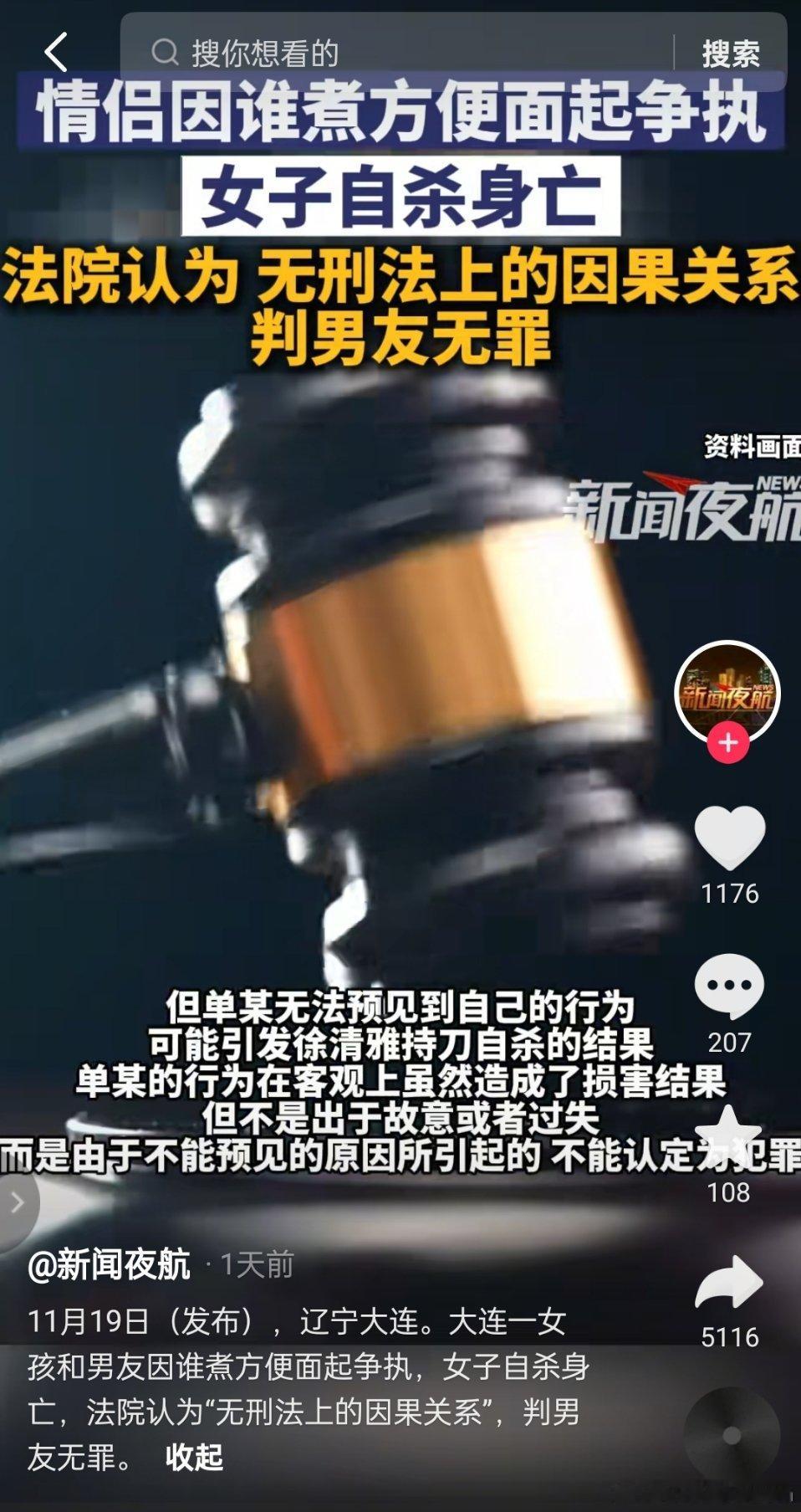 情侣因谁煮方便面起争执,女子自杀身亡,法院认为,无刑法上的因果关系,判男友无罪。