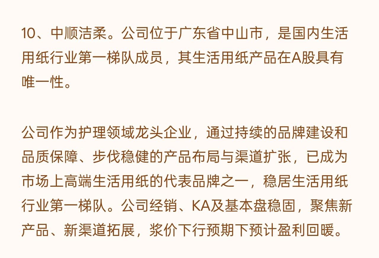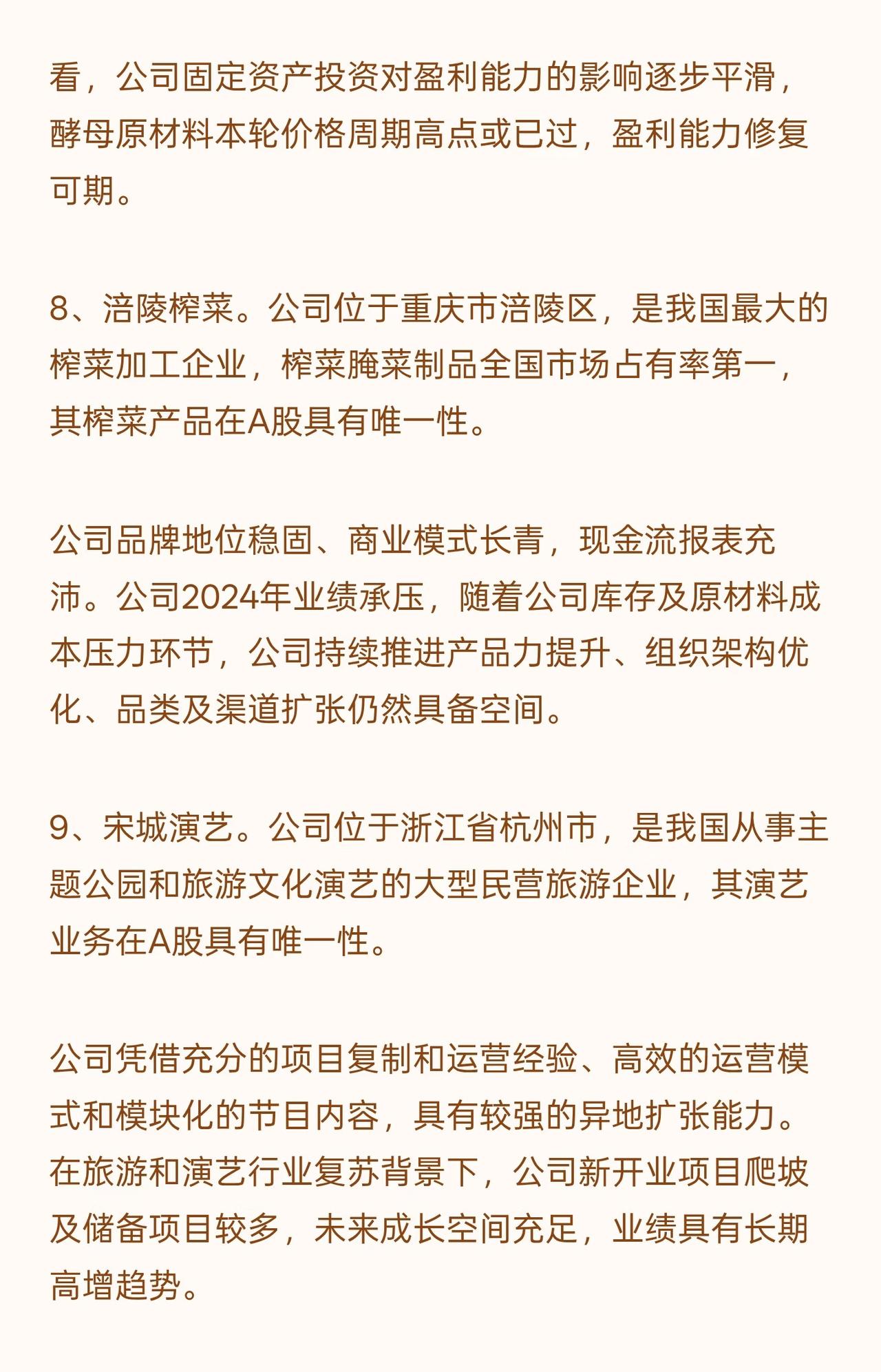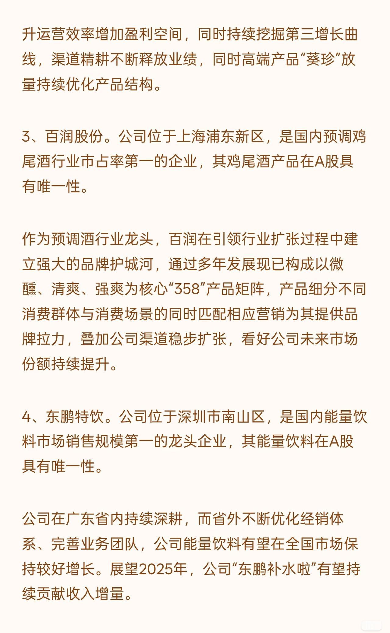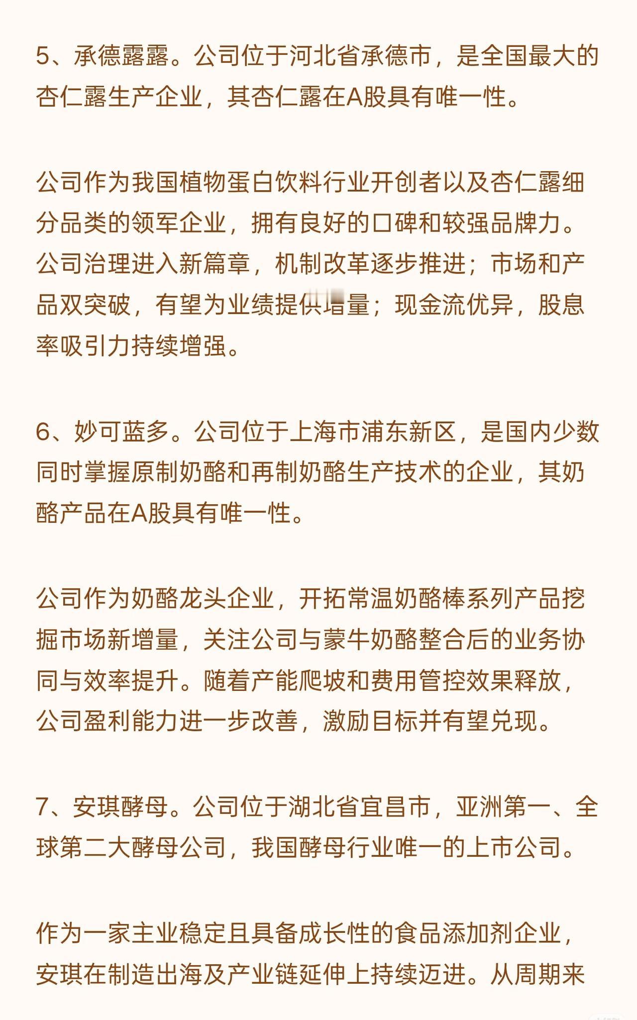A股市场中10家在各自细分消费领域具有“唯一性”的优质龙头企业,涵盖食品饮料、家庭个人护理及文旅演艺等多个细分赛道,具体如下: 1. 贵州茅台(贵州省遵义市):中国白酒行业第一龙头,酱香型高端白酒具有唯一性。凭借强大品牌力、优质产品力及市场化渠道改革,成为行业标杆,产品组合灵活,抗周期能力强,具备稳健穿越周期的潜力。 2. 洽洽食品(安徽省合肥市):我国坚果炒货行业领军企业,葵花子业务在A股具有唯一性。坚持品质导向,运营效率与产品结构持续优化,通过挖掘新增长点提升盈利能力。 3. 百润股份(上海浦东新区):国内预调鸡尾酒行业市占率第一,鸡尾酒产品在A股具有唯一性。构建了以“微醺”“清爽”“强爽”为核心的“358”产品矩阵,精准定位不同消费群体与场景,渠道稳步扩张,市场份额有望持续提升。 4. 东鹏特饮(深圳市南山区):国内能量饮料市场规模第一的龙头,能量饮料在A股具有唯一性。深耕广东市场,同时优化省外经销体系与团队,2025年“东鹏补水啦”预计持续贡献增量,全国增长前景良好。 5. 承德露露(河北省承德市):全国最大杏仁露生产企业,杏仁露在A股具有唯一性。作为植物蛋白饮料开创者及杏仁露细分领域领军企业,品牌力强,公司治理与机制改革推进中,市场与产品双突破有望带动业绩增量,现金流优异,股息率吸引力强。 6. 妙可蓝多(上海市浦东新区):国内少数同时掌握原制与再制奶酪生产技术的企业,奶酪产品在A股具有唯一性。作为奶酪龙头,开拓常温奶酪棒系列挖掘新增量,产能与费用管控改善盈利,与蒙牛整合后协同与效率提升值得期待。 7. 安琪酵母(湖北省宜昌市):亚洲第一、全球第二大酵母公司,我国酵母行业唯一上市公司。主业稳定且具成长性,持续推进制造出海与产业链延伸,周期性影响逐步平滑,盈利能力修复可期。 8. 涪陵榨菜(重庆市涪陵区):国内最大榨菜加工企业,榨菜腌菜制品全国市占率第一,产品在A股具有唯一性。品牌地位稳固、商业模式成熟,2024年虽业绩承压,但随库存及成本压力缓解,产品力、组织架构及品类渠道扩张仍具提升空间。 9. 宋城演艺(浙江省杭州市):大型民营旅游企业,专注主题公园与旅游文化演艺,演艺业务在A股具有唯一性。凭借项目复制能力与高效运营模式,异地扩张能力强,行业复苏背景下新项目爬坡及储备丰富,成长空间充足,业绩有望长期高增。 10. 中顺洁柔(广东省中山市):国内生活用纸行业领先企业,定位护理领域龙头,是高端生活用纸代表品牌之一,稳居行业第一梯队。依托稳固的经销网络、KA渠道及核心业务基础,积极拓展新产品与新渠道;在木浆价格预期下行背景下,盈利能力有望改善回暖。 整体来看,这10家企业均在其细分消费领域占据A股唯一或主导地位,具备品牌、技术、市场或模式上的独特优势,且在品牌力、产品力、渠道运营或战略布局上展现出较强的竞争力与增长潜力,属于消费板块中具有“唯一性”的优质龙头标的。