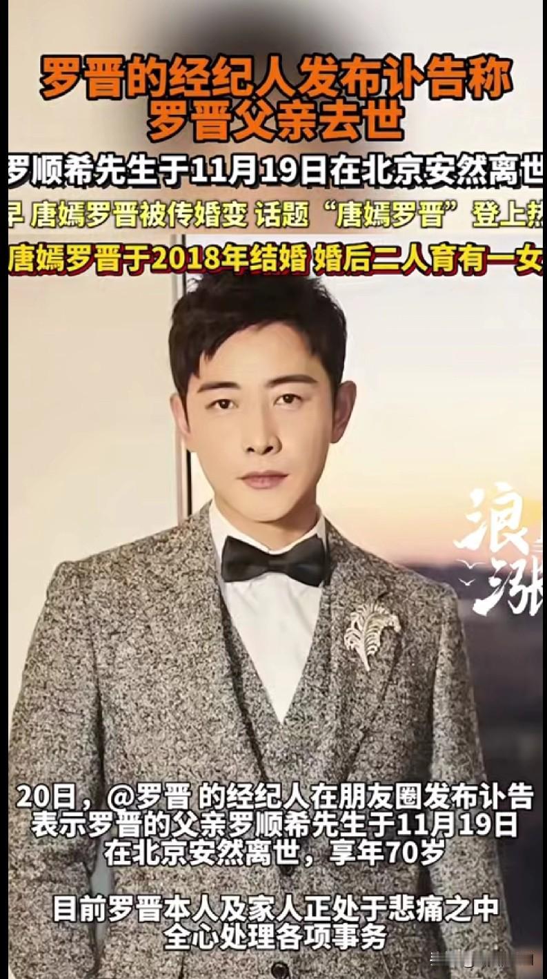 刚看到这消息,心里一下沉了——罗晋的爸爸罗顺希先生19号在北京走了,享年70岁,经纪人发了讣告,现在他和家人都在忙后事,肯定特别难受。 之前刚传他俩婚变,现在又遇上这事儿,估计罗晋这段时间压力得多大啊。想起他平时荧幕上挺温和的,私下里肯定是个孝顺儿子,这时候最需要的就是安静。 生老病死是最熬人的坎儿,希望他和唐嫣能互相撑着,也别被外面的声音打扰,好好送叔叔最后一程。 咱们就安静送个祝福吧,愿罗爸爸一路走好,罗晋和家人能慢慢缓过来。