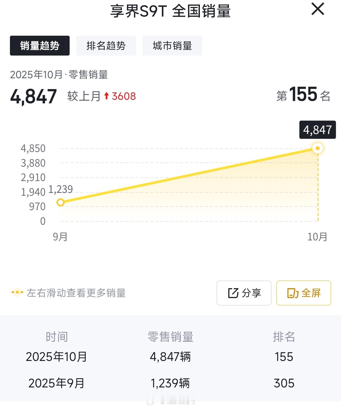 享界S9T上市66天,大定突破3万台。9月交付1239台,10月交付4847台,