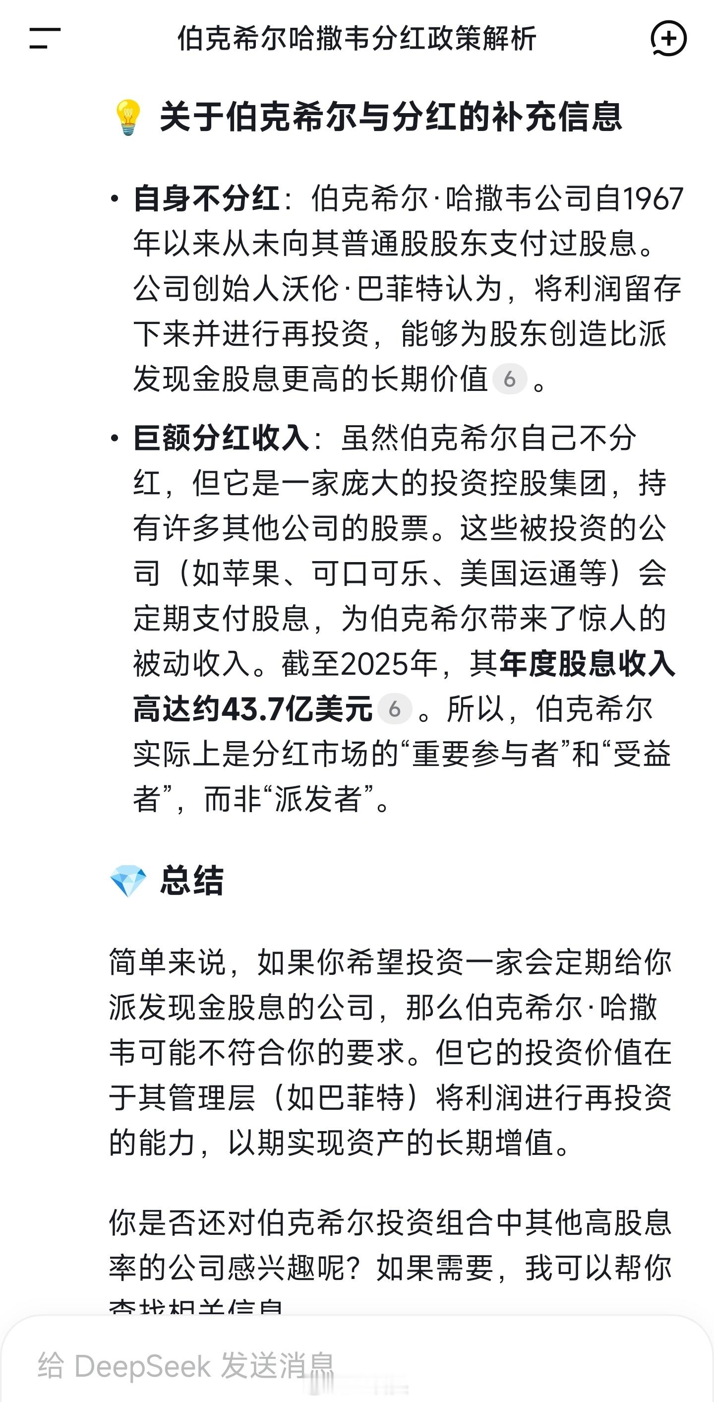 “小米2018年上市至今,0分红。建议小米公司今年拿出100亿利润分红。 ”伯克希尔·哈撒韦公司自1967年以来从未向其普通股股东支付过股息。公司创始人沃伦·巴菲特认为,将利润留存下来并进行再投资,能够为股东创造比派发现金股息更高的长期价值。·截至2025年,其年度股息收入高达约43.7亿美元。所以,伯克希尔实际上是分红市场的“重要参与者”和“受益者”,而非“派发者”。简单来说,如果你希望投资一家会定期给你派发现金股息的公司,那么伯克希尔·哈撒韦可能不符合你的要求。但它的投资价值在于其管理层(如巴菲特)将利润进行再投资的能力,以期实现资产的长期增值。