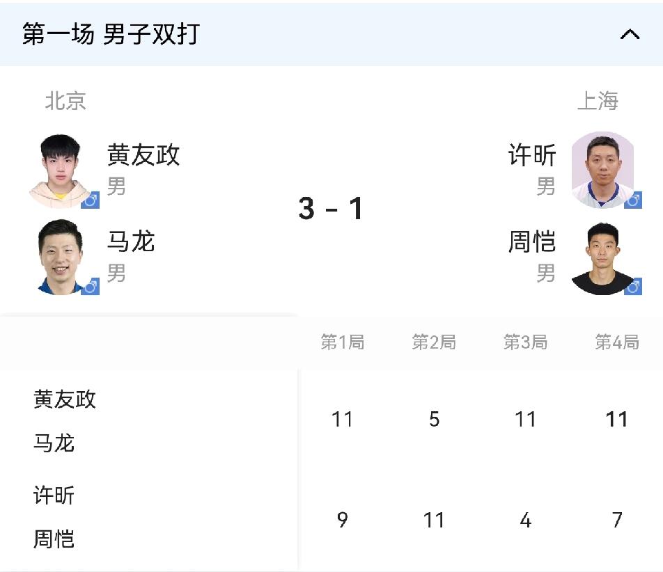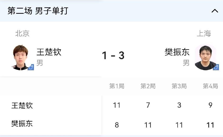 还真是一物降一物,王楚钦的打法被樊振东克制住了!王楚钦怎么打,都能被樊振东挡回来,接着樊振东一个变线,这一分就拿下了! 这样的话,就看马龙的了! 北京-上海 马龙/黄友政3-1许昕/周恺 王楚钦1-3樊振东 马龙1-0周恺