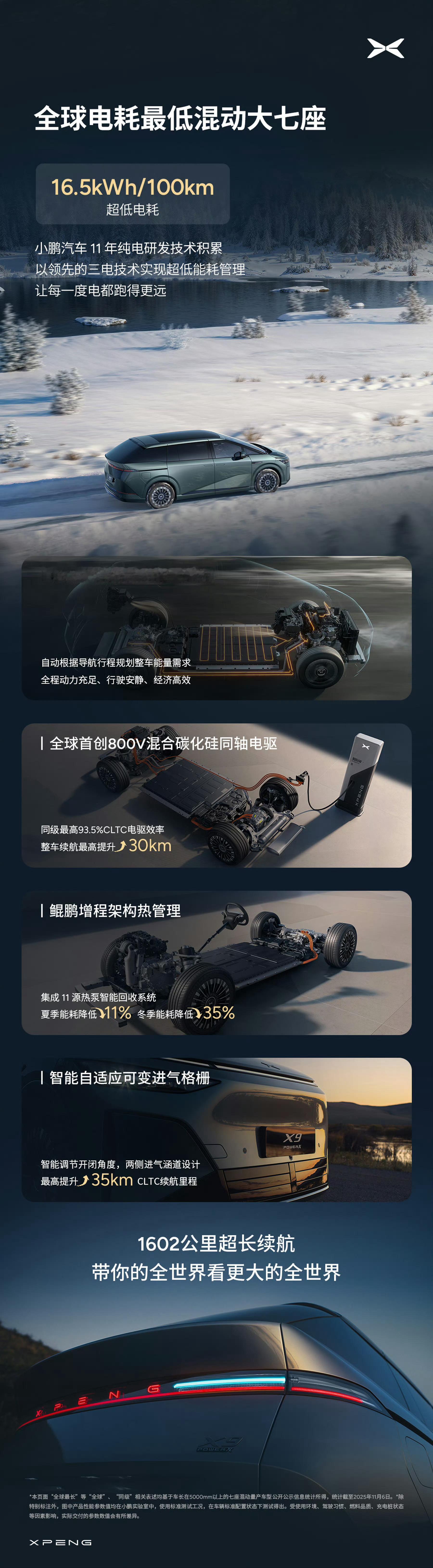 小鹏X9续航这么猛?30 多个小时不停歇的 “续航马拉松”竟然跑了 2022 公里,比官方说的 1602 公里还多了一大截,这什么概念?要是开去自驾游,从广州到上海单程都不用加油加电。第三代高效增程器热效率超 45%,搭配 800V 高压平台与 AI 智能能耗管理,动力给足的同时还能把消耗控到极致。再加上 63.3 度大电池 + 60 升油箱的黄金组合,平时上下班纯电开,一周充一次就够;增程模式也特省油,高速百公里油耗才 6 个多,比不少家用轿车还省。而且空间大到离谱,一家 7 口坐满也不挤。有一说一,小鹏汽车是最懂用户需求的那个,从来不搞花了呼哨的噱头,把续航、空间、舒适性这些核心痛点做到了极致,这也才是家用车该有的样子,今晚19:00发布,感兴趣的童鞋可以蹲一波~