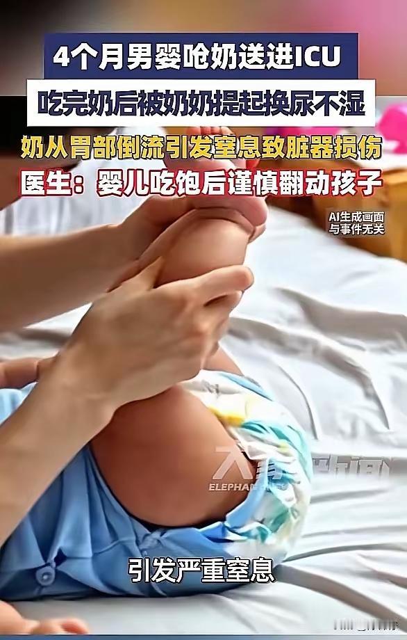 河南郑州4个月大的男婴,宝宝刚吃完奶,奶奶想着顺手换个尿不湿,就把娃的小腿拎起来,结果胃里的奶液直接倒流出来,宝宝当场呛奶引发窒息,鼻子嘴巴里全是奶渍。 虽然抢救回来了,但是脑部、心脏都严重受损。 网友评论: 换个尿不湿,要把孩子倒着拎起来。你干啥也不能把他倒着拎起来呀,除非是治疗时医生操作。这奶奶是咋想的呀?是不是人老了,脑子糊涂了? 别让老人带孩子,有的老人年纪大了,脑子不行了。做事一搭有一搭没一搭的,有时候脑子清醒,有时候脑子不清醒的。 我一个大男人都知道小孩吃完奶要抱着给孩子拍拍后背排气,居然还倒提着,以为孩子是小动物吗? 我也是自己生了孩子才知道自己和老公能相遇结婚再生子,都是天意。都活下来了,才有后来的一切。她们是真啥也不能传授给我啊!全靠自己摸索!
