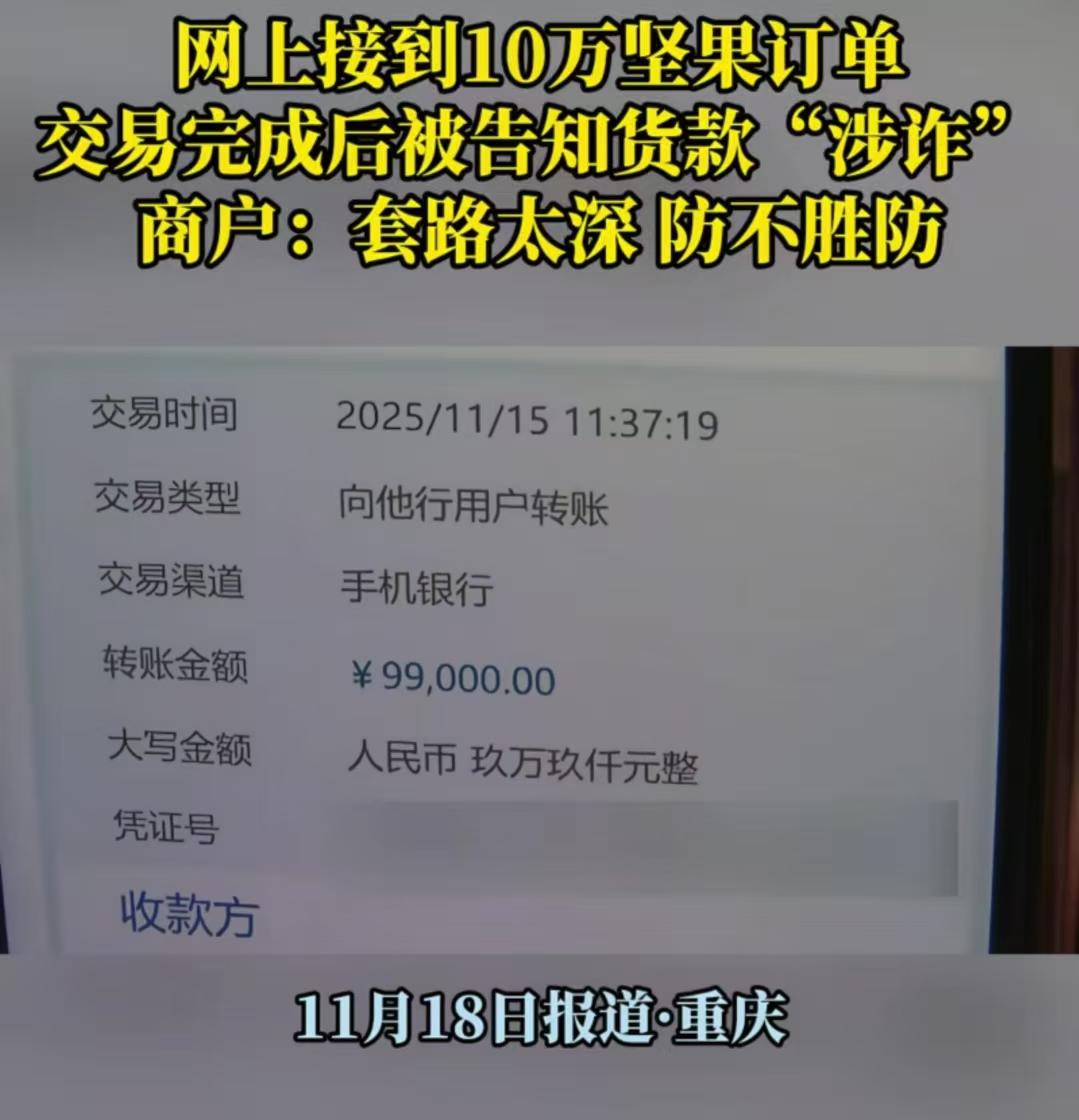 “我怎么知道他钱干净不干净?”重庆,女子在网上接到 10 万坚果订单,对方付钱后就让货拉拉把货运走,可她还来不及高兴,几个小时后银行卡就被冻结了,警方说女子收到的货款是涉诈资金!女子:“我就正常做生意,货没了,钱没了,我冤不冤?” 唐女士和父母一直做着坚果批发生意,他们家向来都是一手交钱一手交货。像货被拉走、银行卡还被冻结这种事儿,他们还是头一回碰到。 事情得从11月13号说起。有个网名叫“淡泊明志”的人加了唐女士好友,说自己要批发几十件坚果。 唐女士一看,这可是笔大生意,心里顿时激动起来,便耐心地给对方介绍自家的货物。 对方并没有马上就下单,而是让唐女士先寄样品看看货。唐女士见对方好像挺懂行的,也没多想,就把样品寄了过去。 对方收到样品后,说货没问题,要进货,还直接跟唐女士要了银行卡号,转了99000元过来。 钱到账后,唐女士特别开心,一点都没起疑心,马上就把货物准备好了。 对方称自己没空来取货,叫了个货拉拉司机来运货。唐女士核对了司机的车牌,把货物装上了车,还拍了照,然后就让司机把货拉走了。 唐女士正沉浸在做成一笔大单的喜悦中,可几小时后,她用来收款的银行卡却被外地警方冻结了。 警方告知她,她收到的是涉诈资金。原来,那个来买坚果的人根本不是什么进货的商户,而是个骗子。 他们骗了一个受害者,让受害者把钱直接转到唐女士的银行卡里,骗唐女士说是他们转的进货的钱。 唐女士收到钱后就把货给了骗子,骗子拿到货后转手就卖掉变现了。 这样一来,钱没经过骗子的账户,警方追踪骗子的线索就变得困难了。 而货拉拉司机的卸货地点在一个马路边,线索又断了。 唐女士都被这事儿弄懵了。现在正是坚果销售旺季,做批发一般都是几十件几十件地发货,而且对方在交易前的表现也没什么不合常理的地方。 她觉得要是问人家钱是哪儿来的,会很尴尬,别人也不会和你说,所以问了也是白问。 如今,大笔货款被冻结,生意的资金周转都成了问题,她心里觉得特别冤枉。 而且,不止唐女士一个人遭遇了这种事。她在市场上打听了一圈,发现遭遇类似情况的商户已经有七八家了,涉及的资金将近百万元。 目前,商户们都在等警方的调查结果,他们也想通过媒体提醒同行们,一定要提防类似的套路,免得惹上麻烦。 警方在打击诈骗犯罪时面临追踪困难的问题,可这不能成为让无辜商家承担损失的理由。 相关部门应该进一步加强对资金流向的监管和预警机制,不能让商家在毫不知情的情况下成为诈骗链条中的“背锅侠”。 商家们也得提高警惕,不能仅仅因为怕尴尬就放弃对资金安全的基本审查,大单生意转转,一定要签订合同,要求购货人本人银行卡转账,毕竟生意场上,资金安全永远是第一位的。 信息来源|重庆天天 630