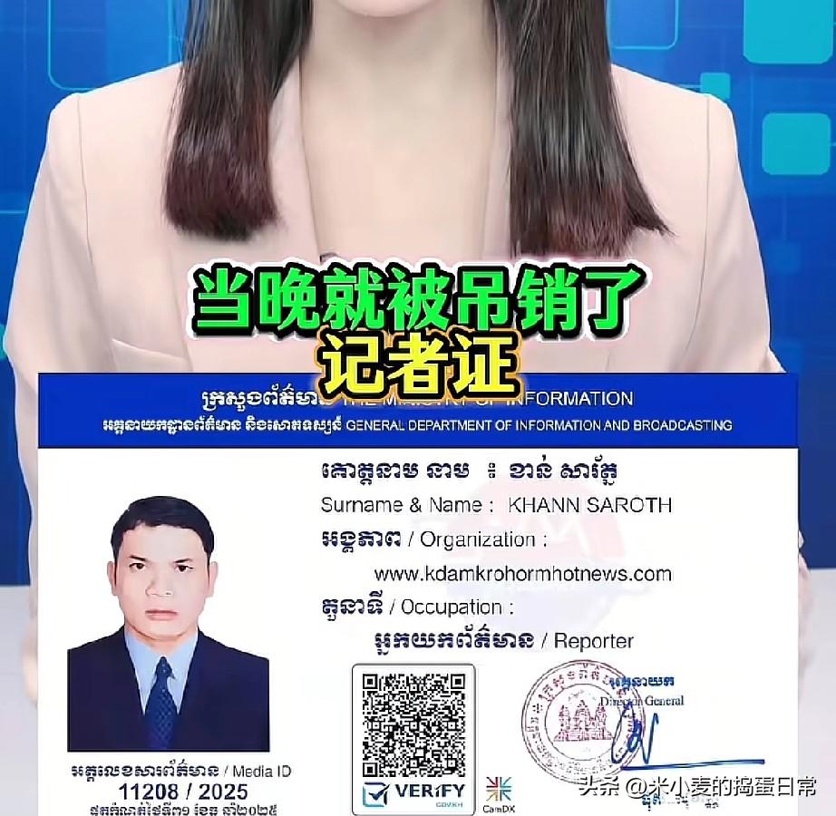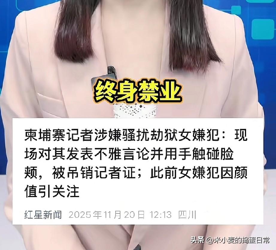 柬埔寨记者对劫狱女嫌犯动手,被终身禁业 今天这事儿太魔幻了——柬埔寨一记者跑现场,对着那因颜值出圈的劫狱女嫌犯,不光嘴上飙黄腔,还上手摸人脸颊! 就这操作,当晚记者证直接被撕,官方拍板“终身禁业”。这哪是跑新闻?纯纯是把职业底线当废纸踩啊! 你说这女嫌犯是犯罪了,但她首先是人吧?记者拿着话筒,不是让你耍流氓的啊!这波处罚够不够狠?有人说“活该,不守规矩就该滚”,但也有人嘀咕“终身禁业是不是太重了?” 咱就说:要是连基本的尊重都没有,这碗饭你配端吗?