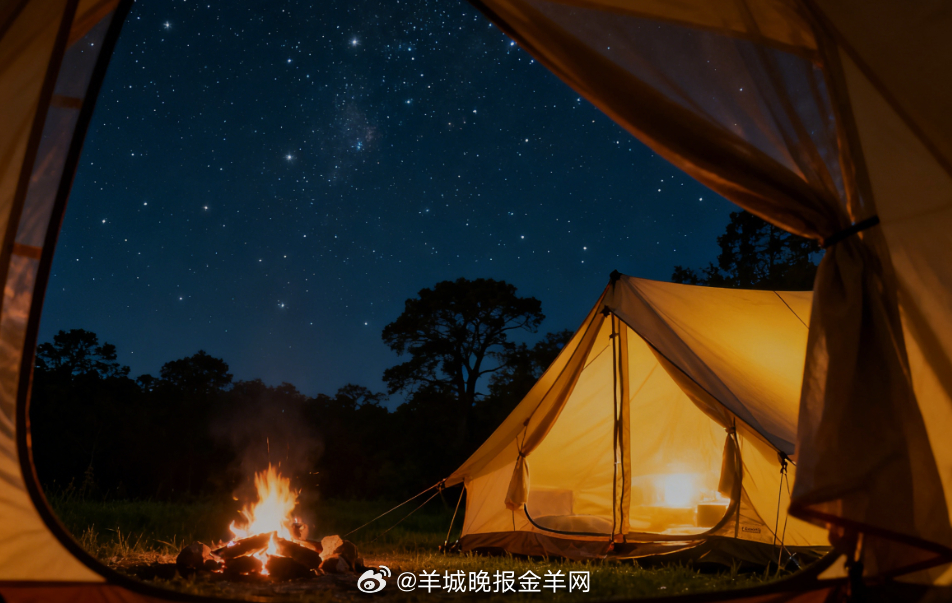 帐篷内透出暖黄灯光,从帐篷窗户向外望去,夜空中繁星点点,帐篷外篝火余烬泛着微光