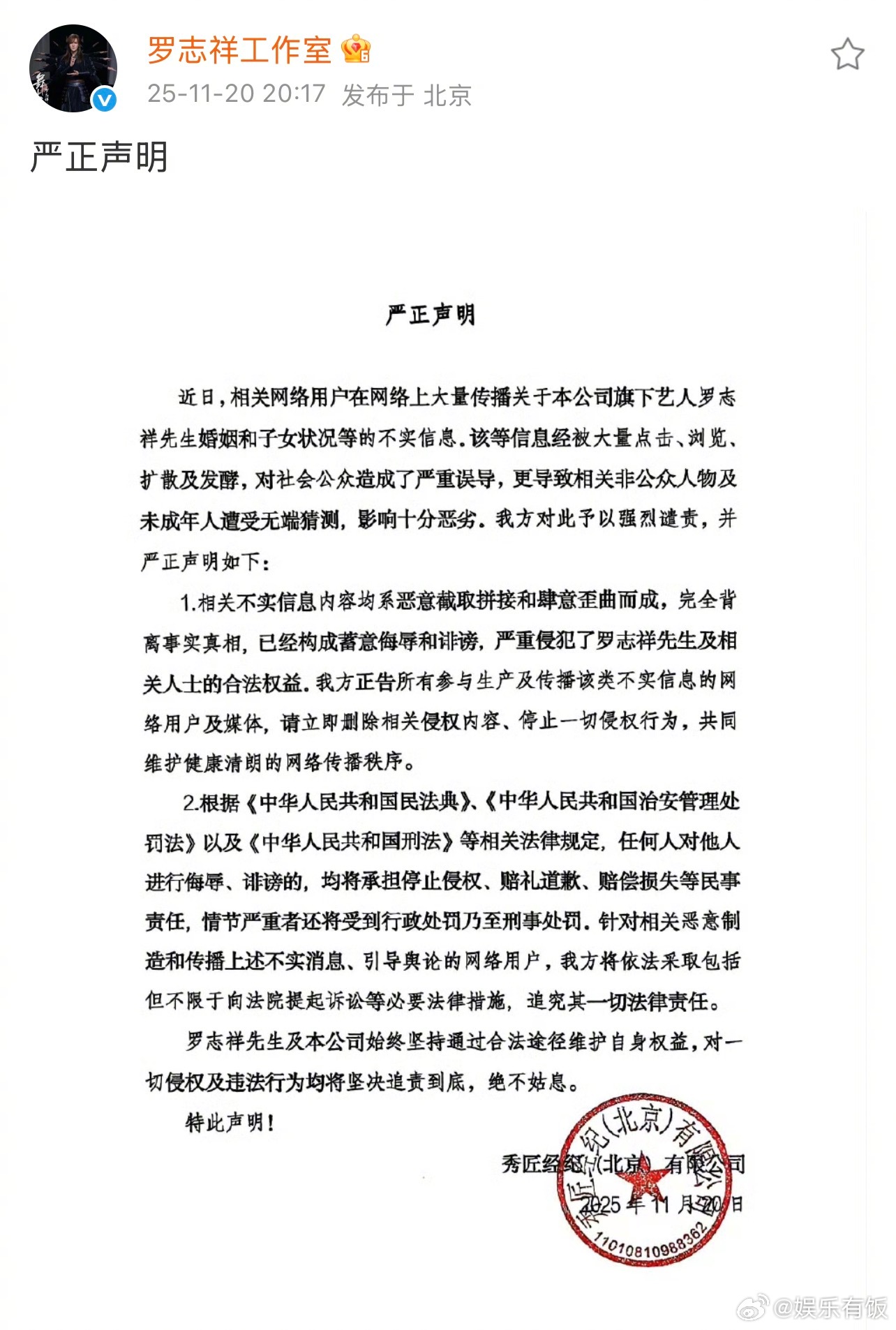 20日, 发布严正声明,针对近期网络上传播的关于罗志祥婚姻、子女状况的不实信息作出回应。声明称,近期关于罗志祥婚姻和子女状况的相关内容系“恶意截取拼接、肆意歪曲”,要求涉事网络用户、媒体立即删除侵权内容,并将采取包括诉讼在内的法律措施。