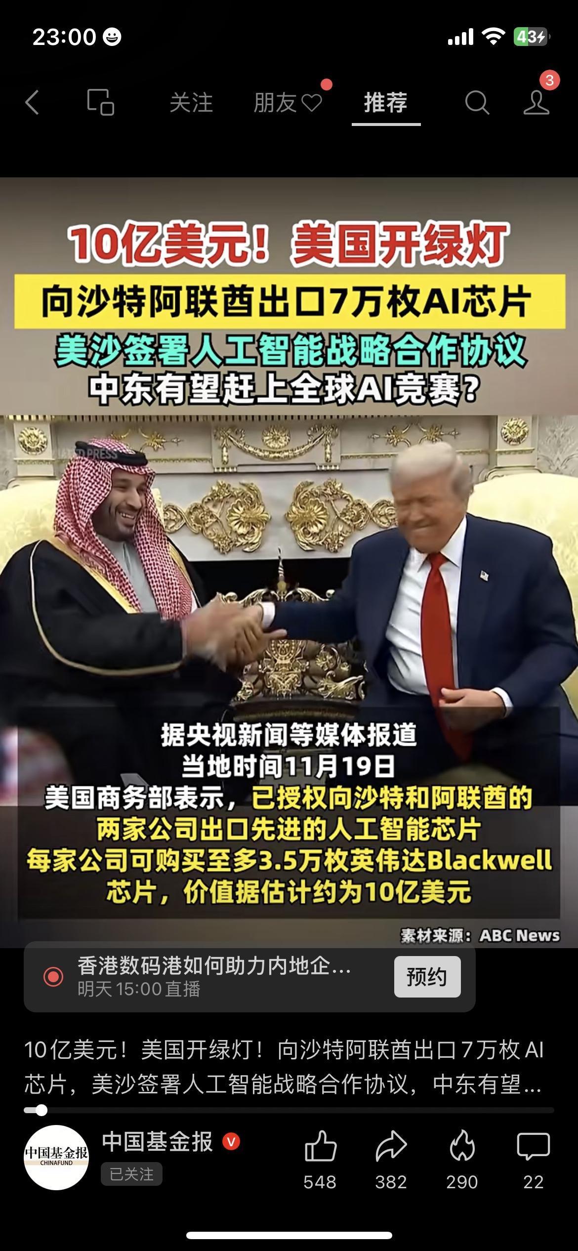 10亿美刀!美国给中东开绿灯:7万枚AI芯片+美沙签协议,这是要让中东成AI新战场? 家人们,刚刷到个炸锅的事儿!美国商务部昨天突然松口,直接给沙特、阿联酋的两家公司发了“通行证”——每家能买3.5万枚英伟达Blackwell芯片,加起来7万枚,光这波就值10亿美金! 更狠的是,同一天美沙直接签了人工智能战略合作协议!啥概念?沙特的Humain公司(王储亲自站台,PIF主权基金砸了1万亿美金的主)当场放话:未来三年要在沙特+美国部署英伟达的AI基建,还要买60万枚芯片!马斯克的xAI都掺和进来了,要在沙特建500兆瓦的巨型数据中心,这规模快赶上OpenAI和微软的“星际之门”了! 你们可能没概念:Blackwell芯片是现在最顶的AI处理器,比之前的H100快30倍,能耗降25倍。之前美国连盟友都卡着不卖,现在直接给中东放这么多?沙特这是揣着石油钱,要从“卖油”转成“卖算力”啊——他们那电费便宜到离谱,建数据中心成本比其他国家低30%,这波拿到芯片,估计很快就能抢全球AI算力的生意! 不过我瞅着也有意思:美国一边卡别人,一边给中东开绿灯,是想把中东绑到自己的AI阵营里?还是看上了沙特那1万亿的主权基金? 你们觉得这波操作,是让中东真能追上全球AI竞赛,还是美国的“技术绑定”套路?评论区赌五毛,说说你们的看法! AI芯片 美沙合作 全球科技 AI竞赛