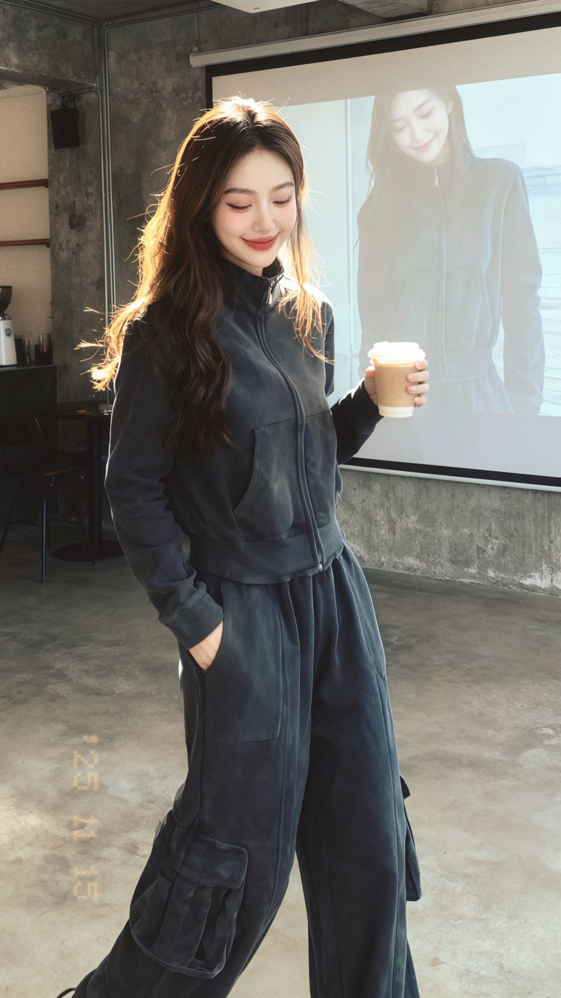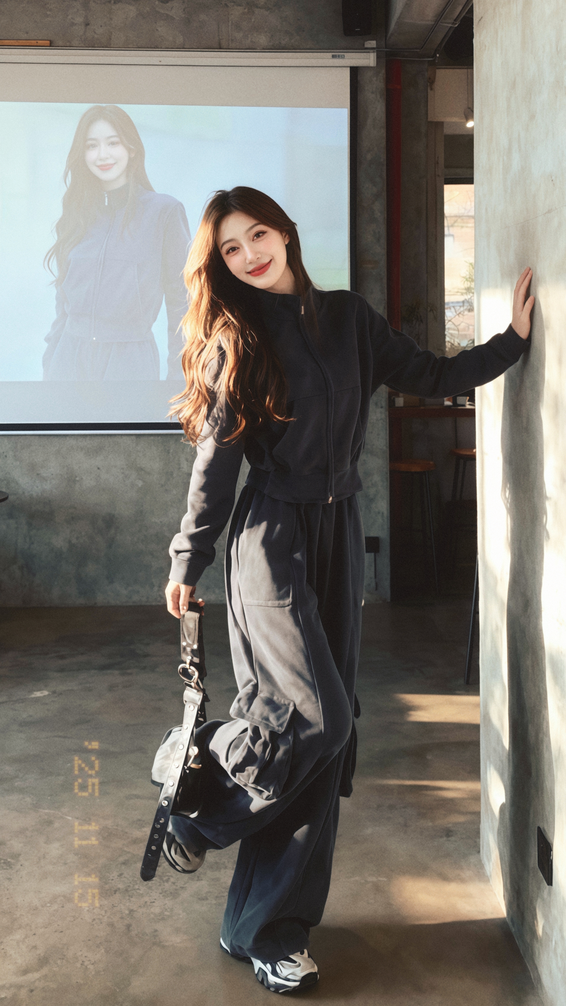 工业风咖啡馆的暖光里,语桐穿着一身深灰色运动套装,短款拉链上衣搭配阔腿工装裤,脚下是一双潮酷的运动鞋。她曾觉得运动套装过于“休闲”,尝试后却发现,深灰的质感与工装元素的碰撞,竟生出一种飒爽又不失随性的风格。身后投影幕的画面悄然呼应,她站在那里忽然懂得:一套看似日常的运动装,也能在风格融合中,穿出独属自己的街头时髦感。秋冬王炸穿搭把秋冬专属氛围穿上身秋冬也太适合叠穿了秋冬穿搭避雷单品入冬了我从头到脚都绒化了