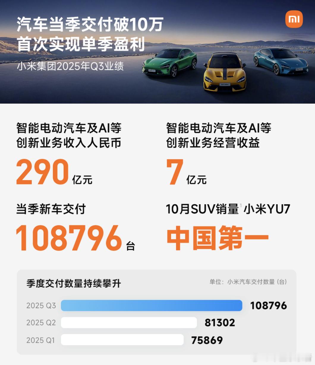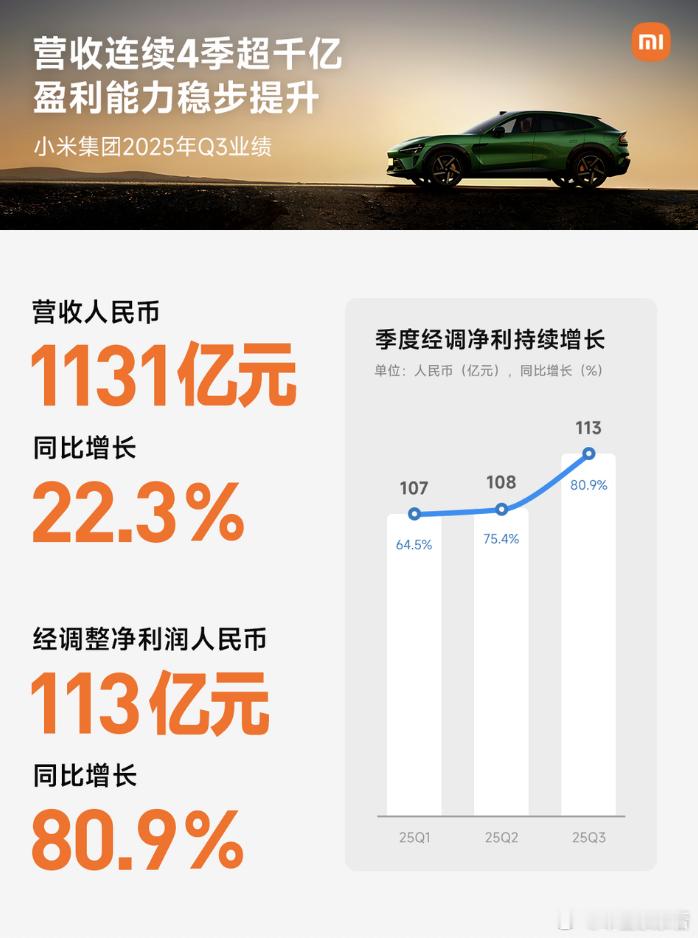 小米集团Q3狂赚113亿,股价却大跌小米集团在披露超预期第三季度财报后,股价不仅没有走强,反而持续走低。11月20日,截止目前,小米港股跌2.89%,报每股37.70港元,总市值9818亿港元。与今年6月高点的61.45港元相比,累计跌幅超过30%,市值蒸发约3000亿港元。值得注意的是,11月18日,小米集团披露第三季度业绩,数据显示,其单季营收达1131亿元,同比增长22.3%,连续四个季度突破千亿;经调整净利润为113亿元,同比大幅增长80.9%,创下历史新高。其中,小米汽车业务表现亮眼,单季营收 290 亿元,同比暴涨 199%,首次实现 7 亿元盈利,毛利率达到 25.5%。有分析认为,小米股价下跌与市场情绪波动有关。近期,小米汽车卷入产品诉讼与安全争议,一定程度上影响了市场信心。此外,2026年新能源车购置税补贴政策将减半等因素也是造成小米股价下跌的原因之一。此前,小米集团总裁卢伟冰曾在业绩电话会上直言,虽然今年第四季度小米汽车仍基本保持稳定状态,但2026年将会非常有挑战,预计明年小米汽车的毛利率相对于今年,会出现下滑。 (原创/欢欢)