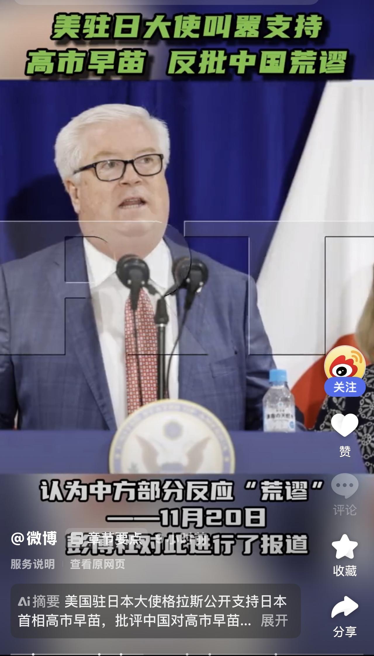 美国驻日大使格拉斯11月20日与日本外长茂木敏充会面后说,“我代表总统、我本人以及大使馆向首相表明:我们支持她。”。并称美国将在中日发生任何争端时坚定站在日本一边。