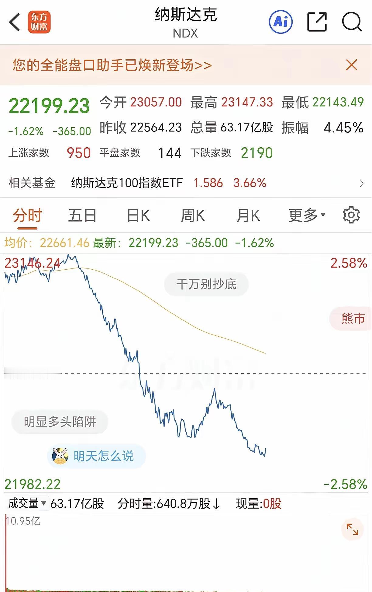 凌晨3点10分,刚刚被设置的手机信息惊醒了,怎么也睡不着!纳指从高开大涨最高2.58%,到现在大跌1.62%,这就是很不好的“M碑线”,坑人线,牛市终结线!原来纳斯达克也会让人失望,清仓走人! 这波跳水根本不是意外,美联储降息预期降温,加上AI泡沫的担忧,早就是埋好的雷。所谓的高开就是诱多,机构趁机出货,散户追高直接被套。 墓碑线一出现,就是多空反转的强烈信号,尤其是纳指从高位已跌超7%,这哪是调整,分明是趋势变了。桥水基金都在狂减英伟达,聪明钱早跑了。 别迷信什么长期持有,这种极端波动下,及时止盈止损才是王道。真以为科技股能一直涨?泡沫破了谁都跑不掉。 你手里的纳指相关持仓清了吗?觉得这波是短期回调还是熊市真的来了?