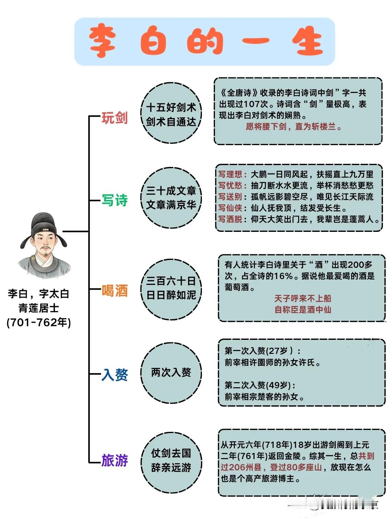李白的人际关系图 李白爱好~喝大酒,写诗,旅行,交友,修道... 李白的一生,活的极其潇洒,浪漫,畅快,肆意张扬,他走过万里河山,品过美酒佳肴,拥有众多好友,还有几多红颜知己... 李白还擅长剑术,十步杀一人,千里不留行,就是他的实力。 李白的文采斐然,留下超多传世之作... 李白的一生也是跌宕起伏,扣人心弦,有过前呼后拥,也曾穷困潦倒... 收藏起来,了解我国著名的诗仙! 李白