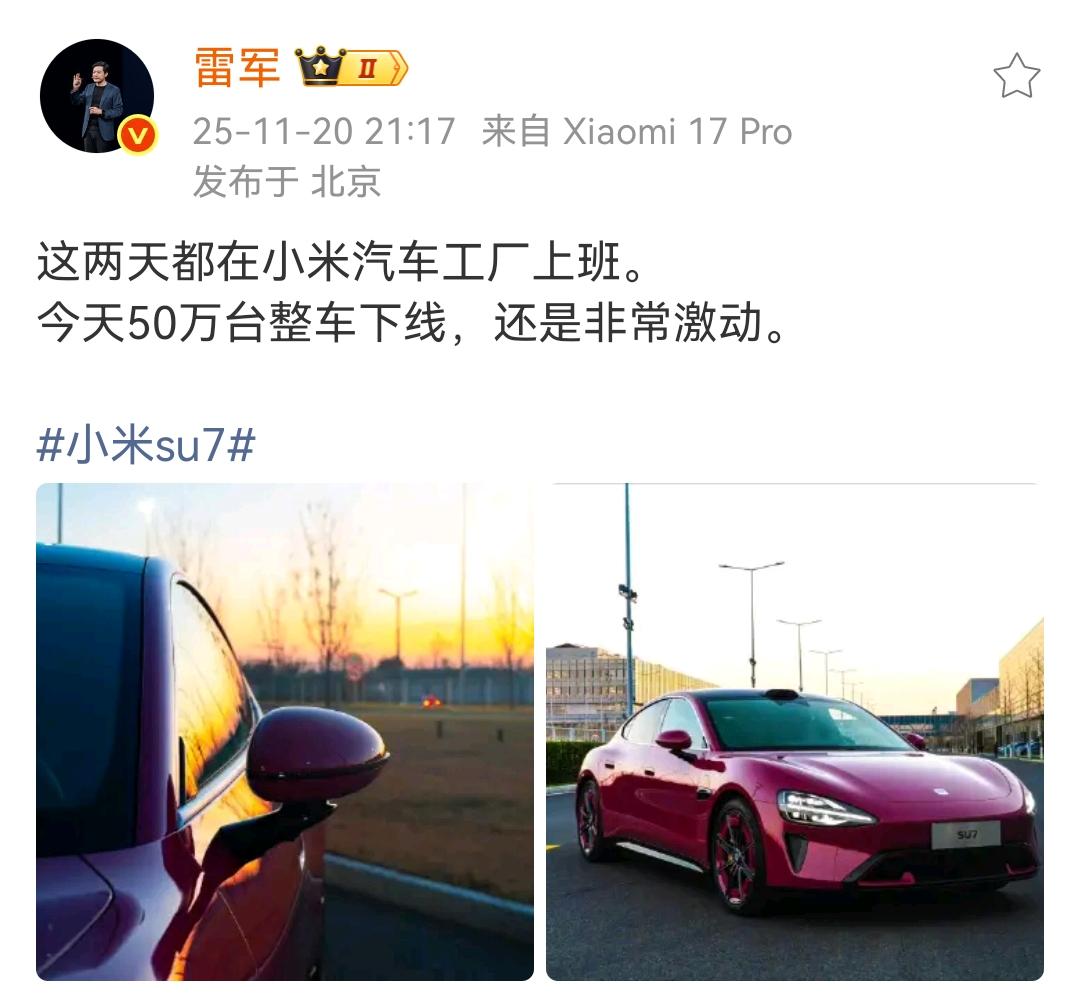 雷军:这两天都在小米汽车工厂上班。 今天50万台整车下线,还是非常激动! 这确实是一个里程碑,接下来就是100万辆的里程碑,小米汽车有可能在明年年底就会实现第100万辆的新纪录! 2026年预计有小米SU7改款车型将要上市,还有小米SU9大型全尺寸增程SUV上市,预计会进一步拉高小米汽车的月销量。 各位是怎么看的?欢迎评论区留言。