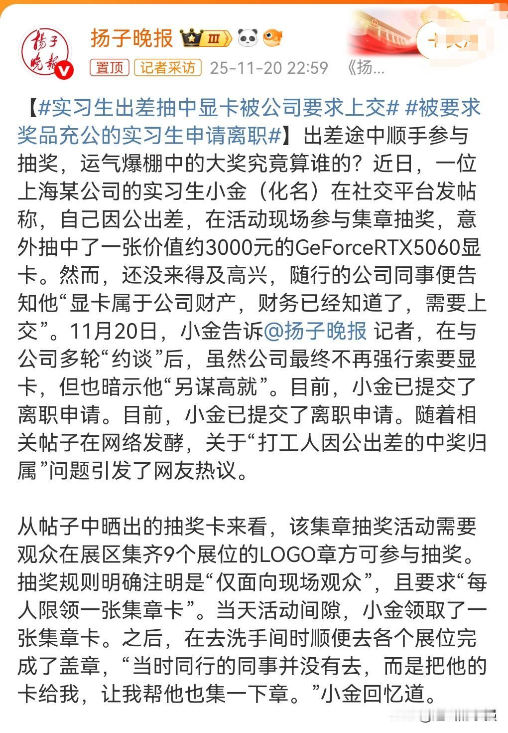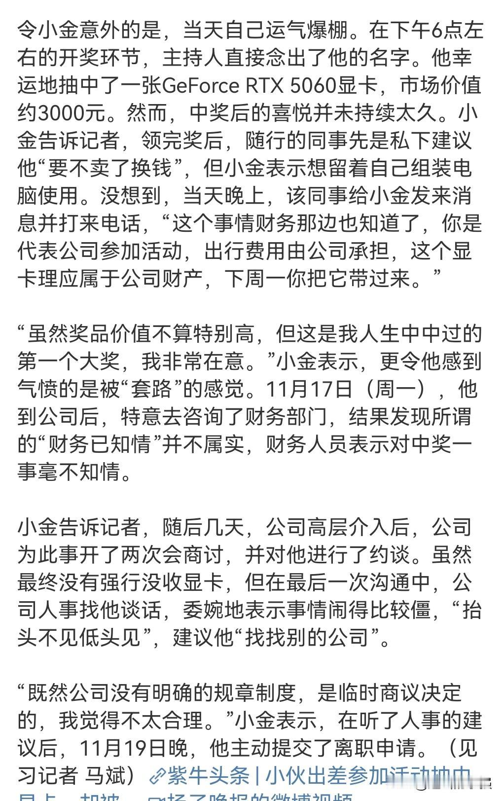 这也太丧心病狂了吧,果然嫉妒使人面目全非呀。 一小伙儿出差途中中了一个3000块钱的显卡。 没想到这公司竟然还打起了主意要他上交。 虽然最后没有上交,但是要求小伙必须离开公司。 这真的是太离谱了。 想不到人心竟然泯灭到这样的程度。 为了一个3000块钱的显卡干出这种缺德事。 这公司太不地道了。