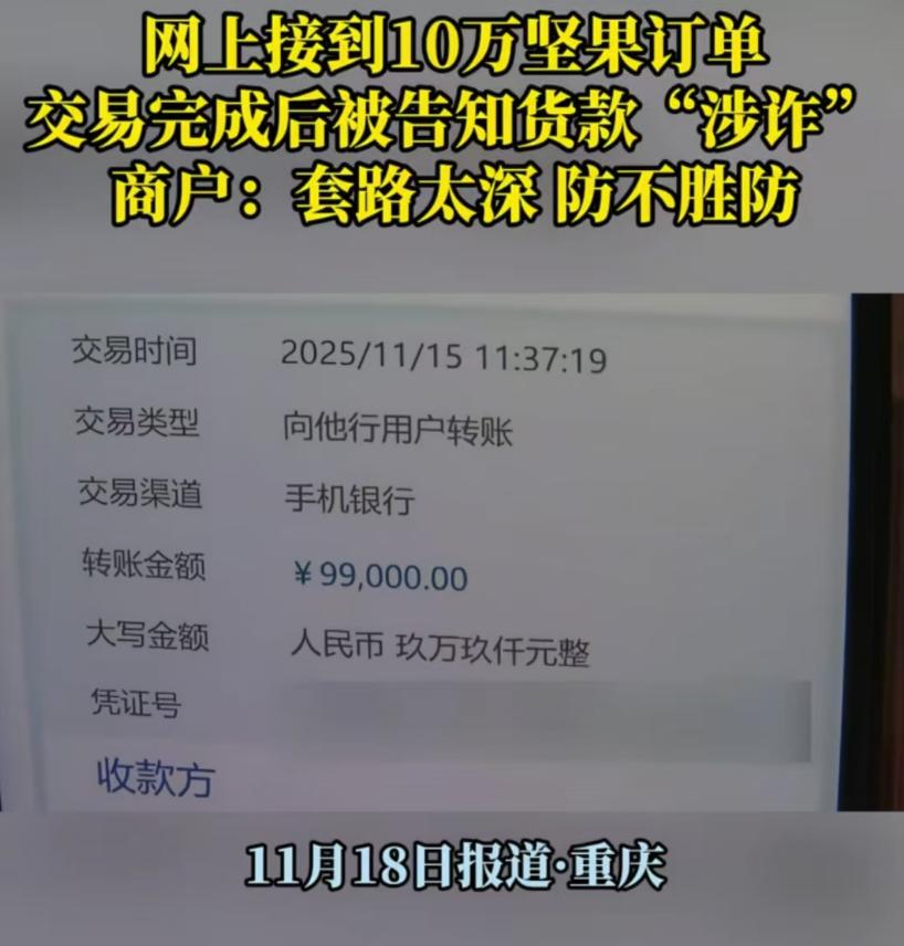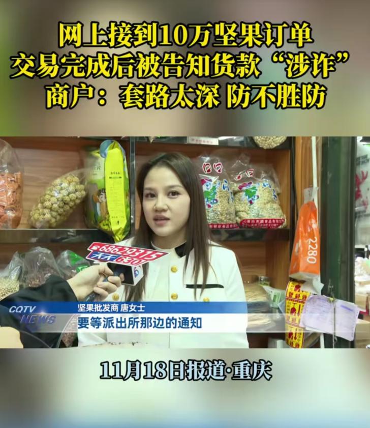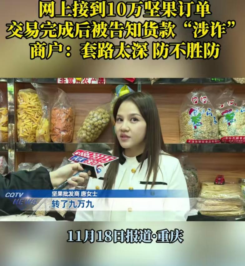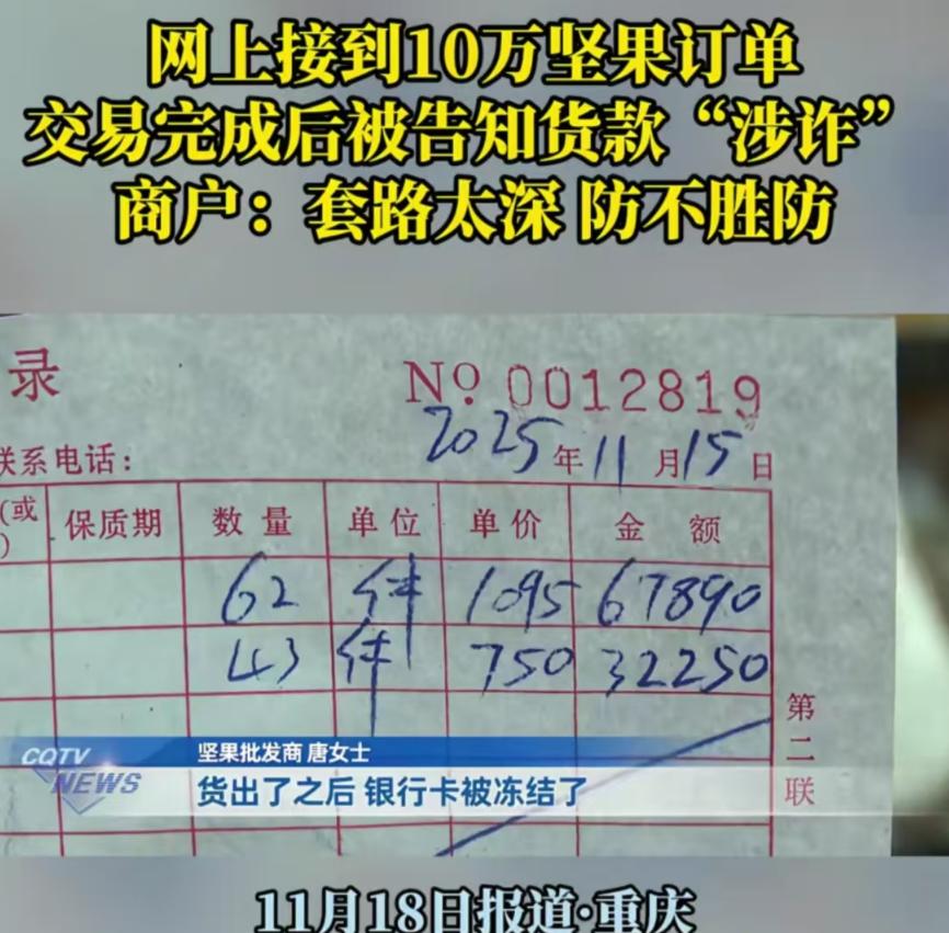 “我怎么知道他钱干净不干净?”重庆,女子在网上接到10万坚果订单,对方付钱后就让货拉拉把货运走,可她还来不及高兴,几个小时后银行卡就被冻结了,警方说女子收到的货款是涉诈资金!女子:“我就正常做生意,货没了,钱没了,我冤不冤?”   重庆做坚果批发的唐女士,11月13号撞上一个“好生意”,网名“淡泊明志”的人加好友,说要批几十件坚果当员工福利,还挺懂行,先让寄样品,确认没问题直接要银行卡号。   没过多久,99000元到账提示弹出来,唐女士赶紧备货,几十箱核桃、巴旦木堆满铺子。   对方说没空,叫货拉拉来取货,她核对司机车牌,拍了装车照片,看着货车开走时,心里还盘算着进新货。   哪想到三小时后出事了,她想转钱给供货商,手机弹出来“账户异常”,打银行电话一问,卡被外地警方冻结了,冻结期六个月。   民警找上门才说透,那笔货款是涉诈资金,骗子先骗了另一个人,让受害者把钱直接转唐女士账户,再用这笔钱买走坚果。   货拉拉司机卸货在路边,货物转手就被骗子卖了,线索断得干干净净,唐女士翻出聊天记录、订单截图和物流单,手都在抖:“我就正常做生意,货出去了,钱冻着,我冤不冤?”   这事不是个例,当地已有七八家商户栽跟头,涉案近百万,骗子专挑中小商家下手,用“大额订单+爽快付款”打时间差。   这让商家来不及多想就发货,把他们的账户变成“洗钱中转站”,2023年全国涉诈资金冻结案里,近三成受害者是这类商户。   民警解释,冻结账户是为堵截赃款,不是定她罪,但得配合调查,律师也说,关键看她知不知情,交易价格正常,没签合同是小商家常有的事,不算过错,不用担刑责,但要等案子破了才能追损失。   可唐女士急得上火,卡冻着没法周转,进货钱都凑不出来,她后来才想明白,骗子的套路藏在细节里:不还价、不验货、催着发货,从头到尾没露过面,全靠线上联系。   现在她把所有交易材料递交给警方,天天盯着手机等消息,同行们也慌了,传开“大额订单要对公转账”“先查对方营业执照”的规矩。   冻结容易解冻难,唐女士的卡还冻着,货早没了踪影,这事儿戳中不少商家的痛处:谁能每次收款都查钱的来路?   打击诈骗没错,但总不能让老实做生意的人买单,民警也提醒,陌生客户给大额转账,多问一句身份,走平台担保交易,别让自己成了骗子的“工具人”。