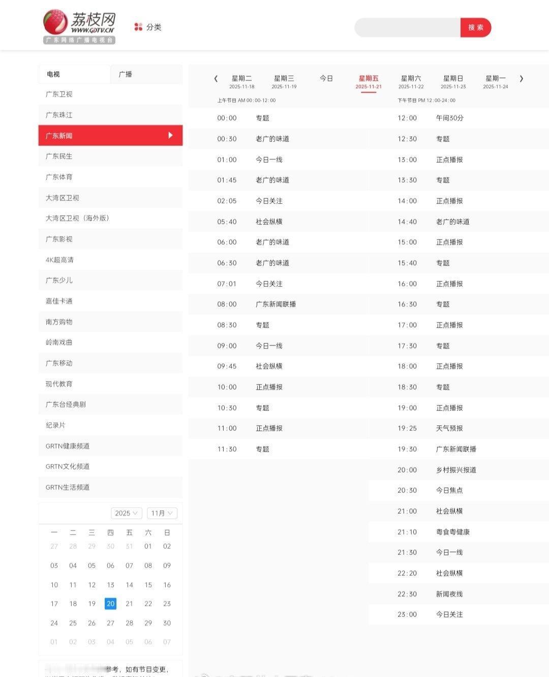 因明日(11/21)晚上广东卫视19:33播出特别节目(转播总台央视的十五运闭幕式?)的原因 广东卫视《晚间新闻》顺延至21:30播出 广东新闻频道明日同时段不转播、正常播出节目