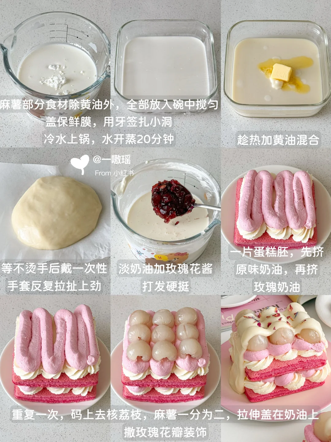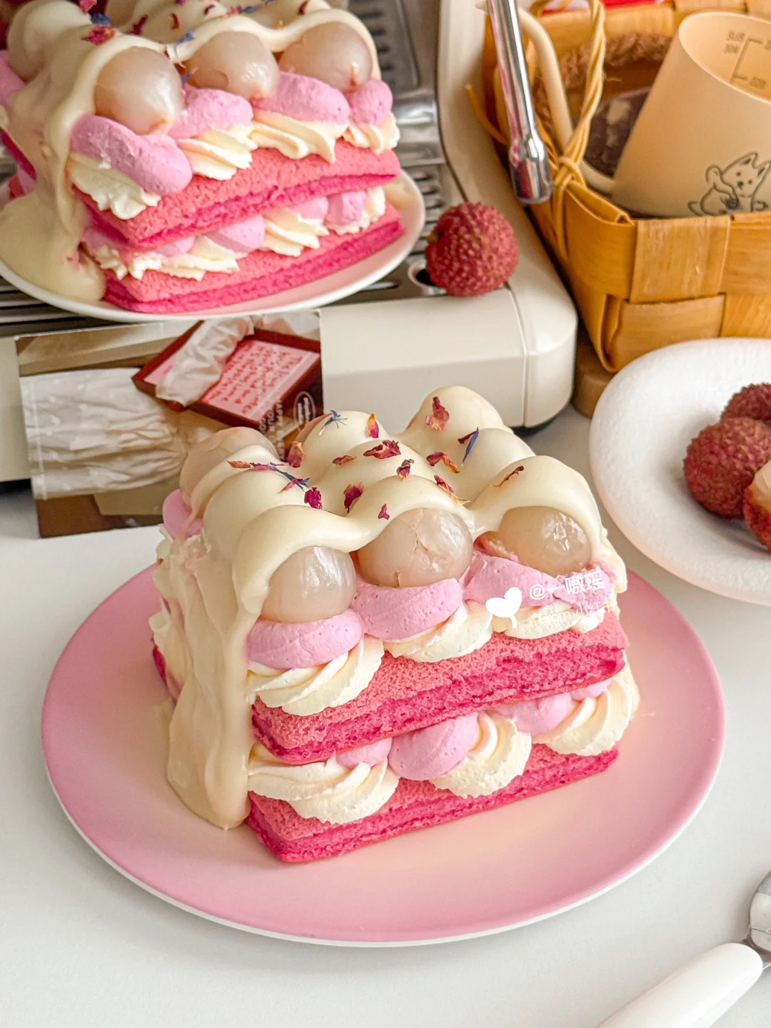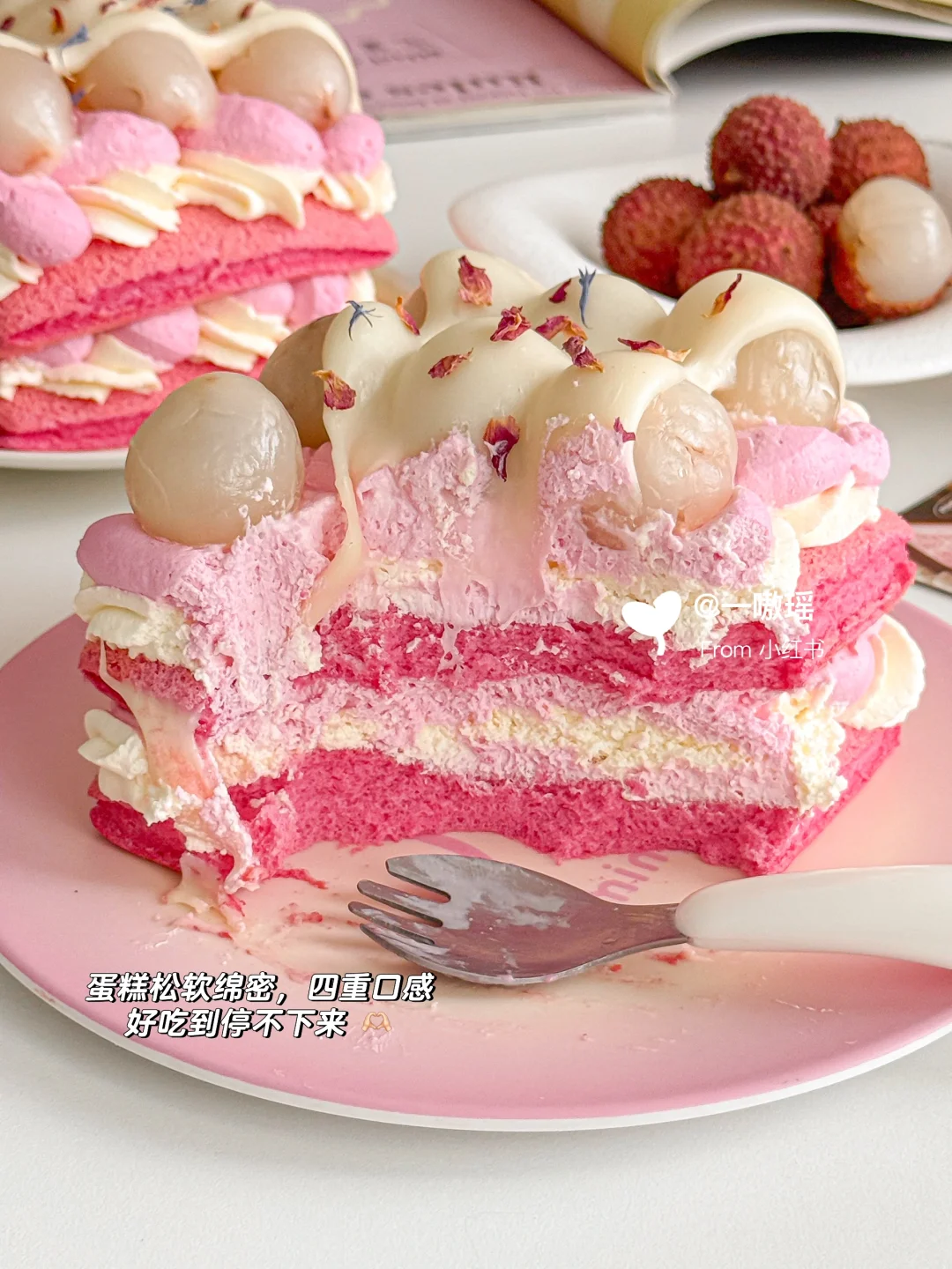 夏日限定小甜品,荔枝玫瑰麻薯蛋糕🌹🍰 给松软细腻的奶油蛋糕盖上糯叽叽能拉丝的“夏凉被” 一口享受四重口感,做法也简单! 一起来复刻~🙌🏻 - 🛒食材 💗蛋糕胚 蛋清170g|蛋黄1个|白糖40g 柠檬汁5g|牛奶90g|玉米油40g 奶粉15g|低筋面粉70g|仙人掌果粉6g 🌀拉丝麻薯 糯米粉60g|玉米淀粉10g|糖10g 牛奶120g|黄油10g 🌹玫瑰奶油 淡奶油270g|玫瑰酱15g|适量仙人掌果粉 🩵原味奶油 淡奶油270g|白绵糖10-15g
