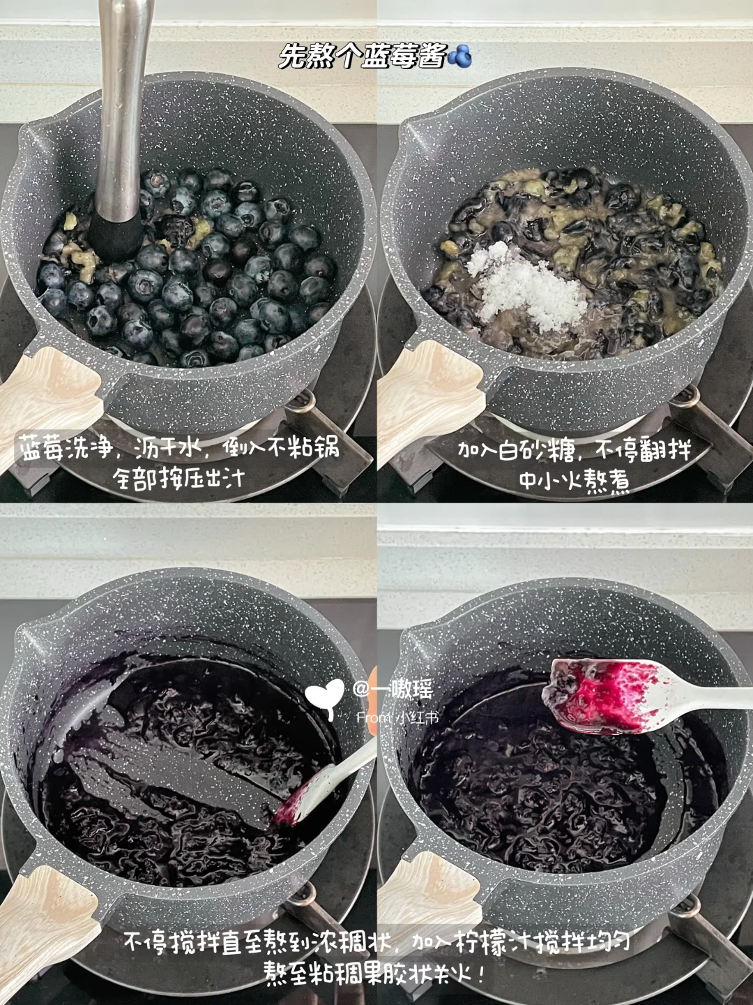 ▫️依次倒入淡奶油、玉米淀粉、蓝莓酱搅拌均匀