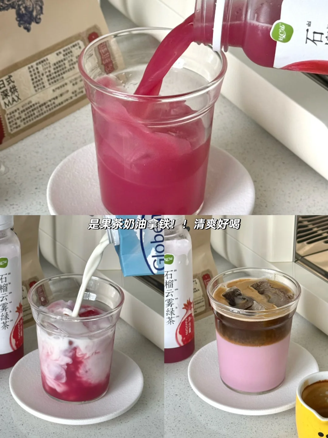 石榴云雾绿茶单直接就很赞了🍃茶香清爽解腻,加入牛奶,淋上咖啡液,打了点海盐奶盖,层次丰富