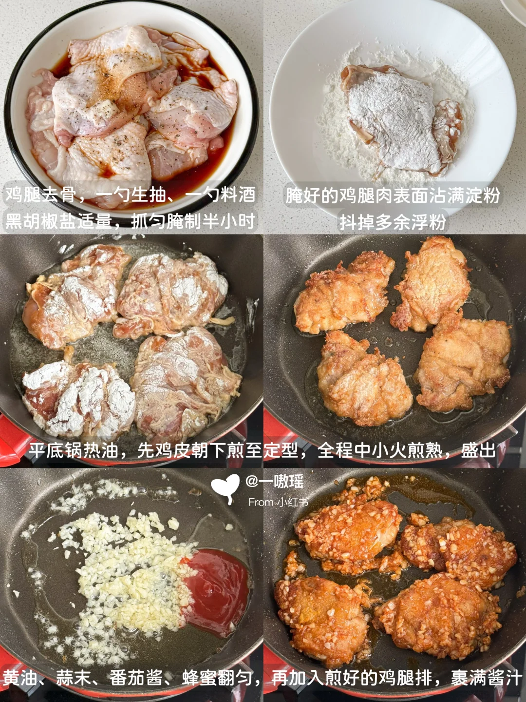 ▫️黄油、蒜末、番茄酱、蜂蜜翻匀,再加入煎好的鸡腿排,裹满酱汁