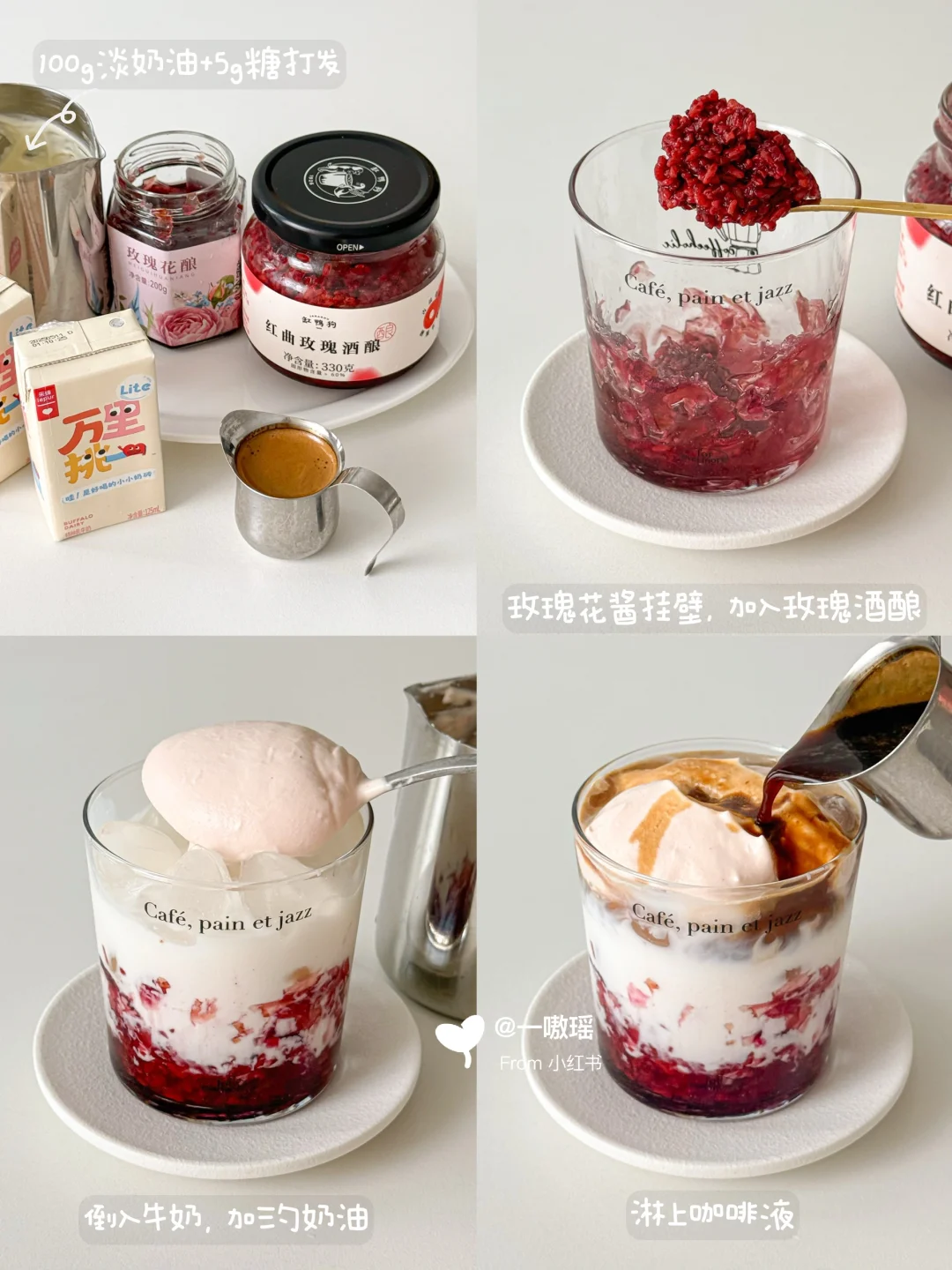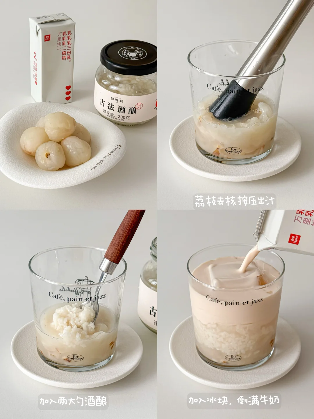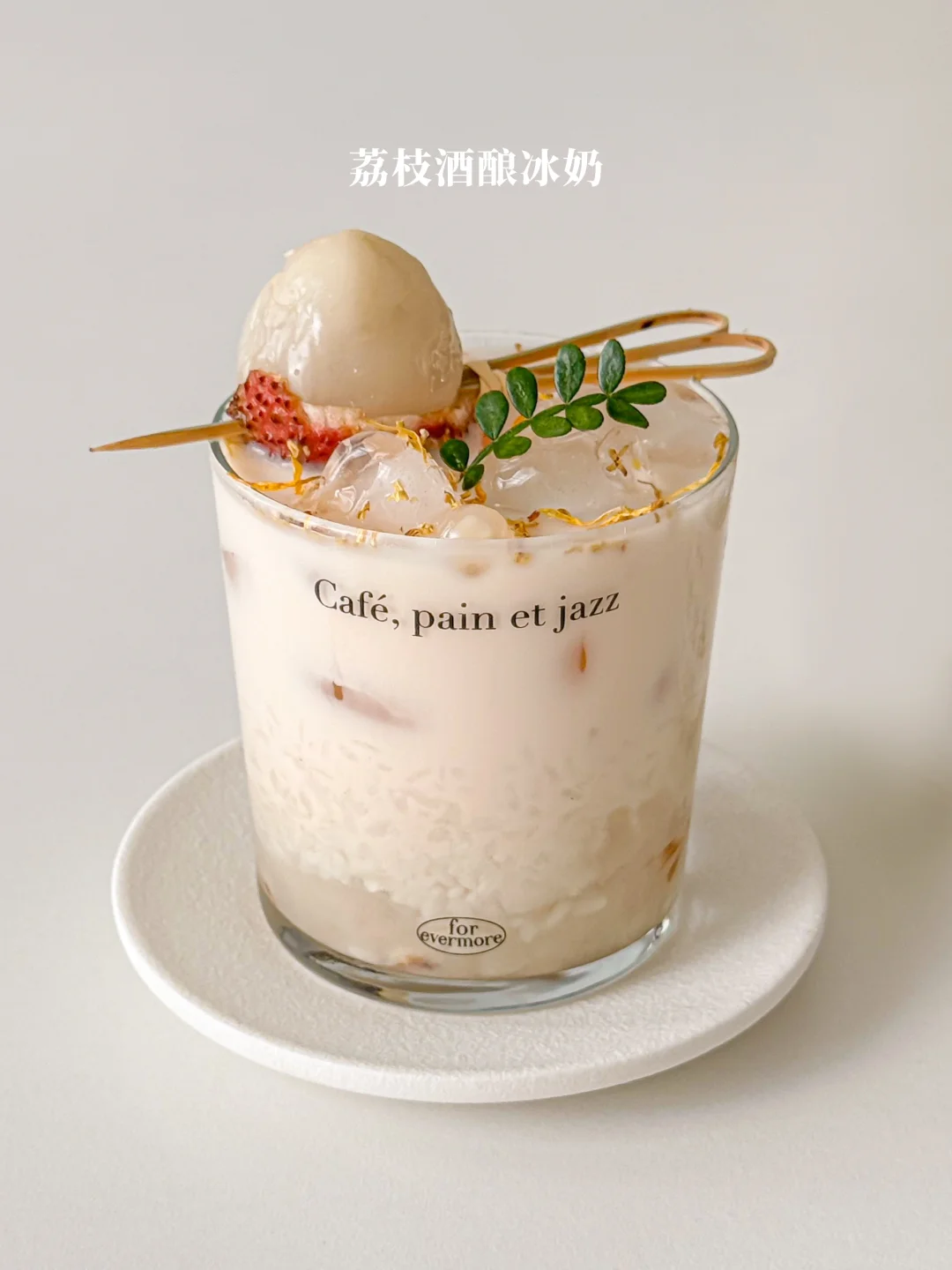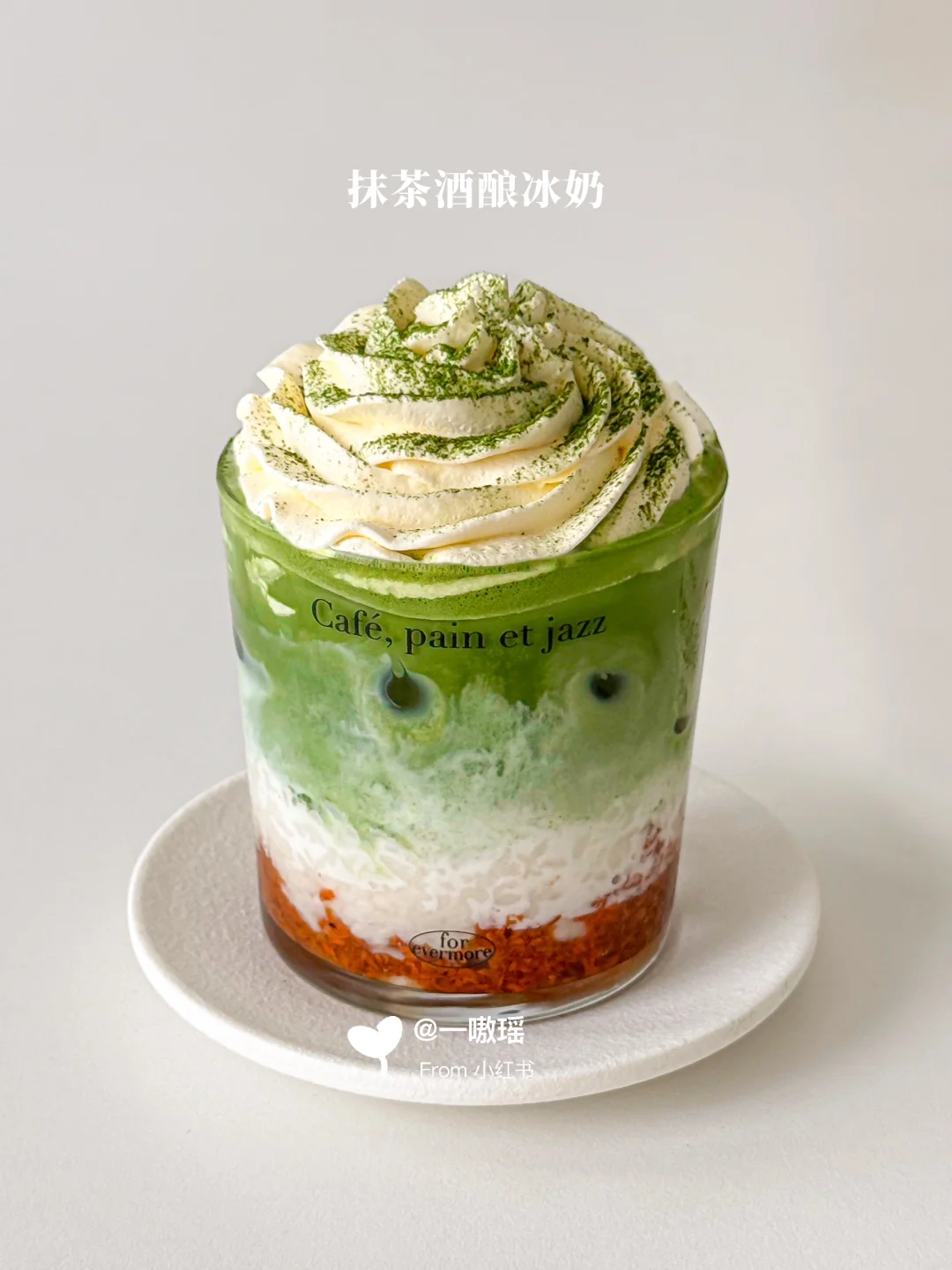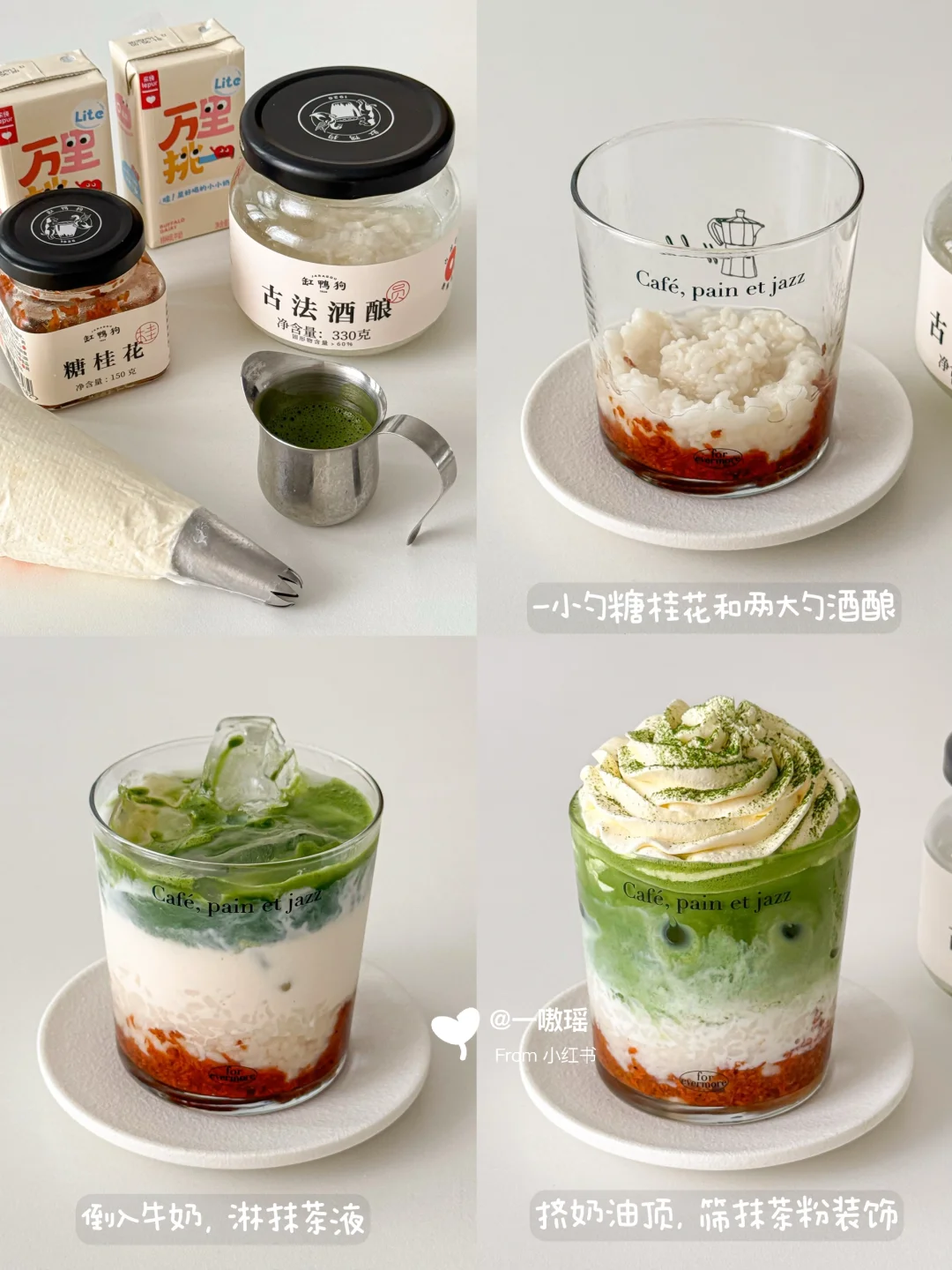 酒酿脑袋不能错过的夏日酒酿特调系列✨ 一杯软糯香醇🍃 冰冰凉凉还很解暑🧊 每一杯都很有特色,酒酿真别太百搭了! - ☕️桂花酒酿拿铁 🍃抹茶酒酿冰奶 🌹玫瑰酒酿维也纳 🤍荔枝酒酿冰奶 · 🥛做法见图上