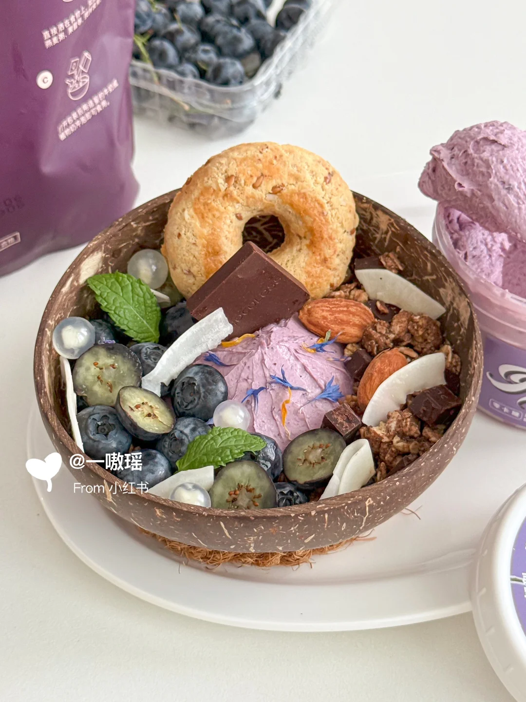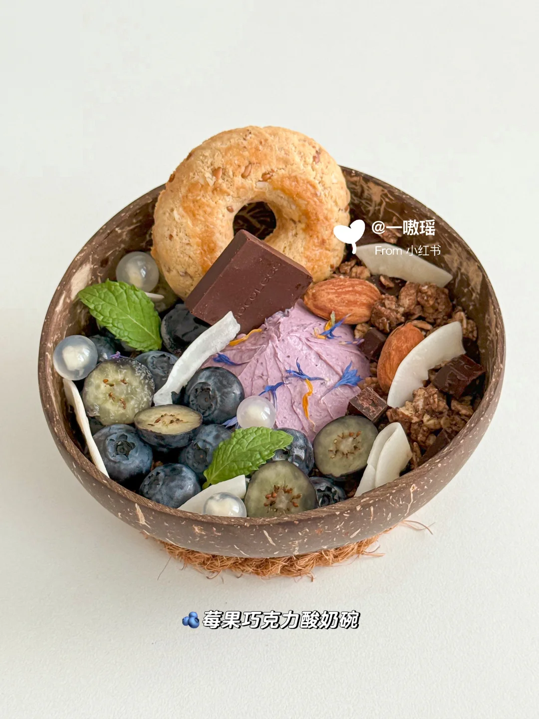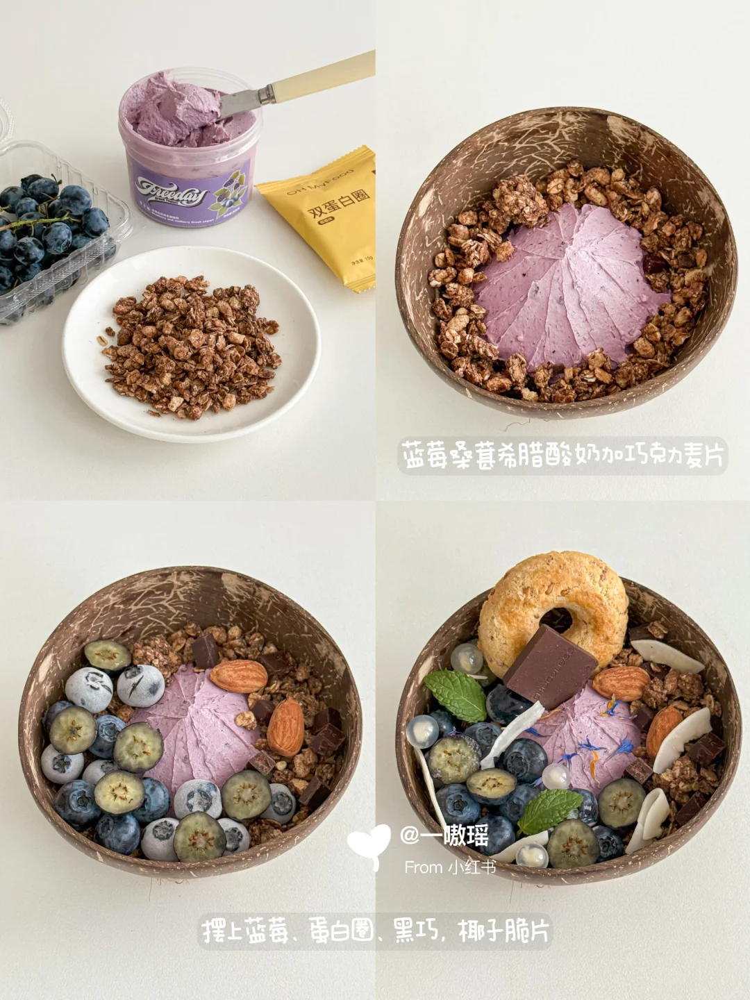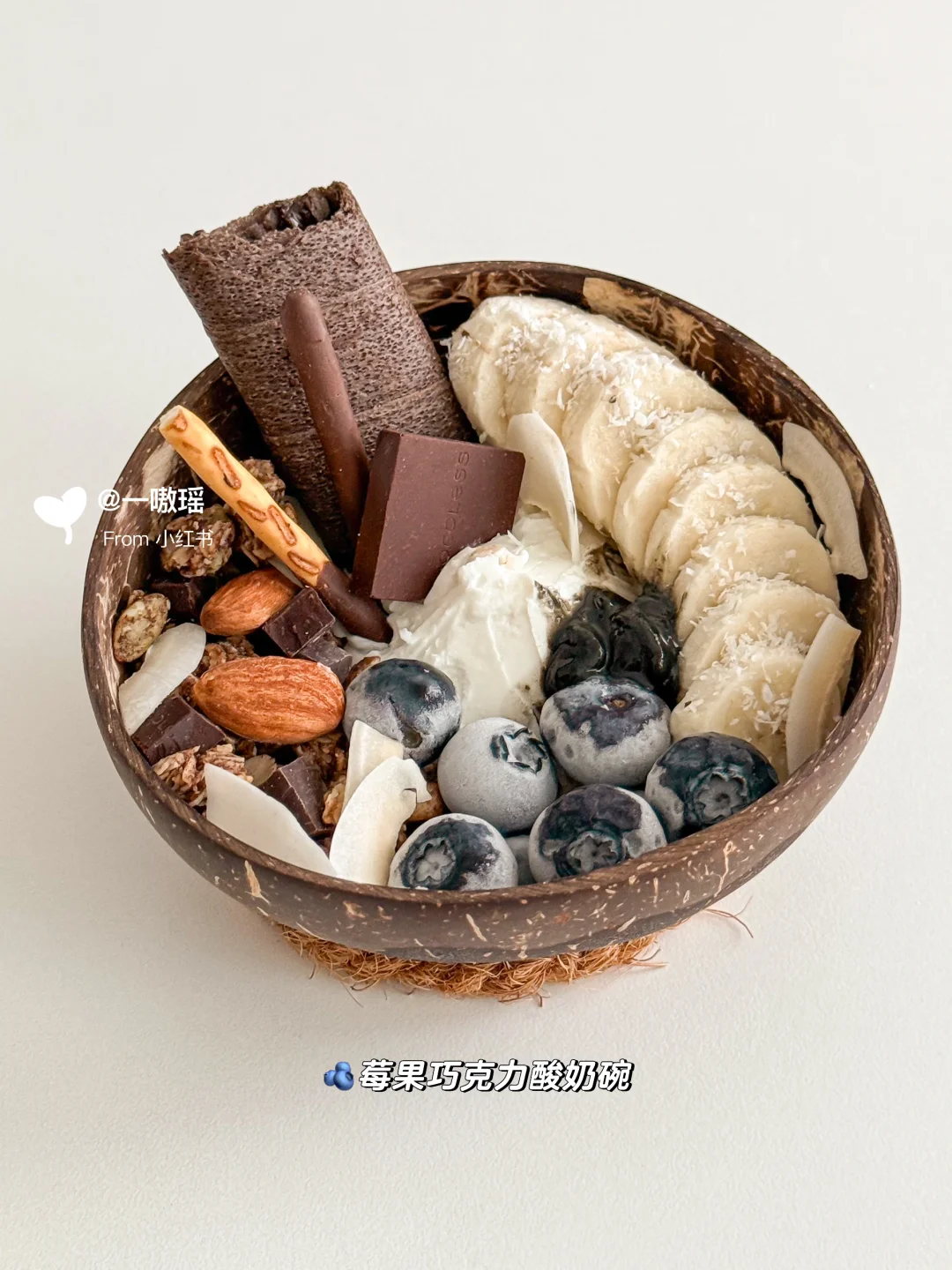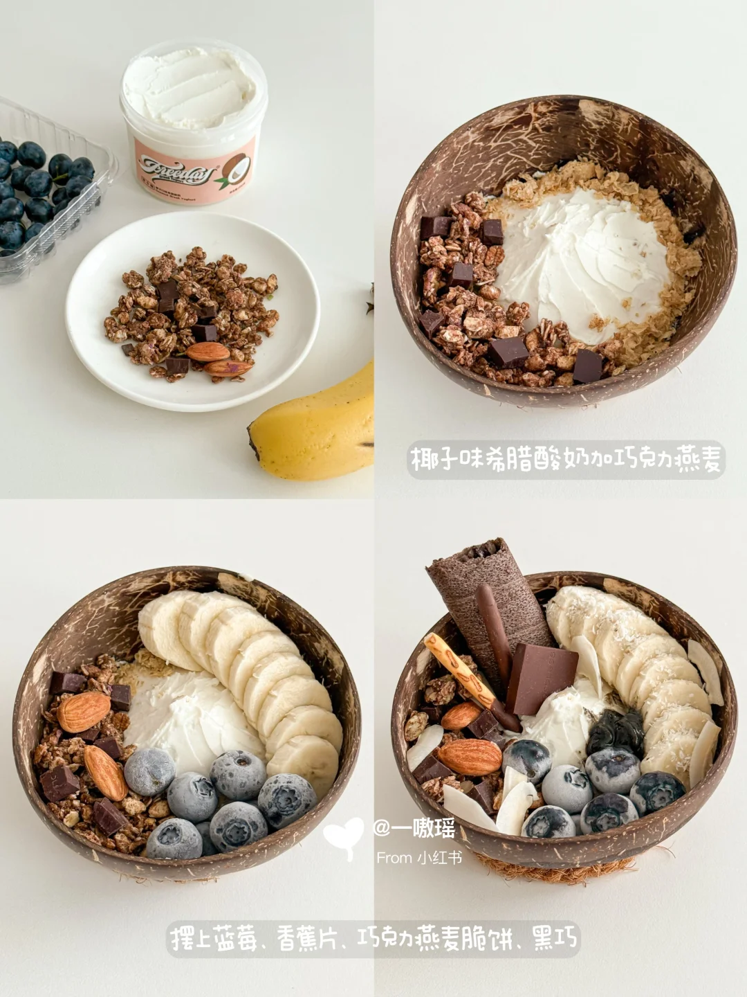 香蕉+ 蓝莓+ 椰子希腊酸奶+巧克力烘焙燕麦+ 黑巧