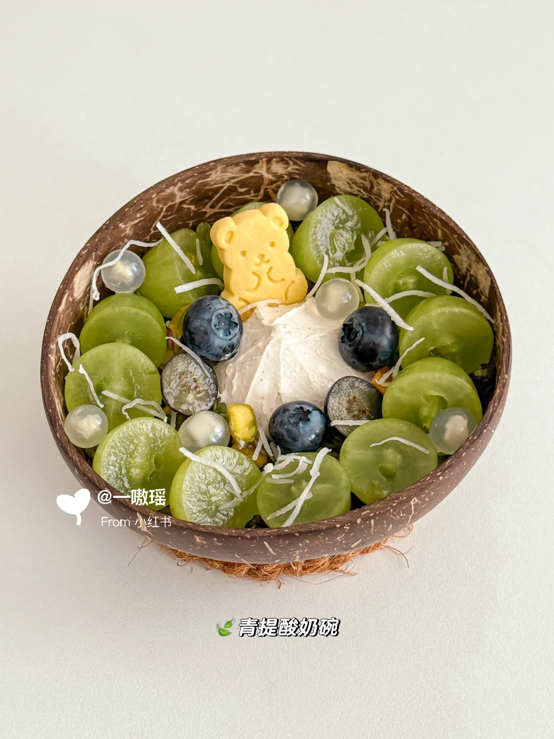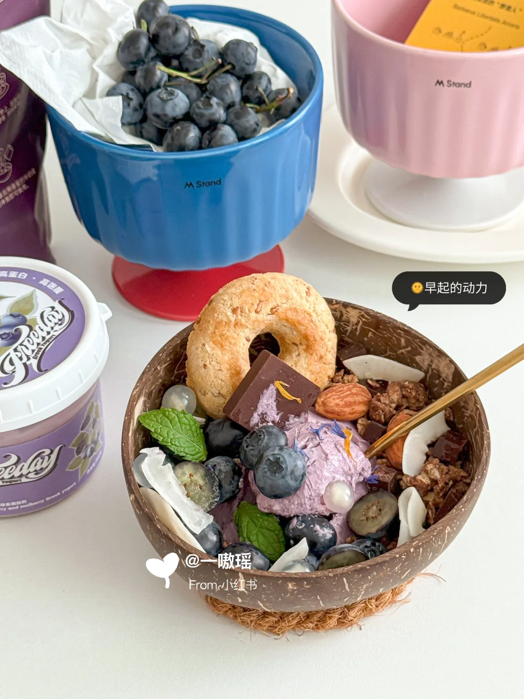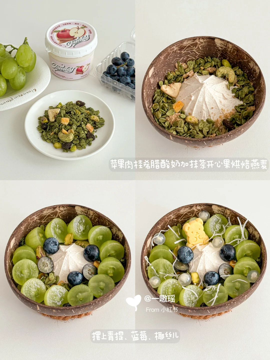 青提+蓝莓+ 肉桂苹果希腊酸奶+抹茶烘焙麦片+ 椰丝