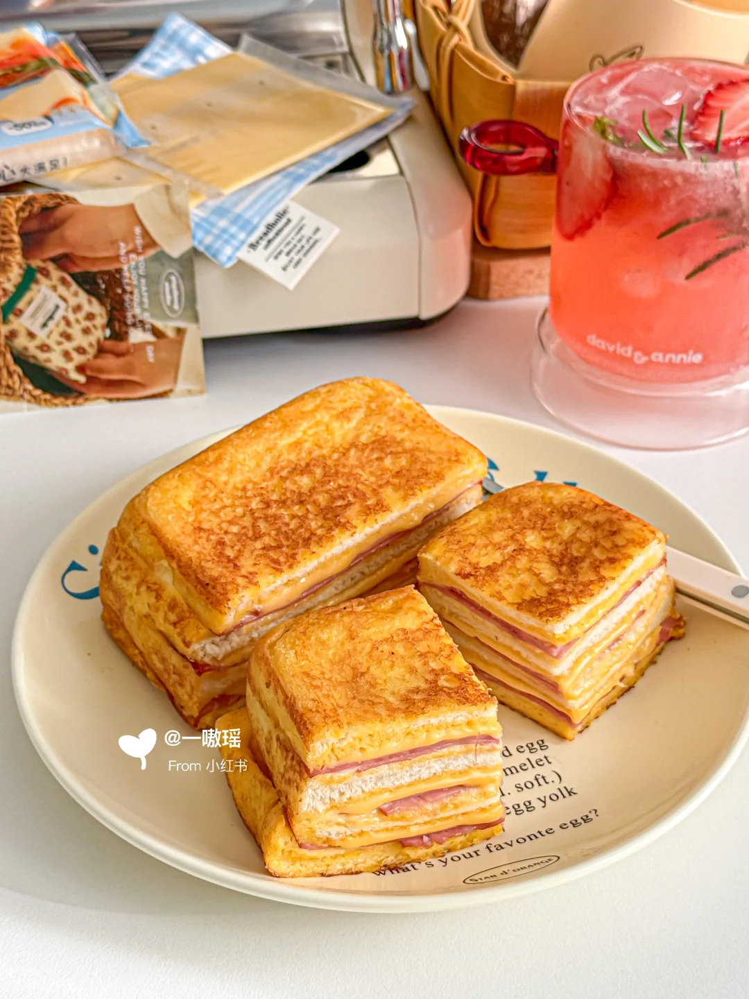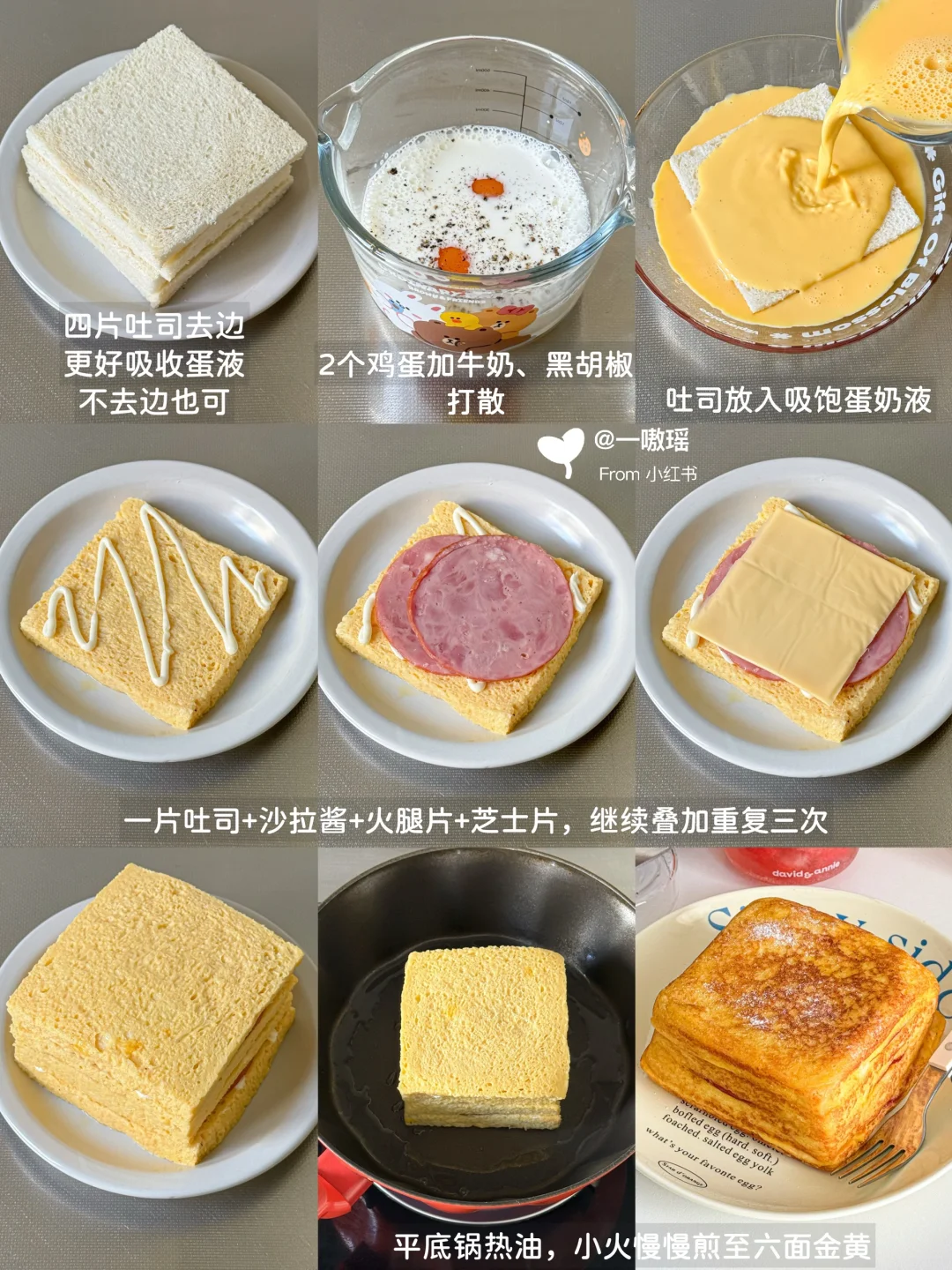 吸饱牛奶蛋液的吐司煎完软嫩香甜 奶fufu☁️ 混合火腿和芝士的咸香,层层爆浆,巨巨巨好吃‼️ 切开之后芝香浓郁♨️ “快手早餐系列” 之 有手就会👌 - 🛒食材 吐司4片|火腿6片|鸡蛋2个|百吉福减脂芝士片3片|牛奶100g左右|沙拉酱 👩🏻🍳做法 ▫️四片吐司去边(更好吸收蛋液,不去边也可) ▫️2个鸡蛋加牛奶、黑胡椒打散 ▫️吐司放入吸饱蛋奶液 ▫️一片吐司+沙拉酱+火腿片+芝士片,重复三次 ▫️平底锅热油,小火慢慢煎至六面金黄
