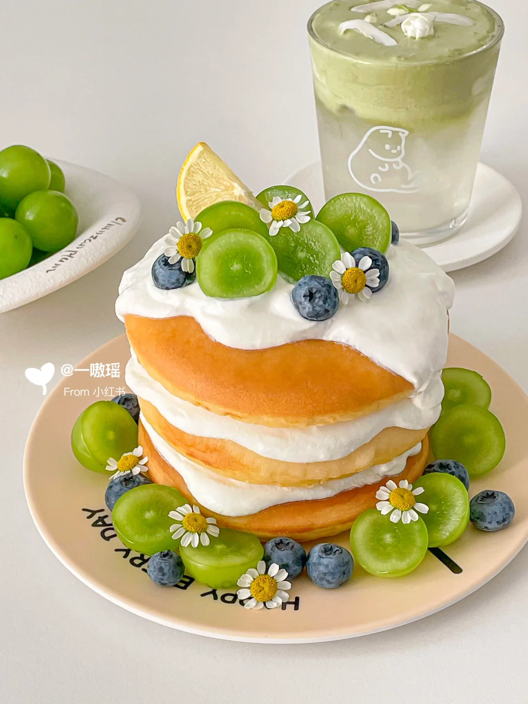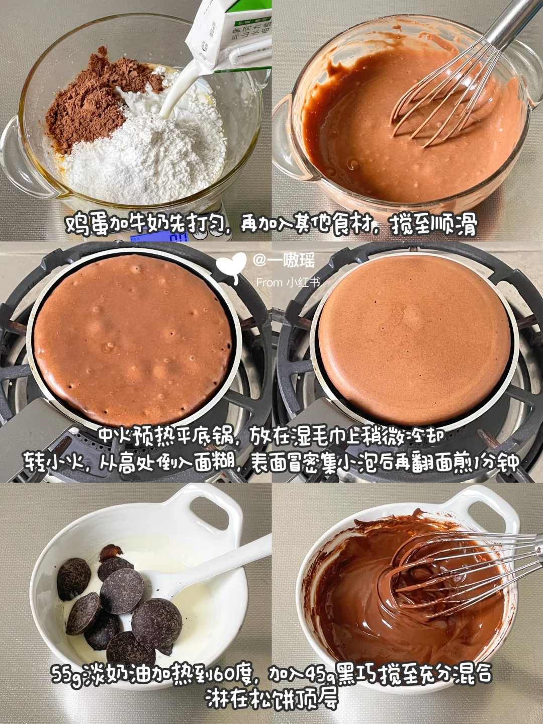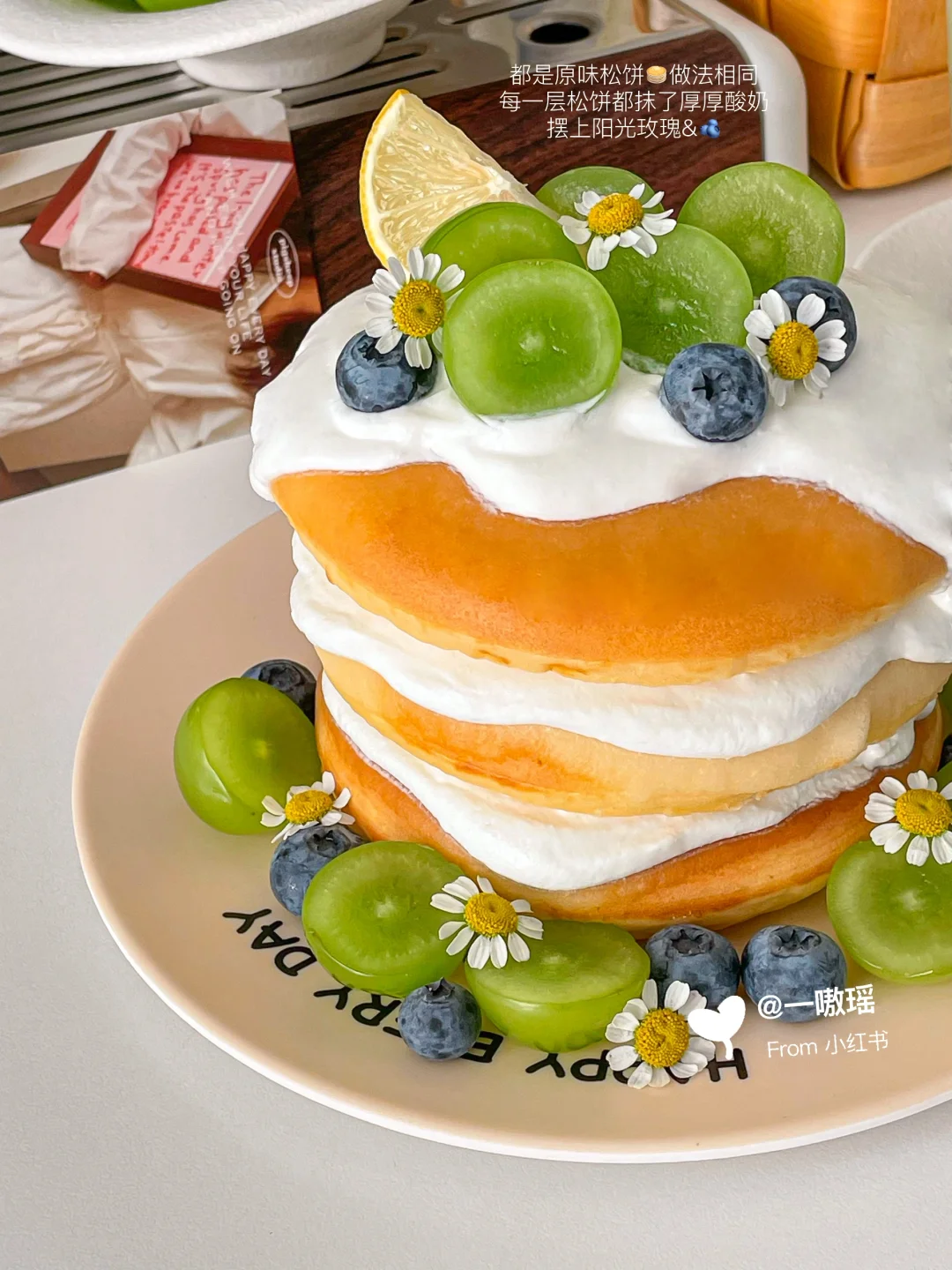 超厚且松软的蛋奶松饼裹着希腊酸奶,根本停不下口! 普通平底锅就能做🍳四种搭配,好看又好吃😋 〰️ 🛒食材 原味🥞:低筋面粉120g|鸡蛋一个|糖20g|牛奶80g|玉米油20g|泡打粉5g 巧克力🍫:低筋面粉90g|可可粉15g|鸡蛋一个|牛奶80g|玉米油16g|糖20g|泡打粉6g · 👩🏻‍🍳做法 ▫️鸡蛋加牛奶先打匀 ▫️再加入低粉、糖、玉米油、泡打粉搅至顺滑 ▫️中火预热平底锅,放在湿毛巾上稍微冷却 ▫️转小火,从高处倒入面糊 ▫️表面冒密集小泡后再翻面煎1分钟 ▫️每一层松饼抹上希腊酸奶 · 💬用普通平底锅做就好🍳只是没有图上这么厚(其实过分厚也不好,吃大口会有点噎🥲)