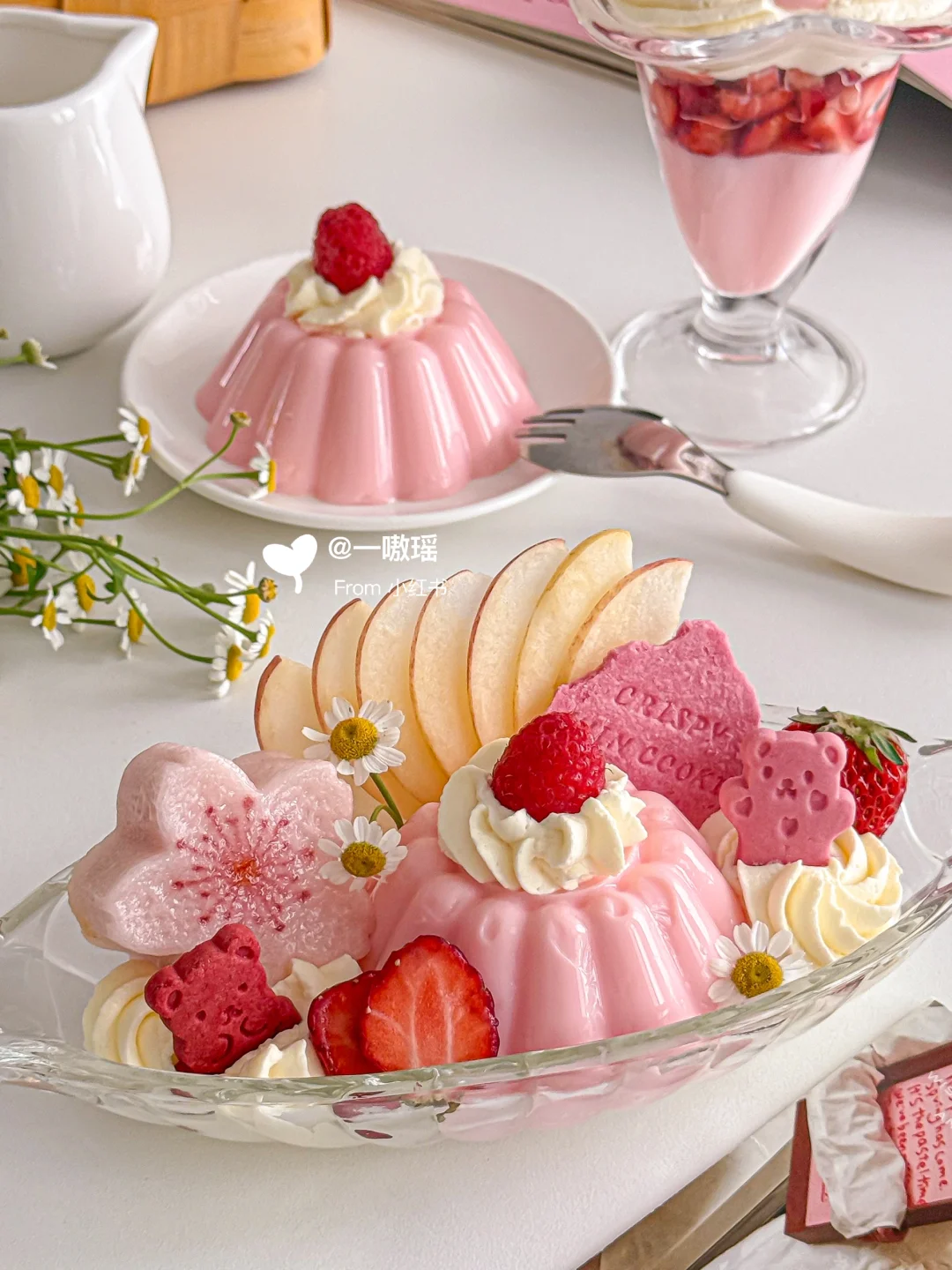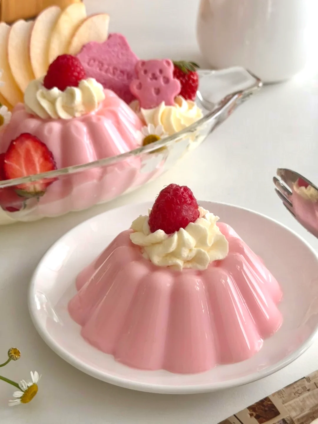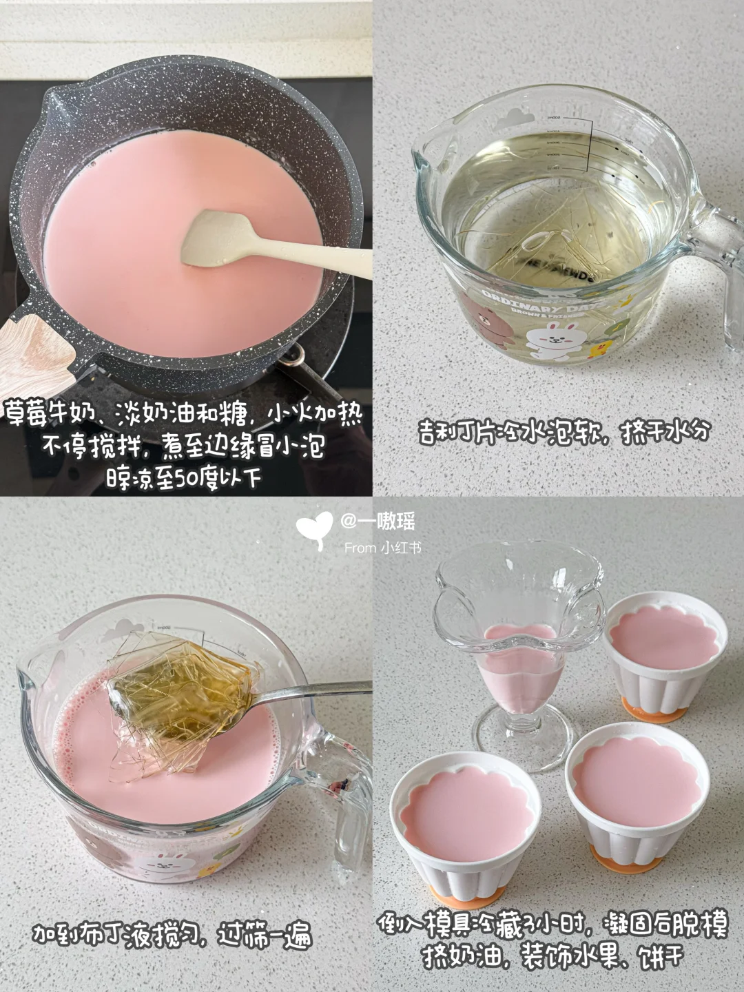 搅一搅再冷藏就能搞定的快手小甜品🥄细腻嫩滑奶香浓郁! Duangduang的~实在太可爱了🤩 - 🛒食材 草莓牛奶250g|淡奶油135g|糖8g|吉利丁片8g 👩🏻🍳做法 ▫️草莓牛奶、淡奶油和糖,小火加热,不停搅拌,煮至边缘冒小泡,晾凉至50度以下 ▫️吉利丁片冷水泡软,挤干水分,加到布丁液搅匀,过筛一遍 ▫️倒入模具冷藏3小时 ▫️凝固后脱模,挤奶油,装饰水果、饼干