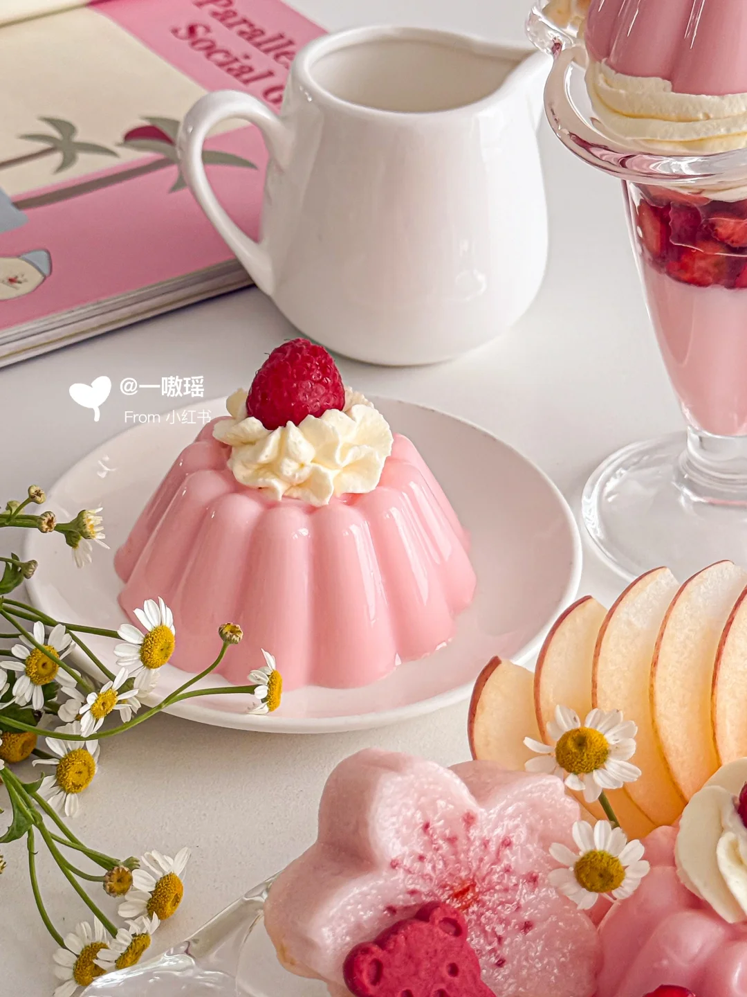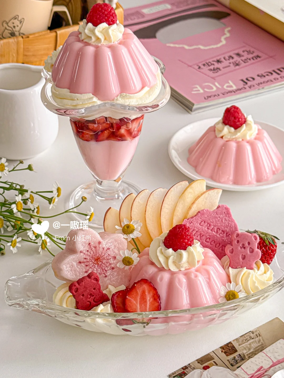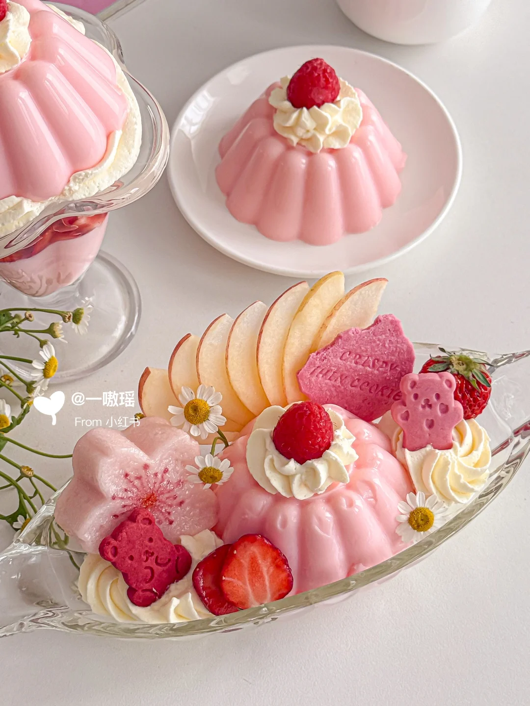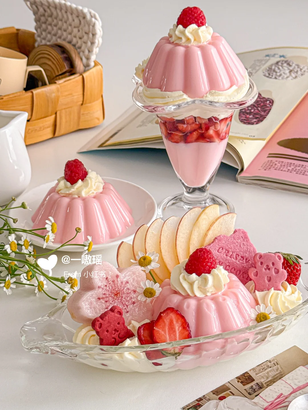 搅一搅再冷藏就能搞定的快手小甜品🥄细腻嫩滑奶香浓郁! Duangduang的~实在太可爱了🤩 - 🛒食材 草莓牛奶250g|淡奶油135g|糖8g|吉利丁片8g 👩🏻🍳做法 ▫️草莓牛奶、淡奶油和糖,小火加热,不停搅拌,煮至边缘冒小泡,晾凉至50度以下 ▫️吉利丁片冷水泡软,挤干水分,加到布丁液搅匀,过筛一遍 ▫️倒入模具冷藏3小时 ▫️凝固后脱模,挤奶油,装饰水果、饼干