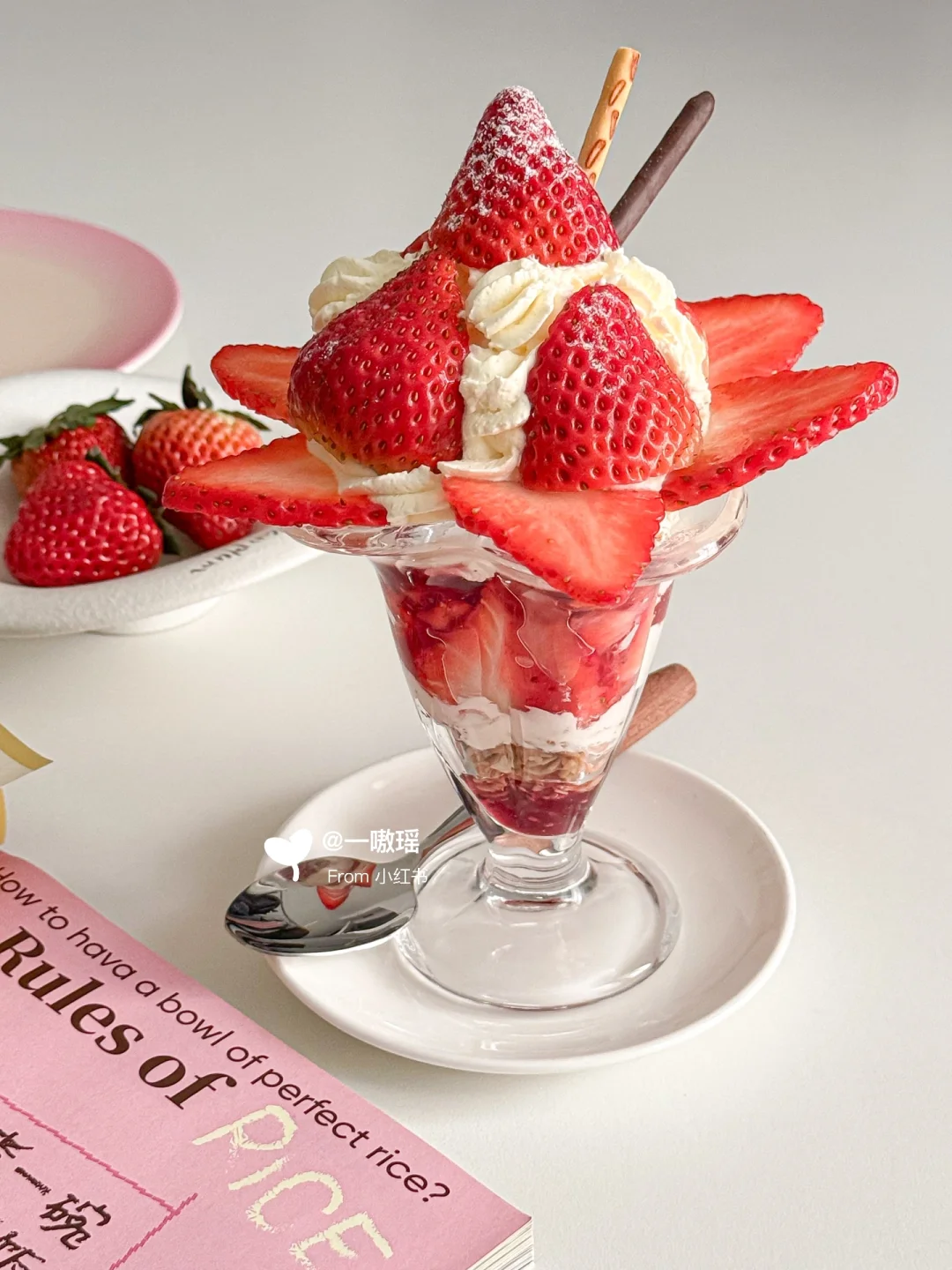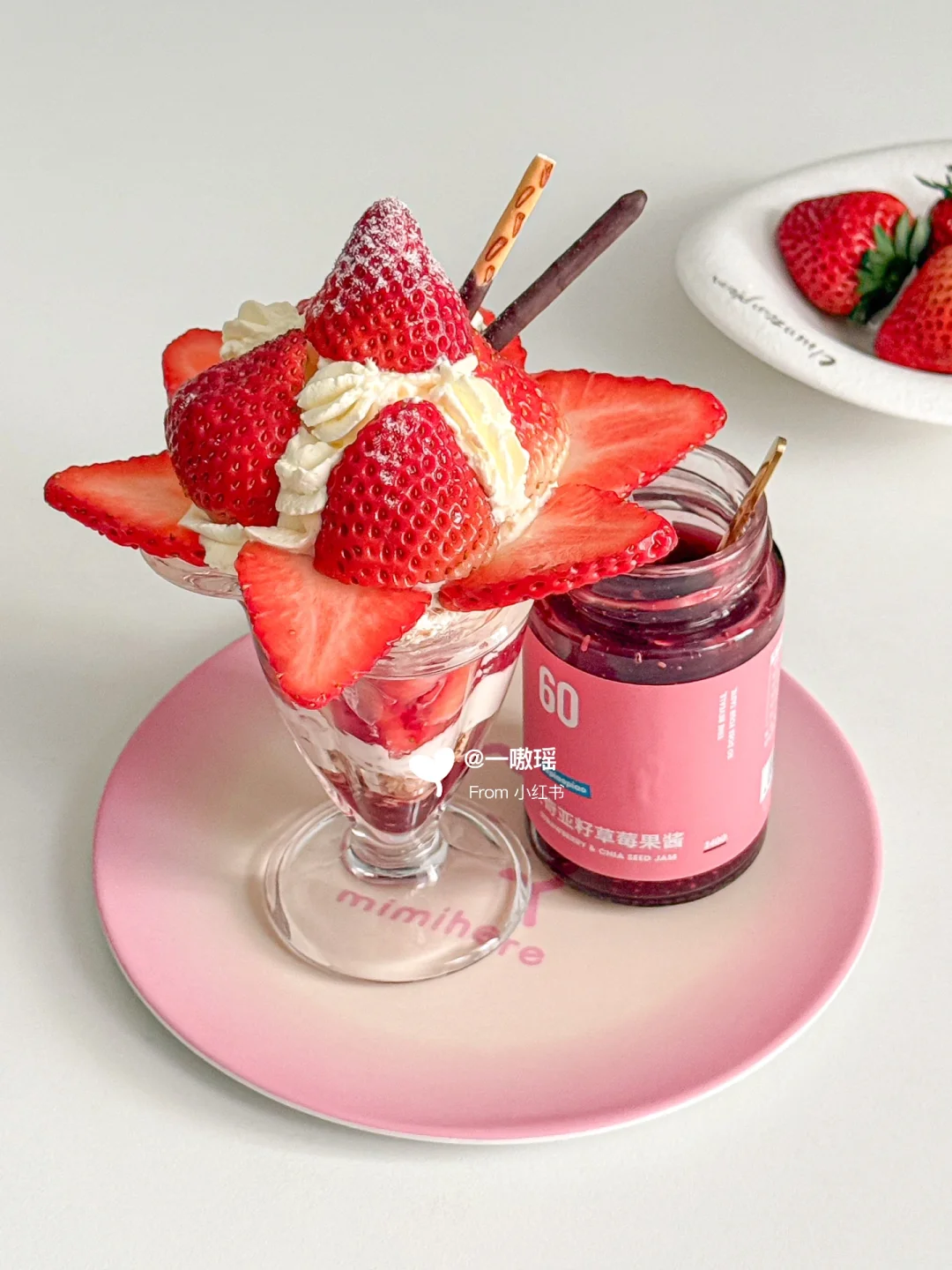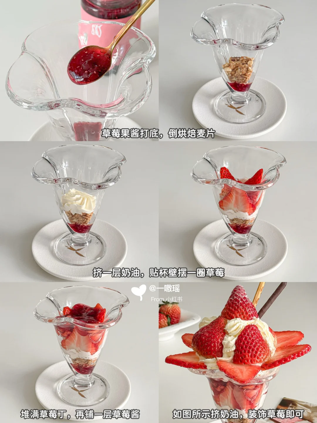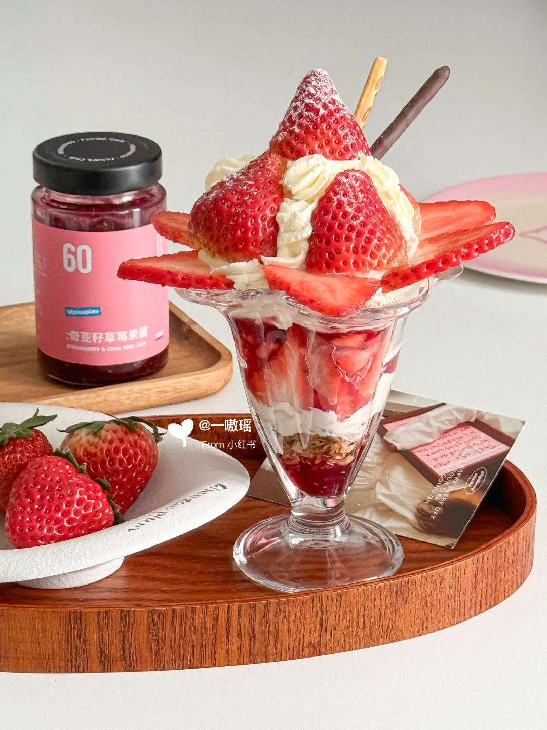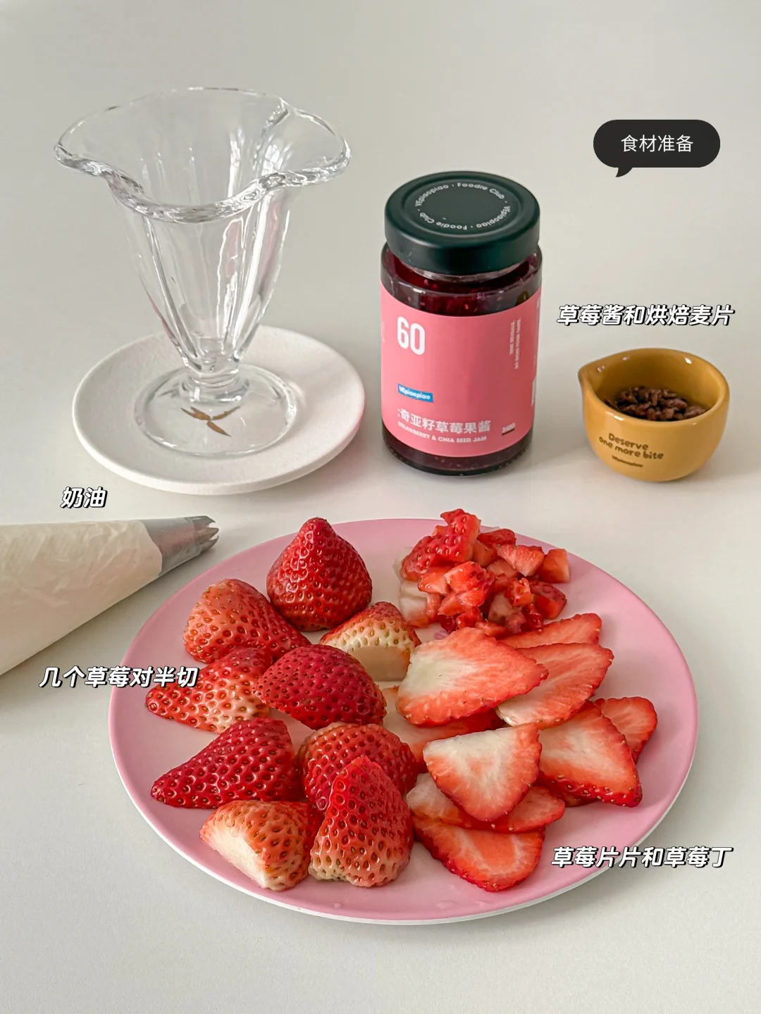 超级简单快手,简单的组合过程也幸福感满满 还原了古早草莓芭菲的模样🍧 在最底层和中部加了奇亚籽草莓果酱 没有白砂糖吃起来更安心😌 奇亚籽的添加让果酱吃起来像草莓软糖🍓 每一口都惊喜满满!✨ - 🛒食材 草莓|160g淡奶油+18g糖打发|烘焙麦片|草莓酱 · 👩🏻🍳做法 ▫️草莓洗净用厨房纸巾擦干水分 ▫️草莓果酱打底,倒烘焙麦片 ▫️挤一层奶油,贴杯壁摆一圈草莓 ▫️堆满草莓丁,再铺一层草莓酱 ▫️如图所示挤奶油,装饰草莓即可