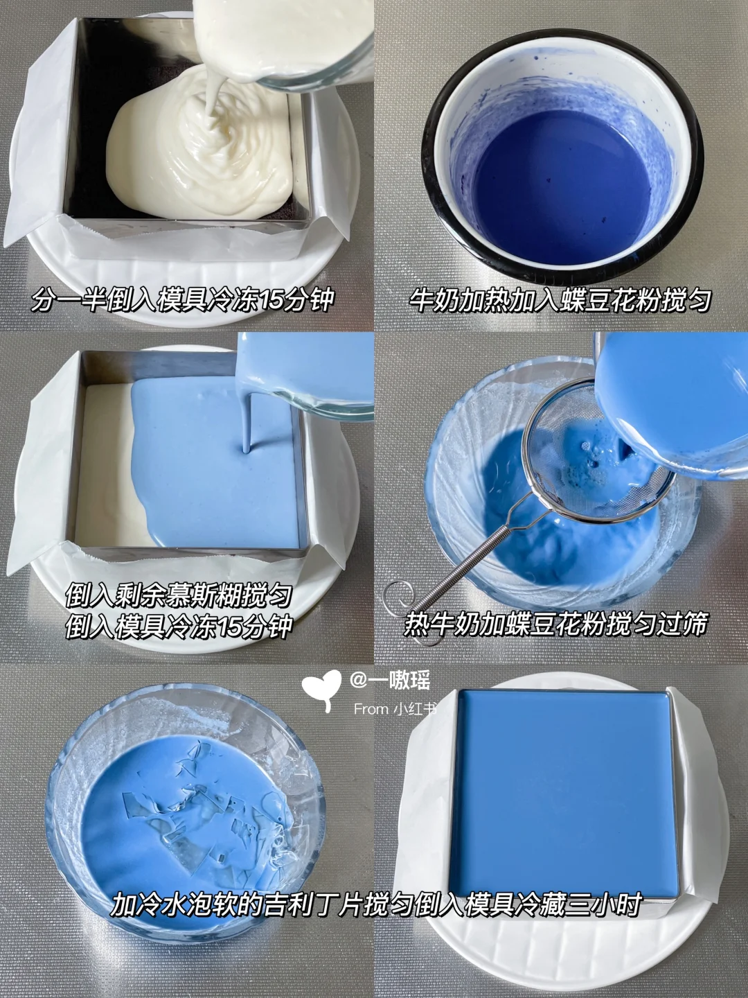 牛奶80g|蝶豆花粉2g|吉利丁片5g|糖3g