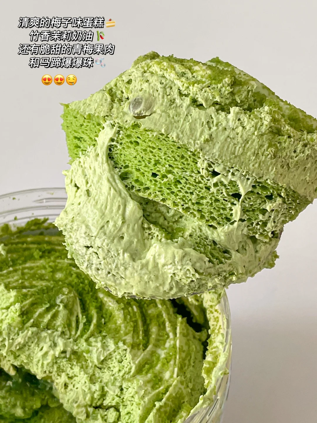 清爽的梅子味蛋糕混合竹香茉莉奶油,馥郁甘柔,微微酸甜,里面还有马蹄爆爆珠和脆甜的青梅果肉!很久没有吃到这么清新特别的甜品了🥹