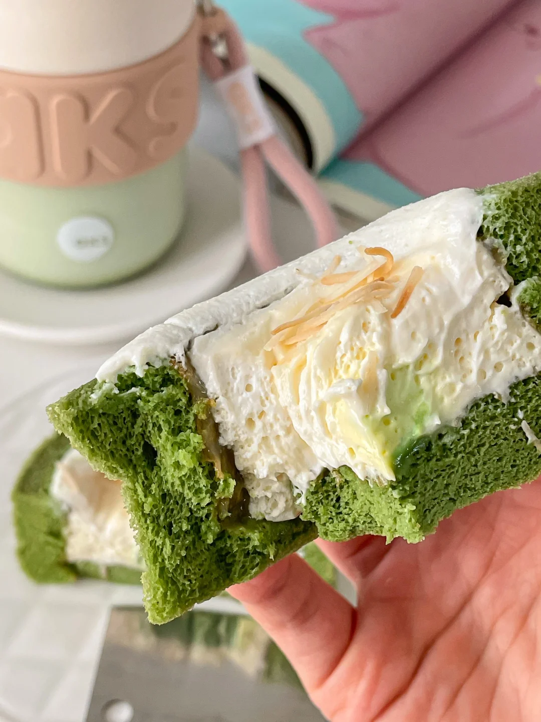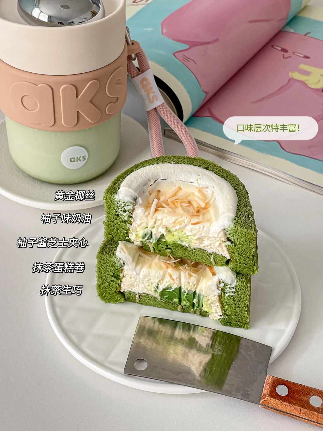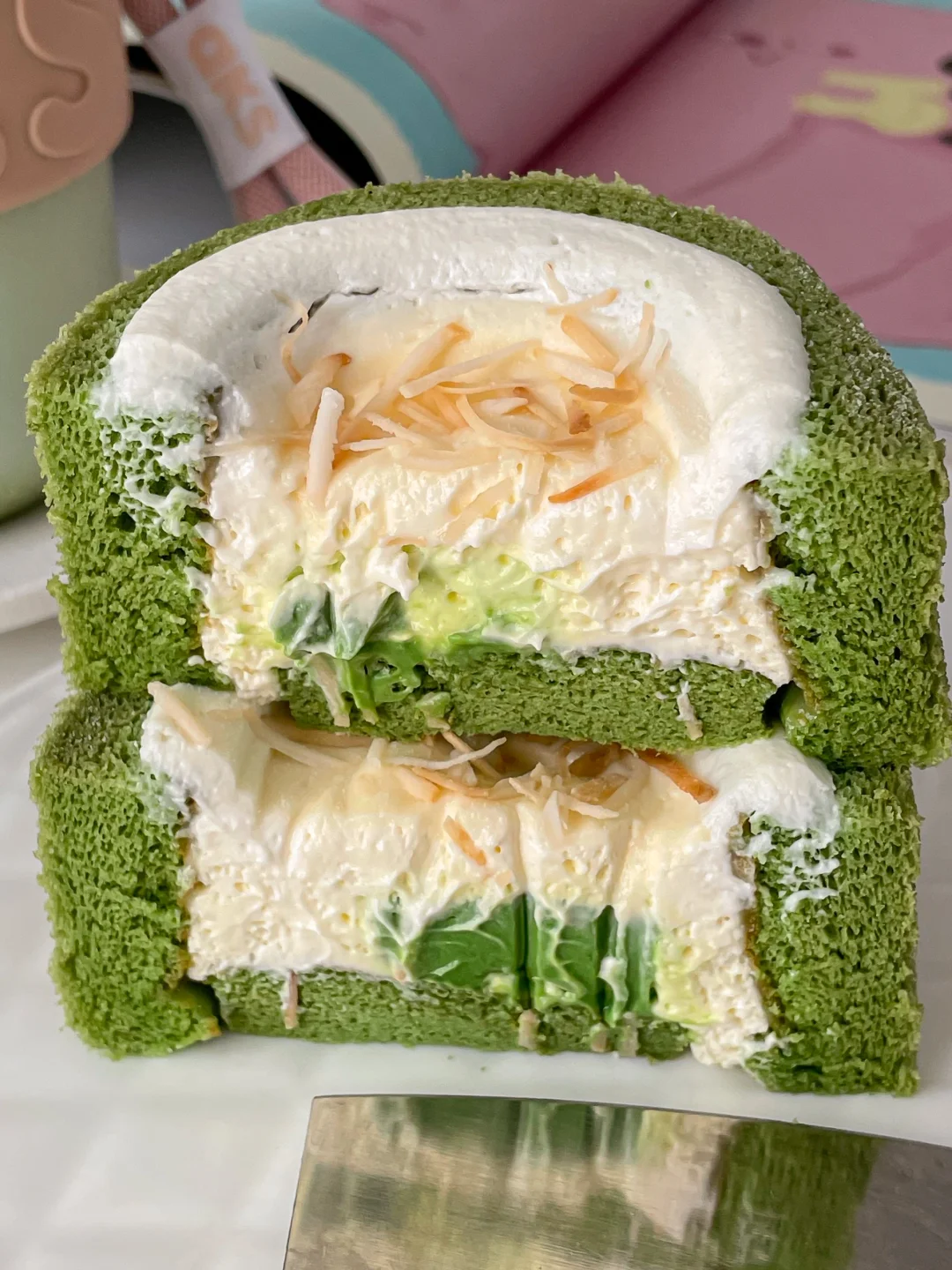 抹茶蛋糕体蓬松湿软,酸酸甜甜的柚子味奶油很清爽,中间还有几块抹茶生巧夹心💚