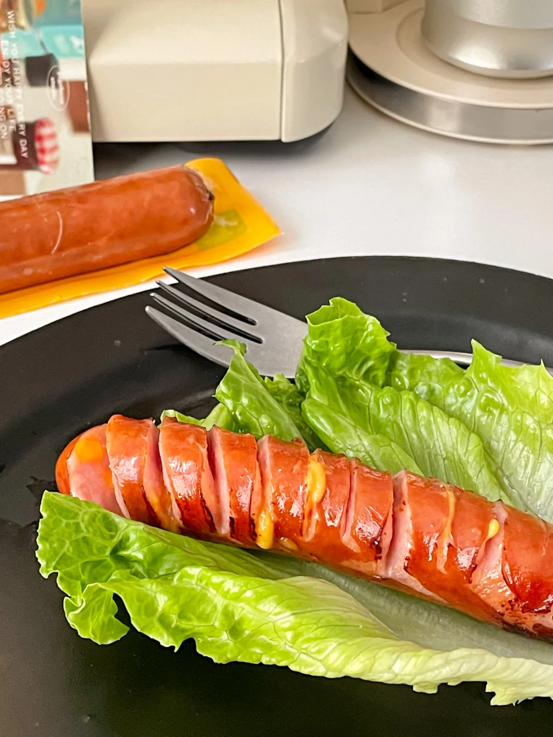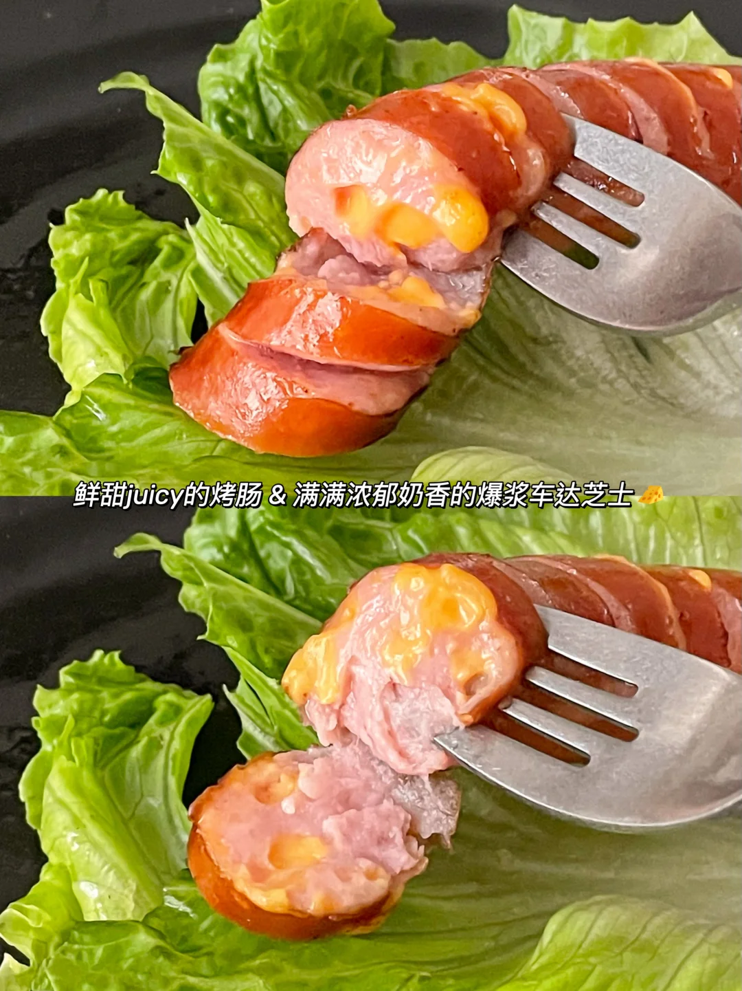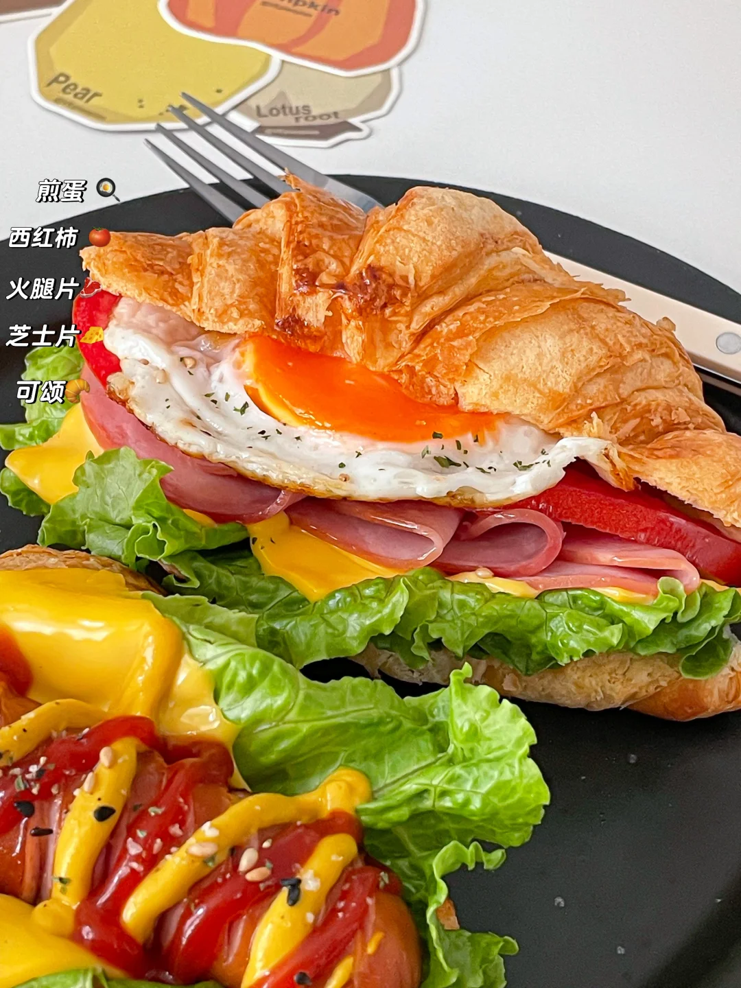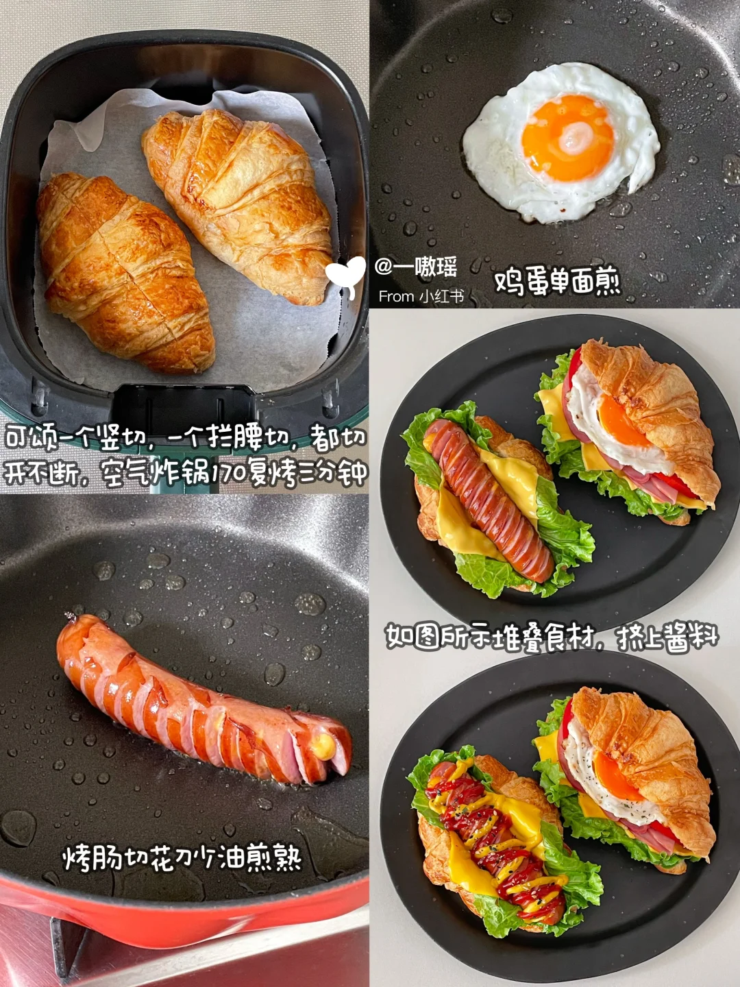 早午餐就要简单!快手!营养全! 可颂烤肠三明治🍽️经典搭配百吃不腻🌭赶快来抄作业 - 🛒食材 可颂|车达芝士肠|火腿片|芝士片|西红柿|生菜|鸡蛋|番茄酱|芥末酱 👩🏻🍳做法 ▫️可颂一个竖切,一个拦腰切,都切开不切断,空气炸锅170复烤三分钟 ▫️芝士肠切花刀少油煎熟 ▫️鸡蛋单面煎 ▫️如图所示堆叠食材,撒欧芹碎,挤上酱料 - 🍴今天的快乐是芝士肠给的😍鲜甜juicy的烤肠里满满浓郁奶香的爆浆车达芝士🧀 直接吃或者做成三明治🥪都很八错!!