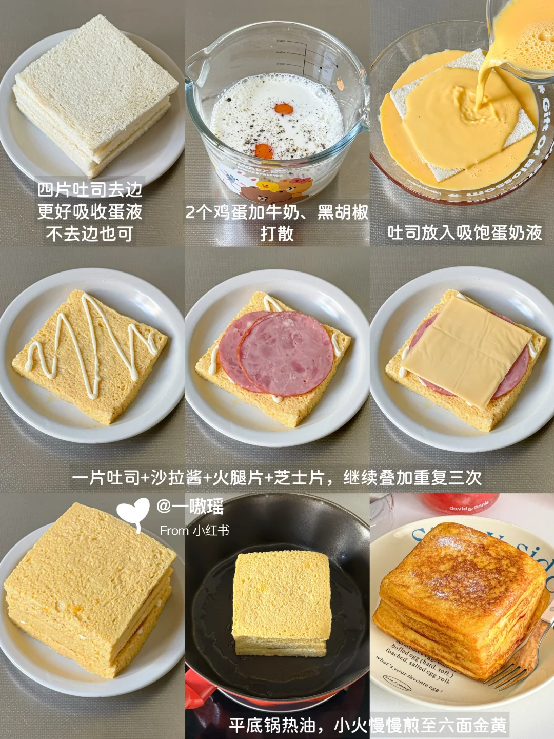 ▫️一片吐司+沙拉酱+火腿片+芝士片,重复三次