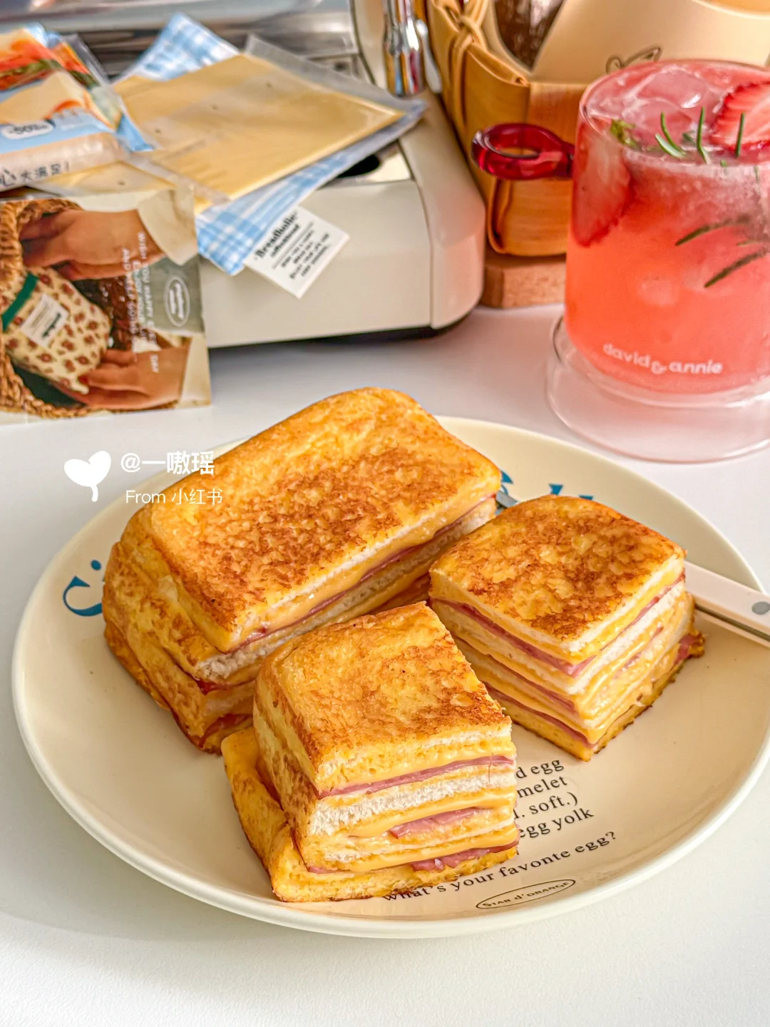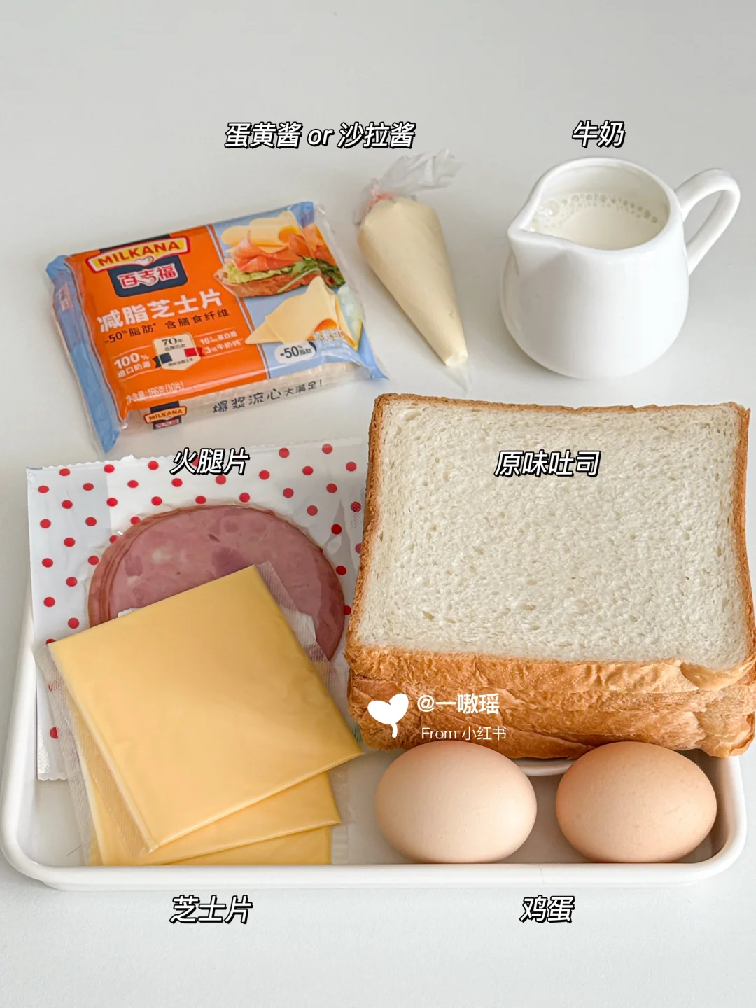 吐司4片|火腿6片|鸡蛋2个|百吉福减脂芝士片3片|牛奶100g左右|沙拉酱