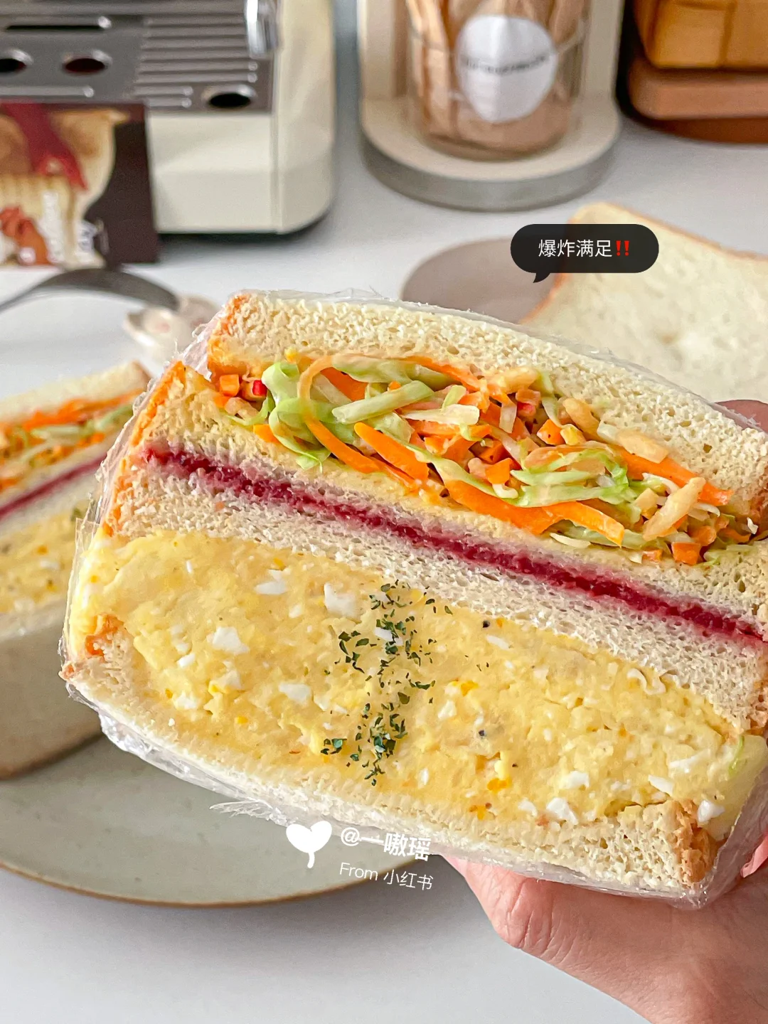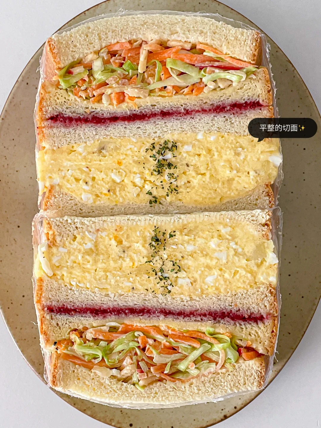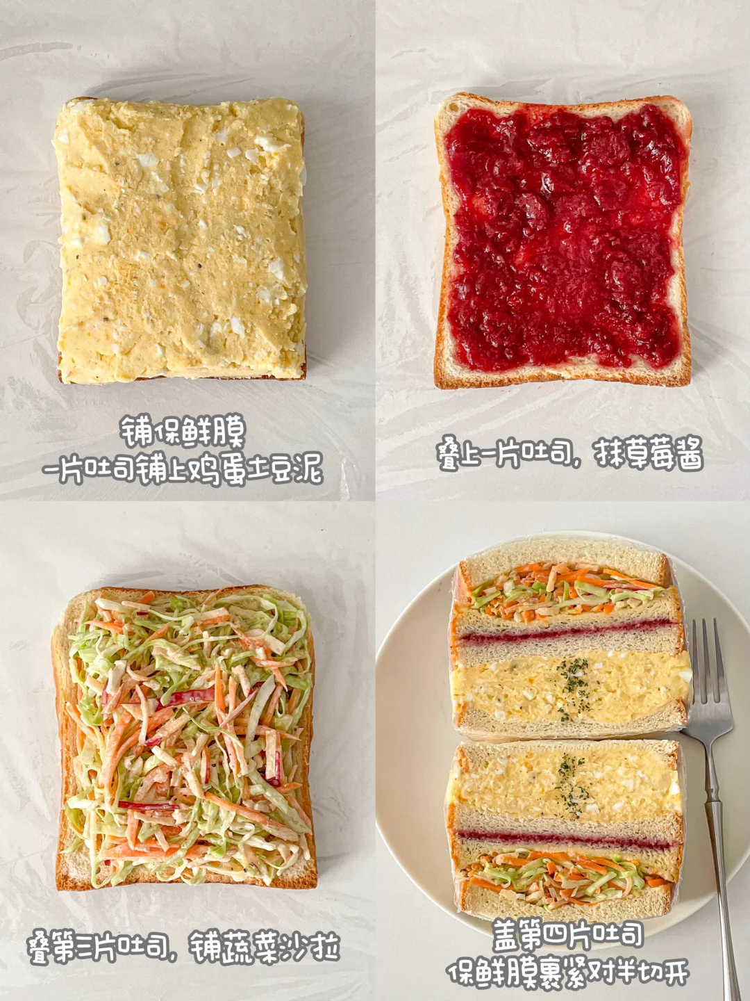 吃过就会念念不忘! 草莓酱和沙拉的结合太神奇了🍓🍞 超级清爽满足💥层次感强烈又丰富 - 🛒食材 吐司4片|土豆|鸡蛋|卷心菜|苹果|胡萝卜|草莓酱 🧂调味 沙拉酱|海盐|黑胡椒 👩🏻🍳做法 ▫️土豆、鸡蛋煮熟,加入调味压碎 ▫️卷心菜、胡萝卜、苹果切丝,加入调味拌沙拉 ▫️铺保鲜膜,一片吐司铺上鸡蛋土豆泥 ▫️叠上一片吐司,抹草莓酱 ▫️叠第三片吐司,铺蔬菜沙拉 ▫️盖第四片吐司,保鲜膜裹紧对半切开