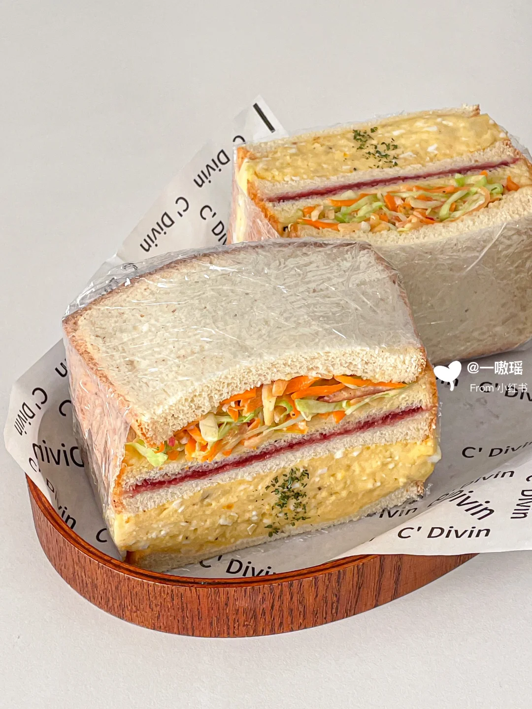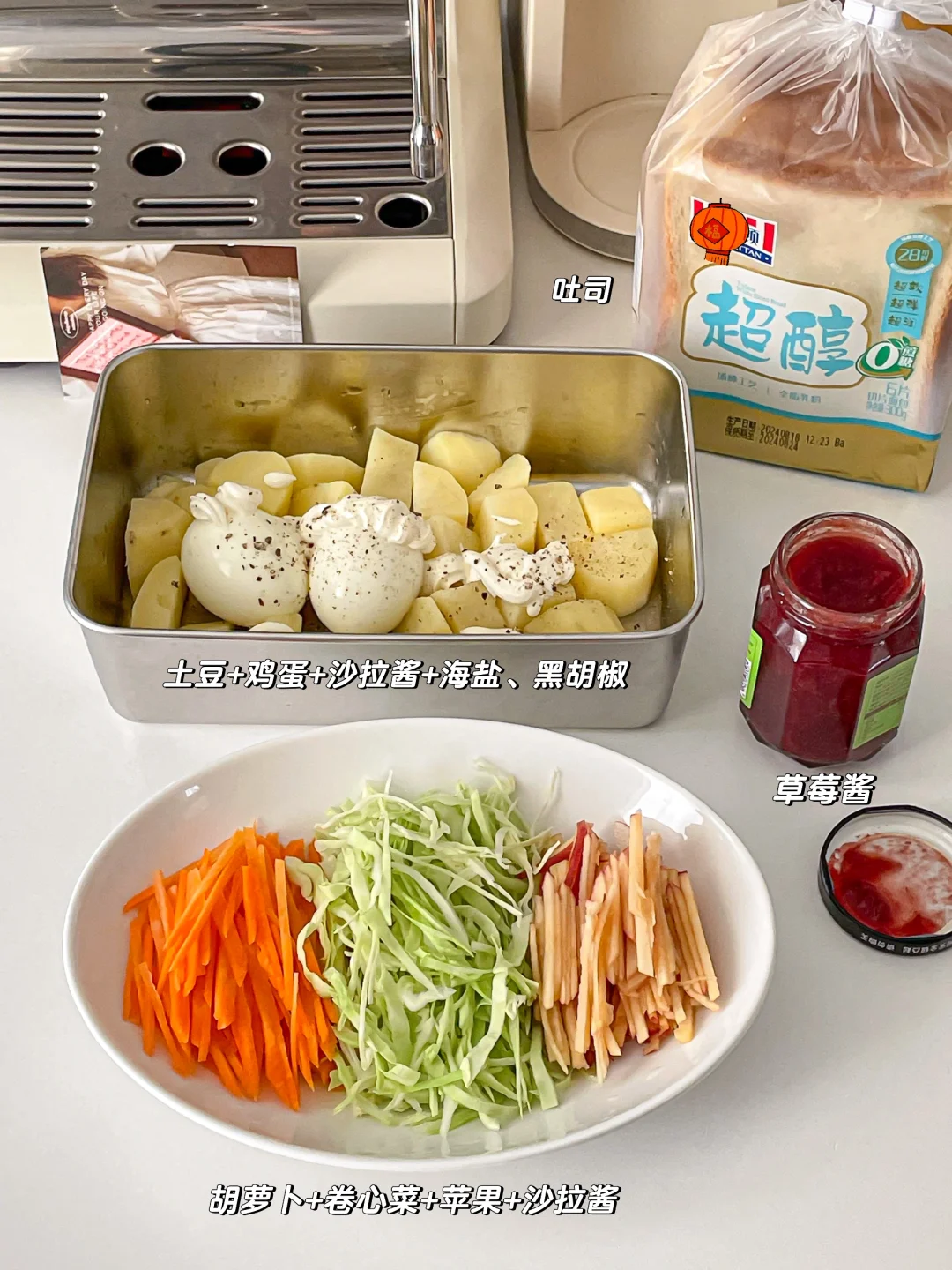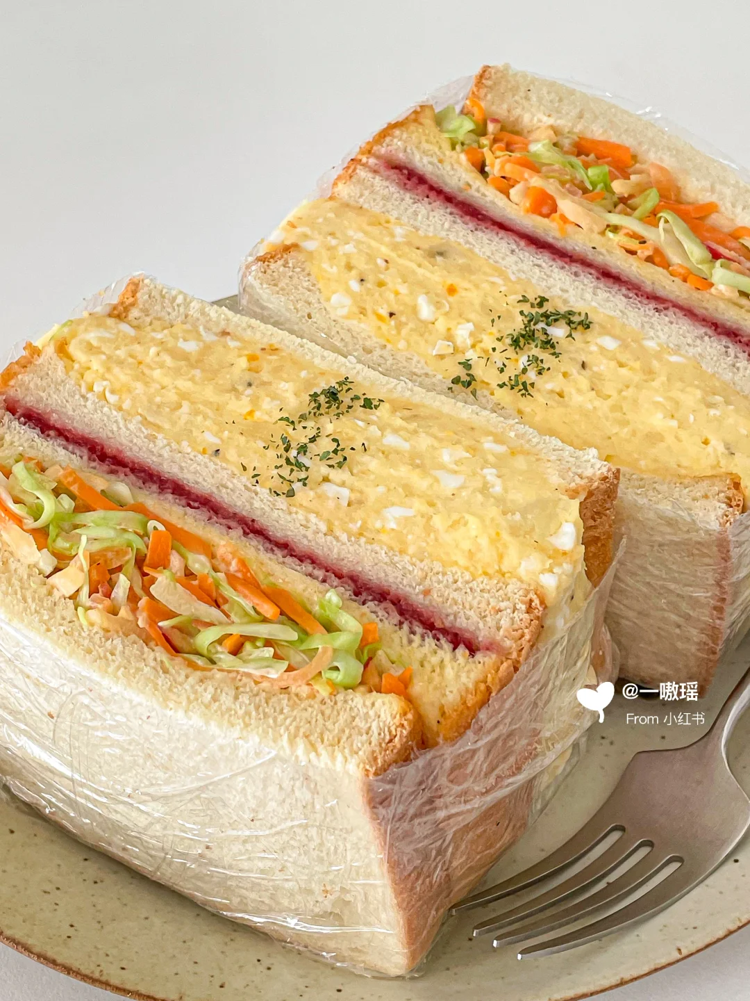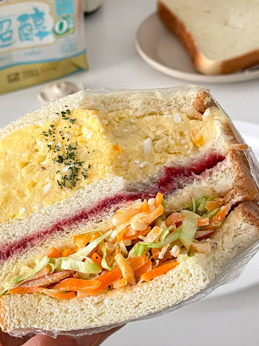 吃过就会念念不忘! 草莓酱和沙拉的结合太神奇了🍓🍞 超级清爽满足💥层次感强烈又丰富 - 🛒食材 吐司4片|土豆|鸡蛋|卷心菜|苹果|胡萝卜|草莓酱 🧂调味 沙拉酱|海盐|黑胡椒 👩🏻🍳做法 ▫️土豆、鸡蛋煮熟,加入调味压碎 ▫️卷心菜、胡萝卜、苹果切丝,加入调味拌沙拉 ▫️铺保鲜膜,一片吐司铺上鸡蛋土豆泥 ▫️叠上一片吐司,抹草莓酱 ▫️叠第三片吐司,铺蔬菜沙拉 ▫️盖第四片吐司,保鲜膜裹紧对半切开