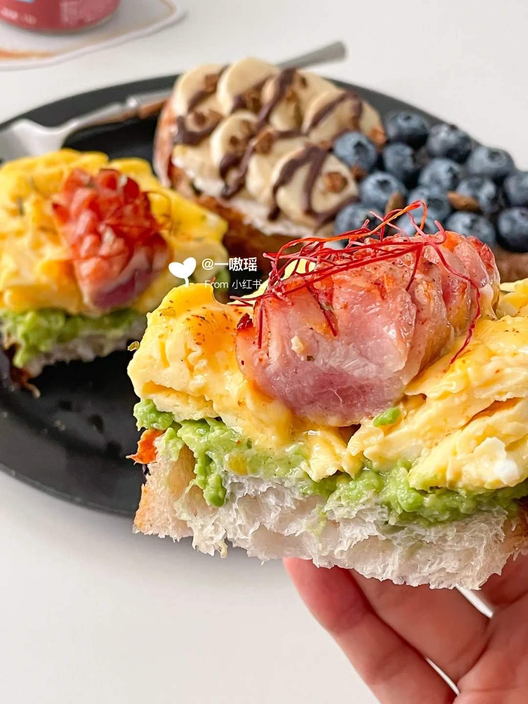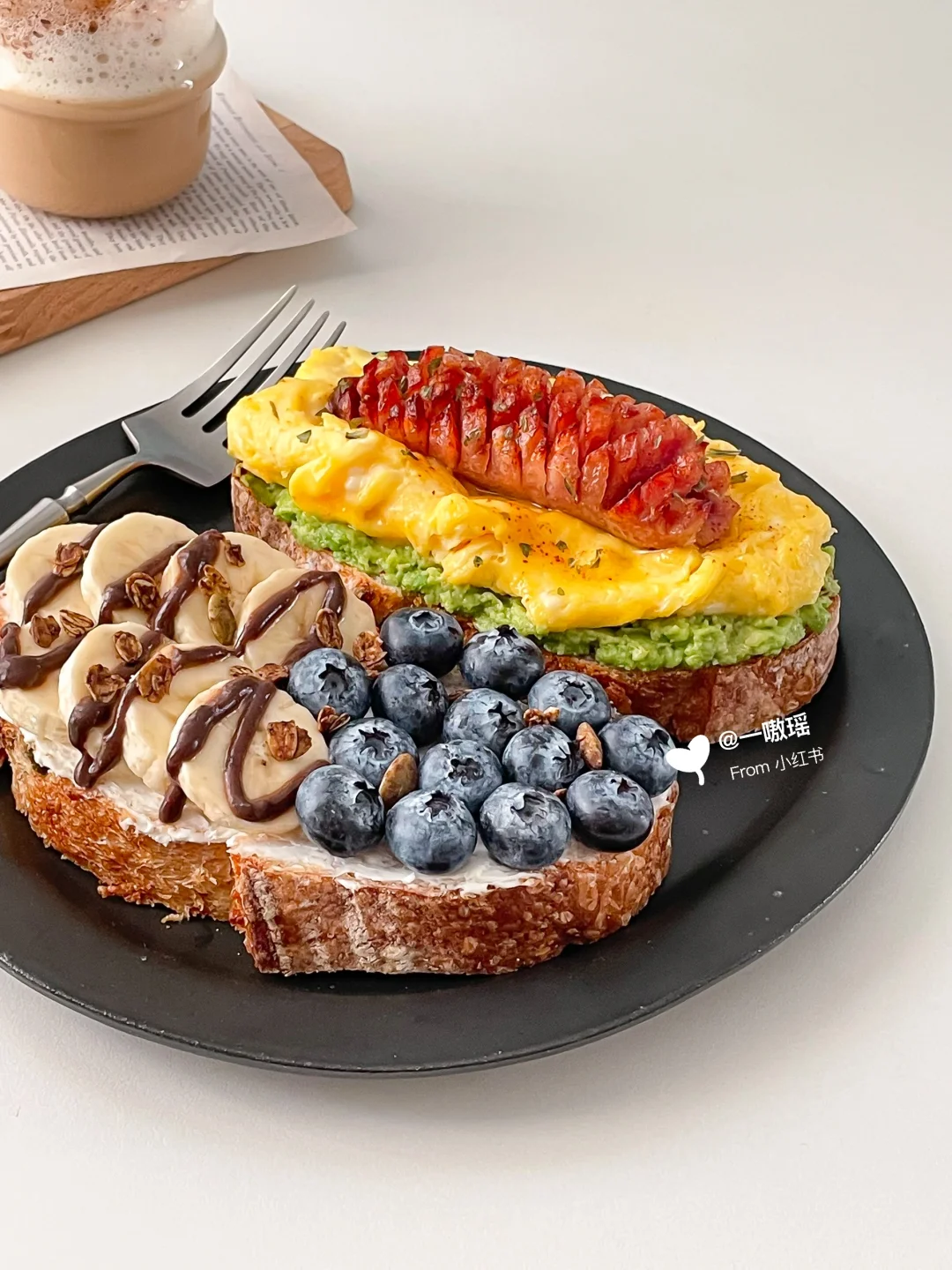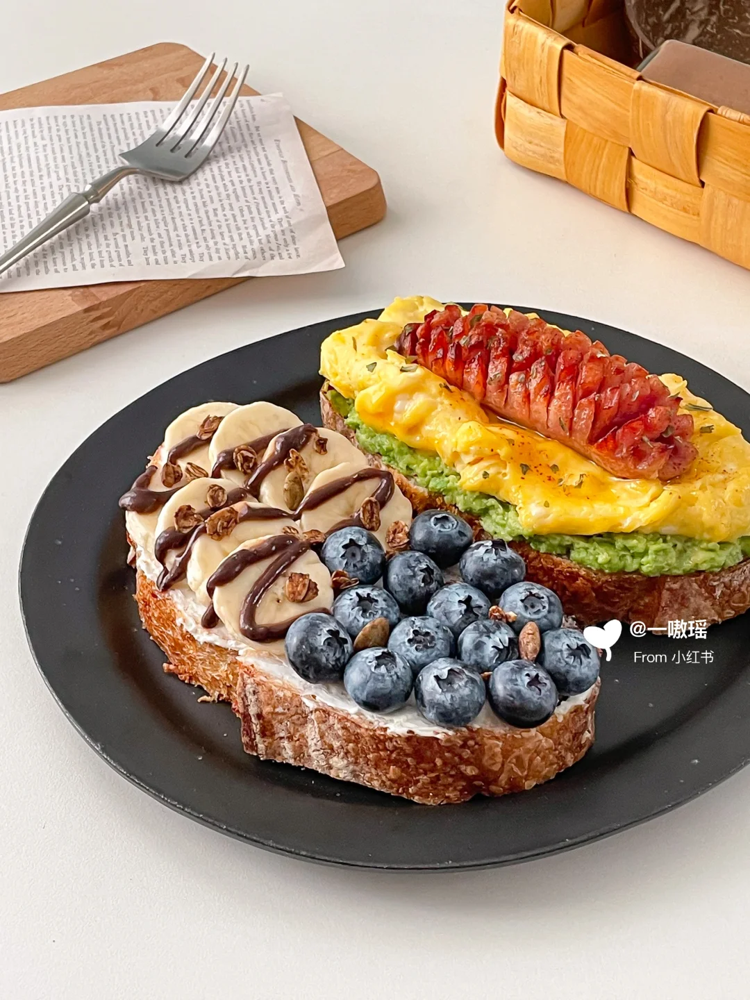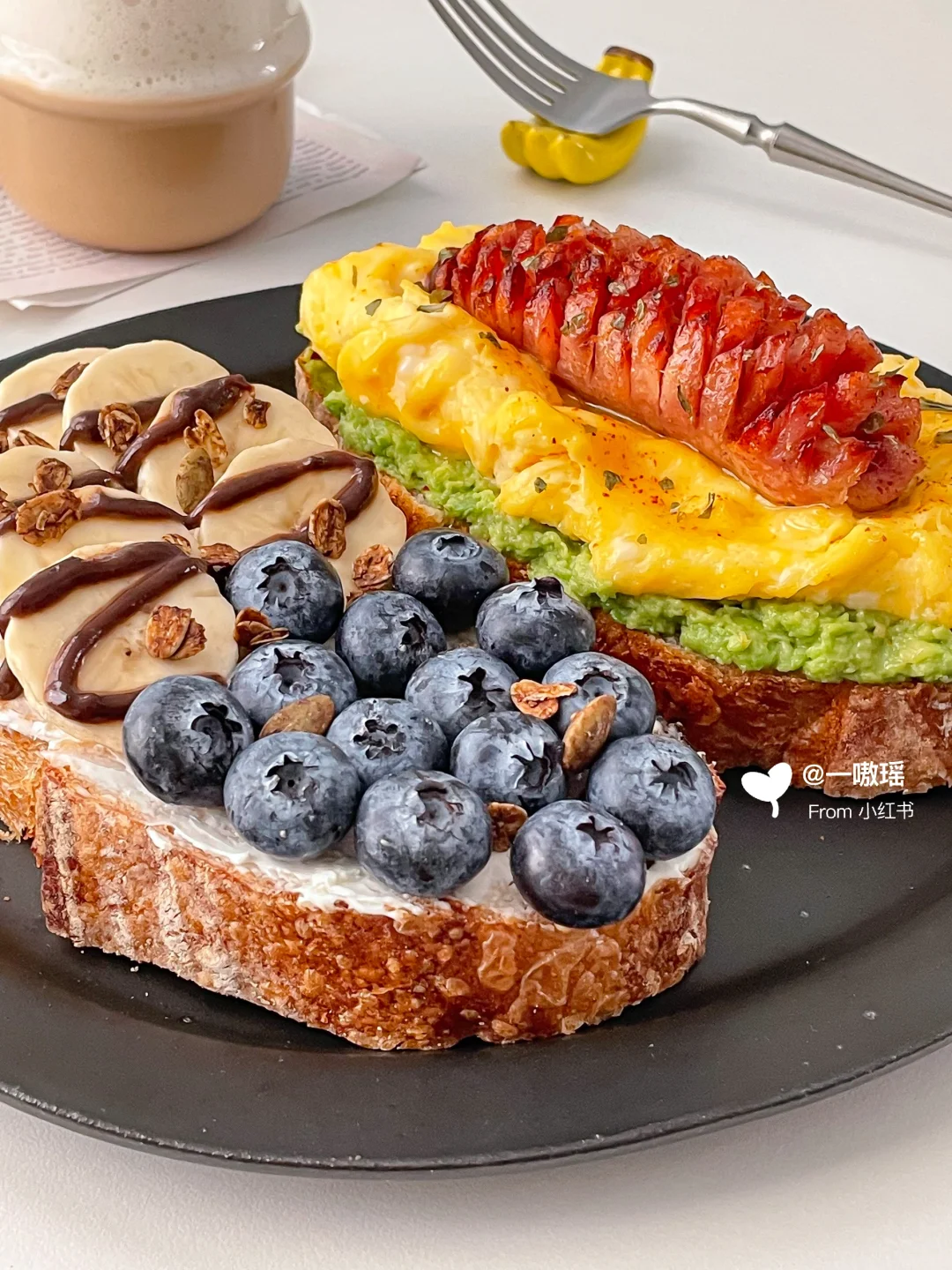 早餐就要简单!快手!营养全! 甜咸双拼开放式三明治请收下🥖 - 今日搭配公式 • :* 🌭🫐🍌🍳 🥑•:*・ ❶欧包+牛油果+滑蛋+烤肠 ❷欧包+抹奶酪+香蕉+蓝莓 👩🏻🍳做法 ▫️牛油果压成泥 ▫️烤肠切花刀煎熟或烤熟 ▫️两个鸡蛋打散(加20g牛奶口感更嫩)做滑蛋 ▫️食材如图依次堆叠起来 ▫️另一片欧包抹一层奶酪 ▫️放香蕉片和蓝莓,香蕉上淋巧克力酱